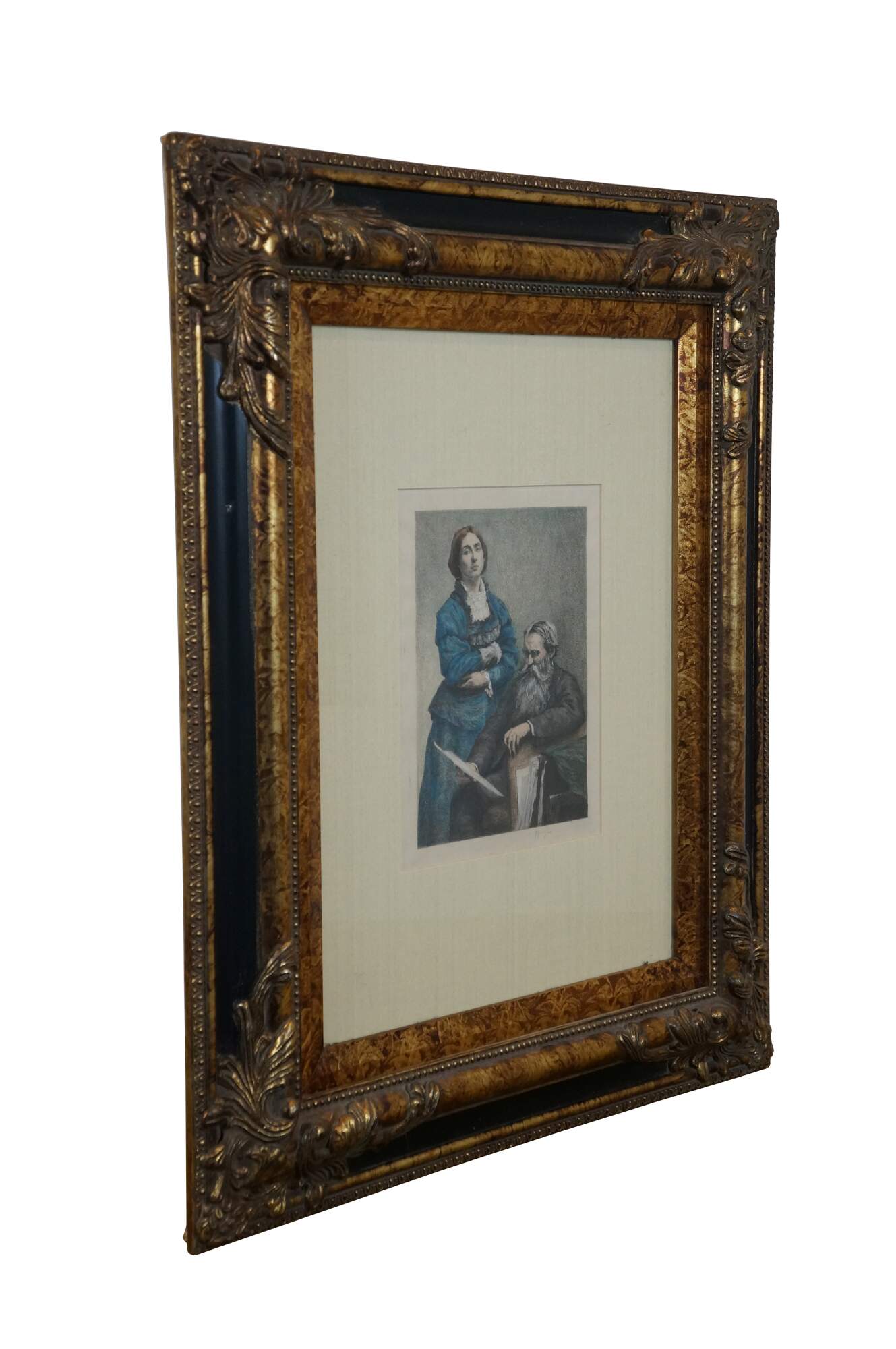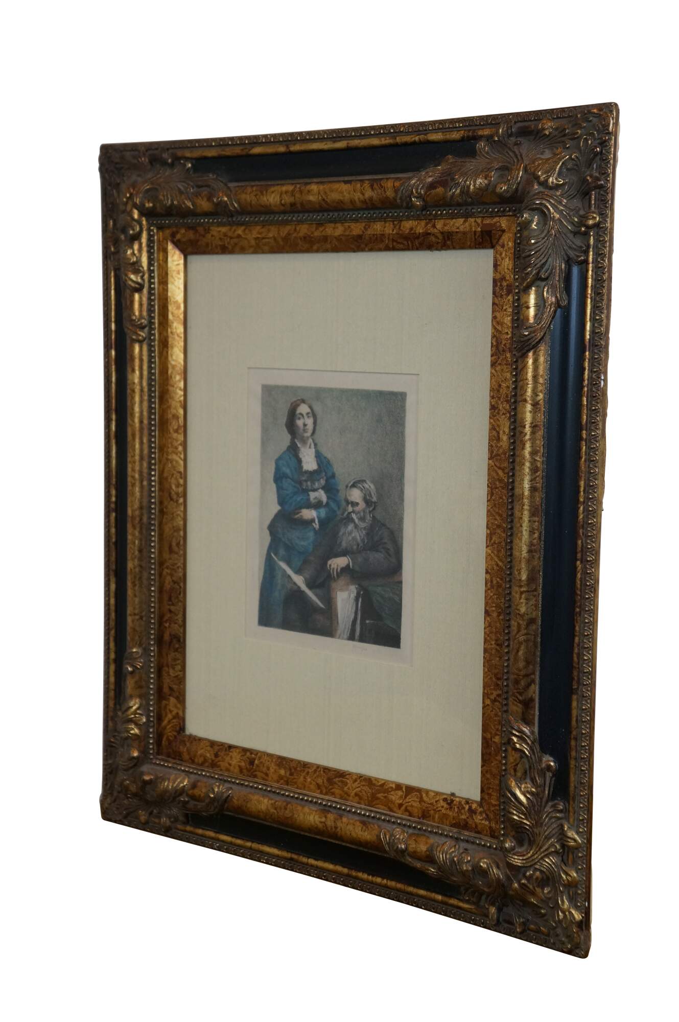 Antique late 19th century hand colored etching of a Portrait of Mr and Mrs Edwin Edwards, engraved by Louis Monzies after a painting by Henri Fantin; taken from the 1883 portfolio "L'Art." Carved gilt wood frame with acanthus leaf corners and black painted bevel; no mat.