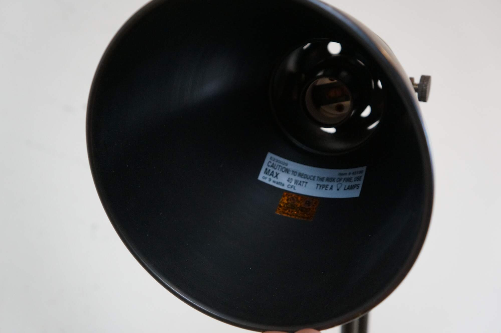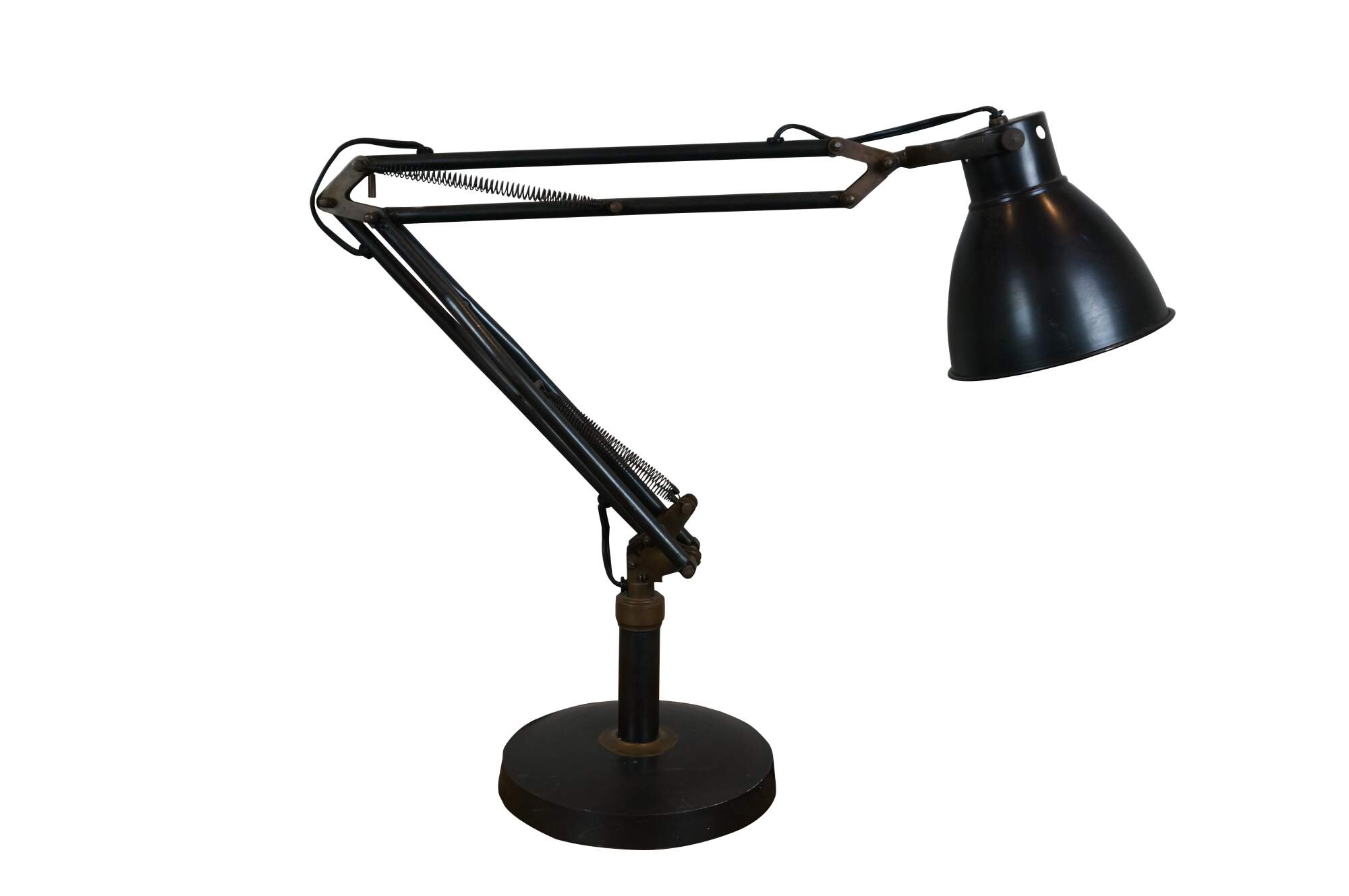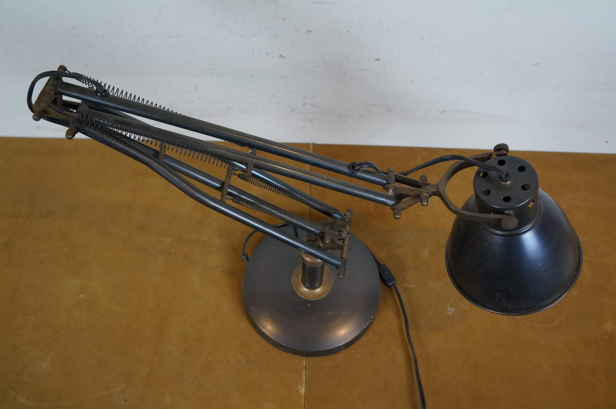 Late 20th century black metal and brass architects desk / table lamp with articulated spring swing arm and round base.