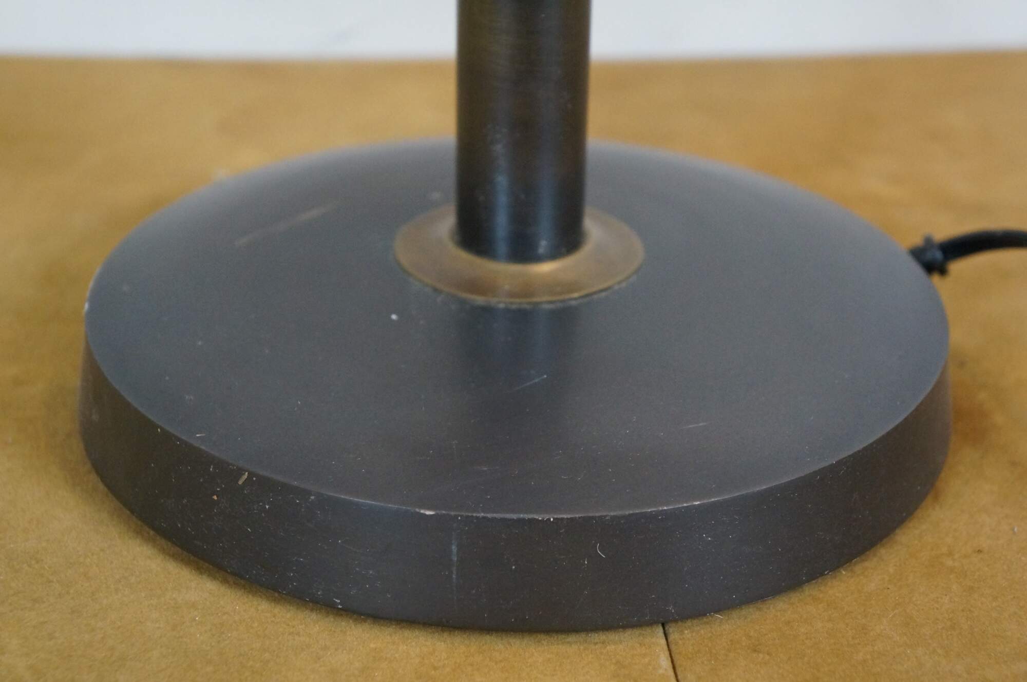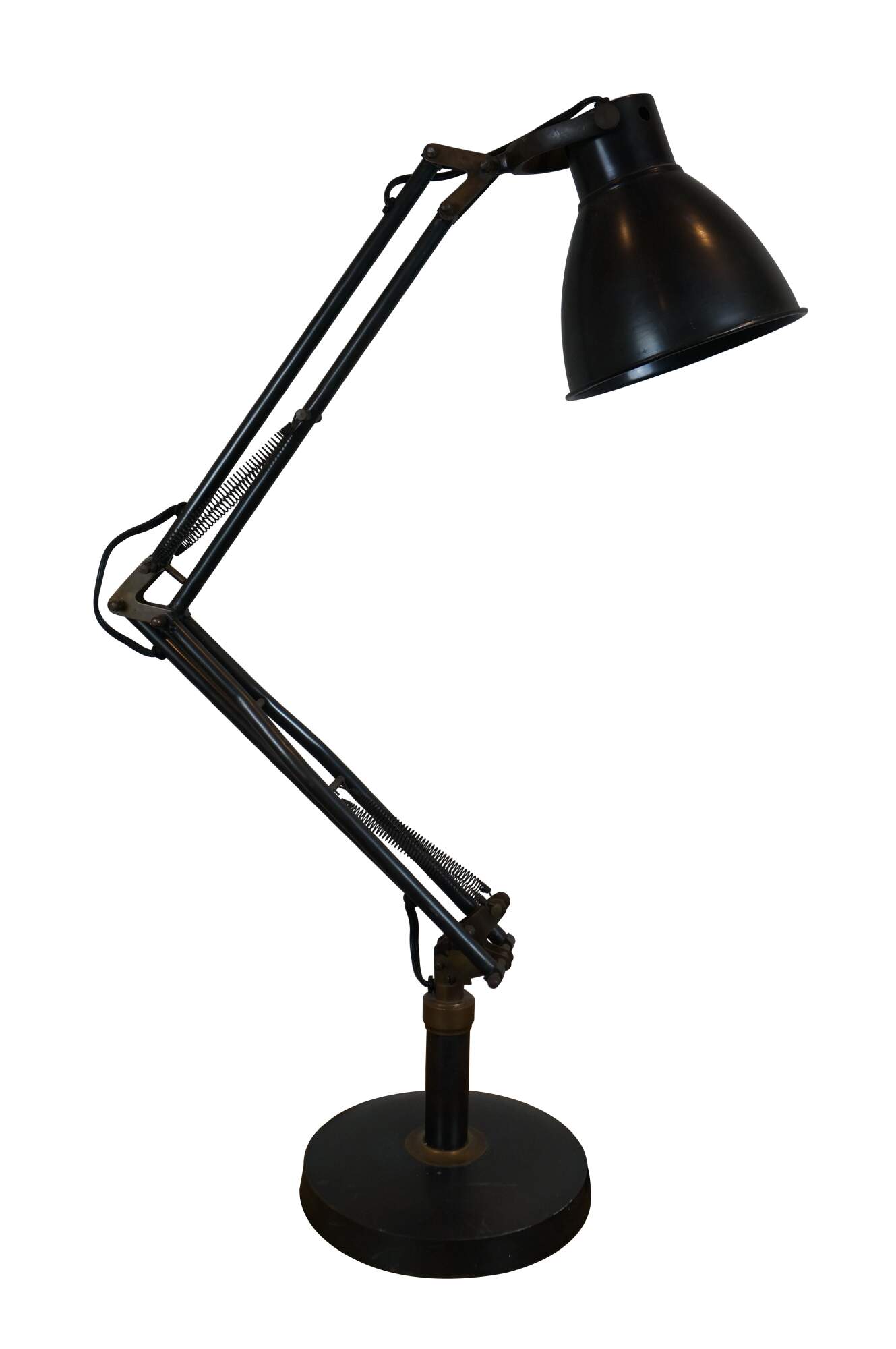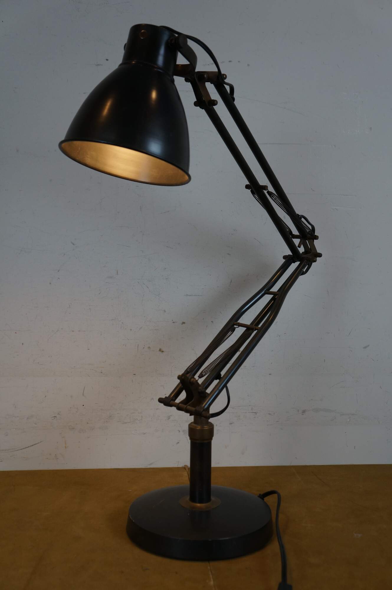Late 20th century black metal and brass architects desk / table lamp with articulated spring swing arm and round base.