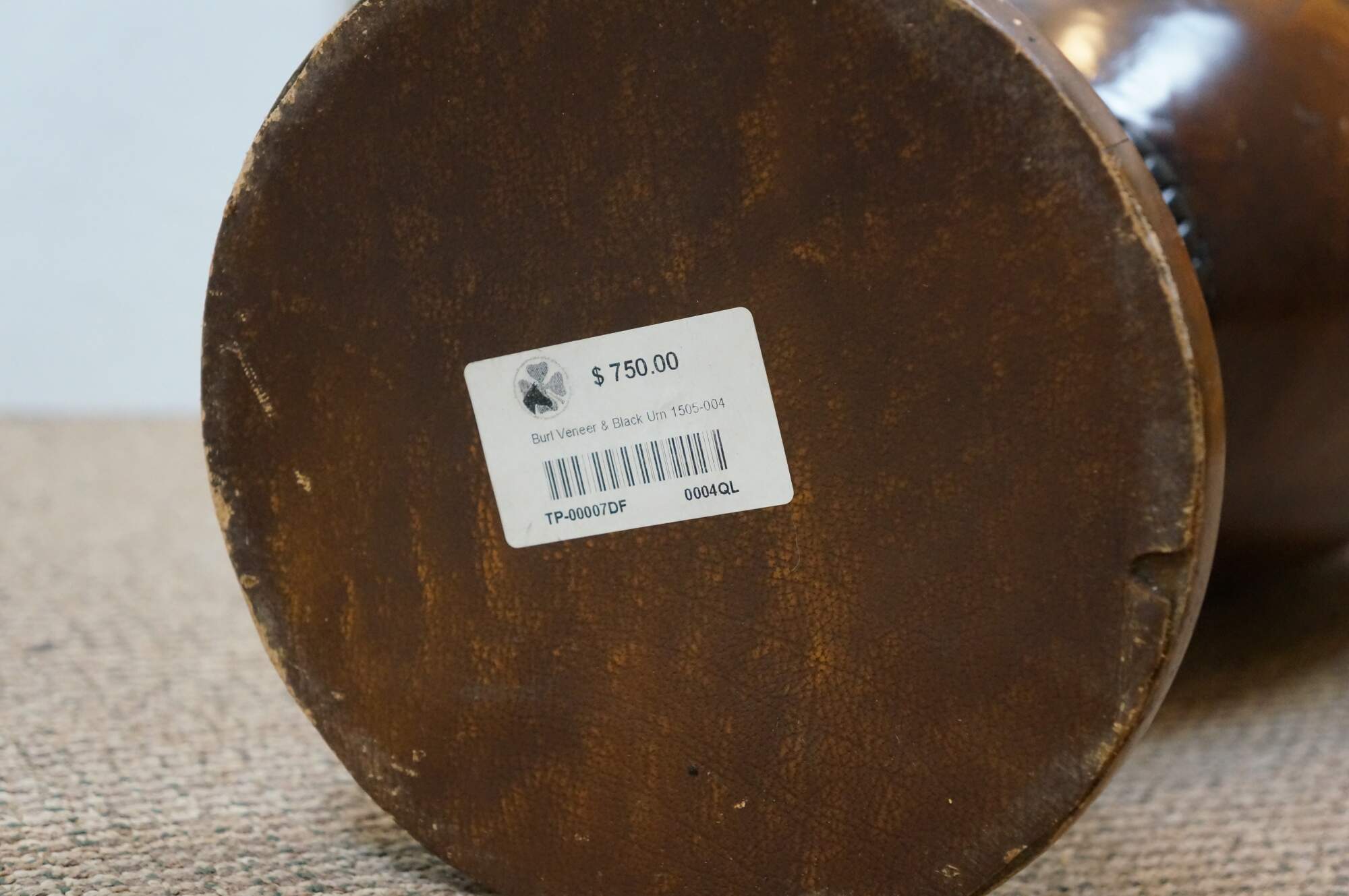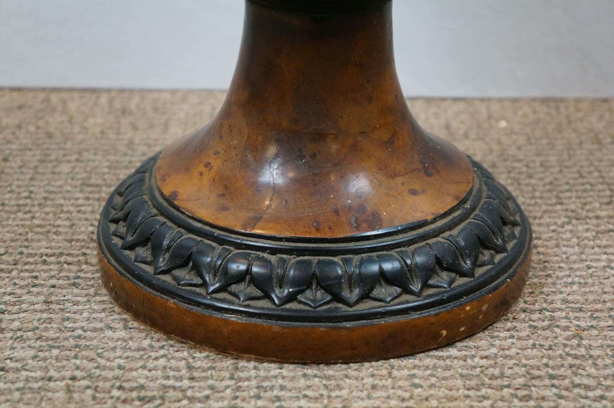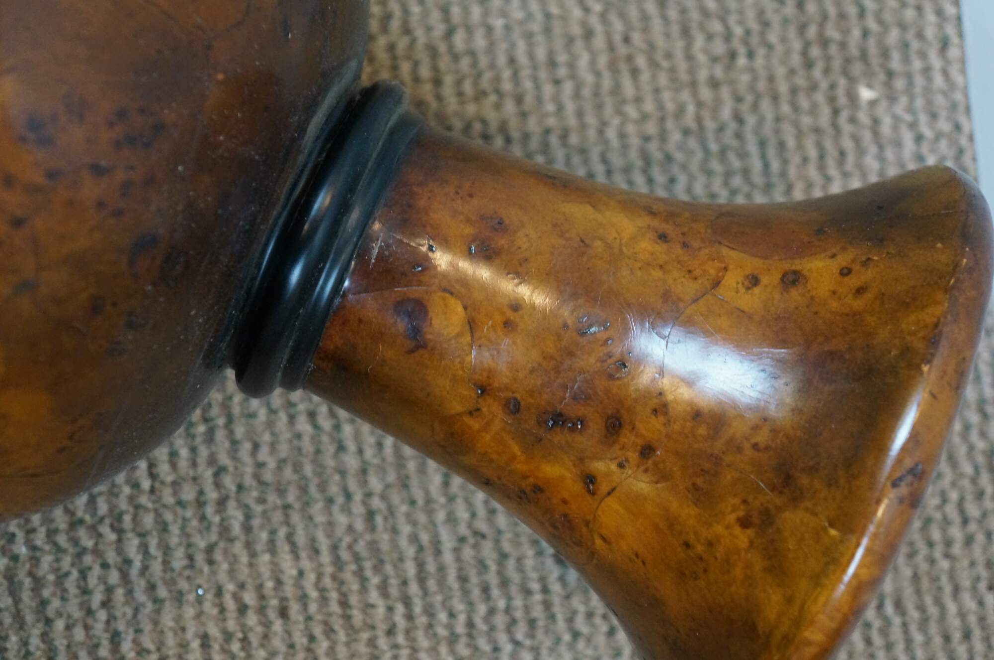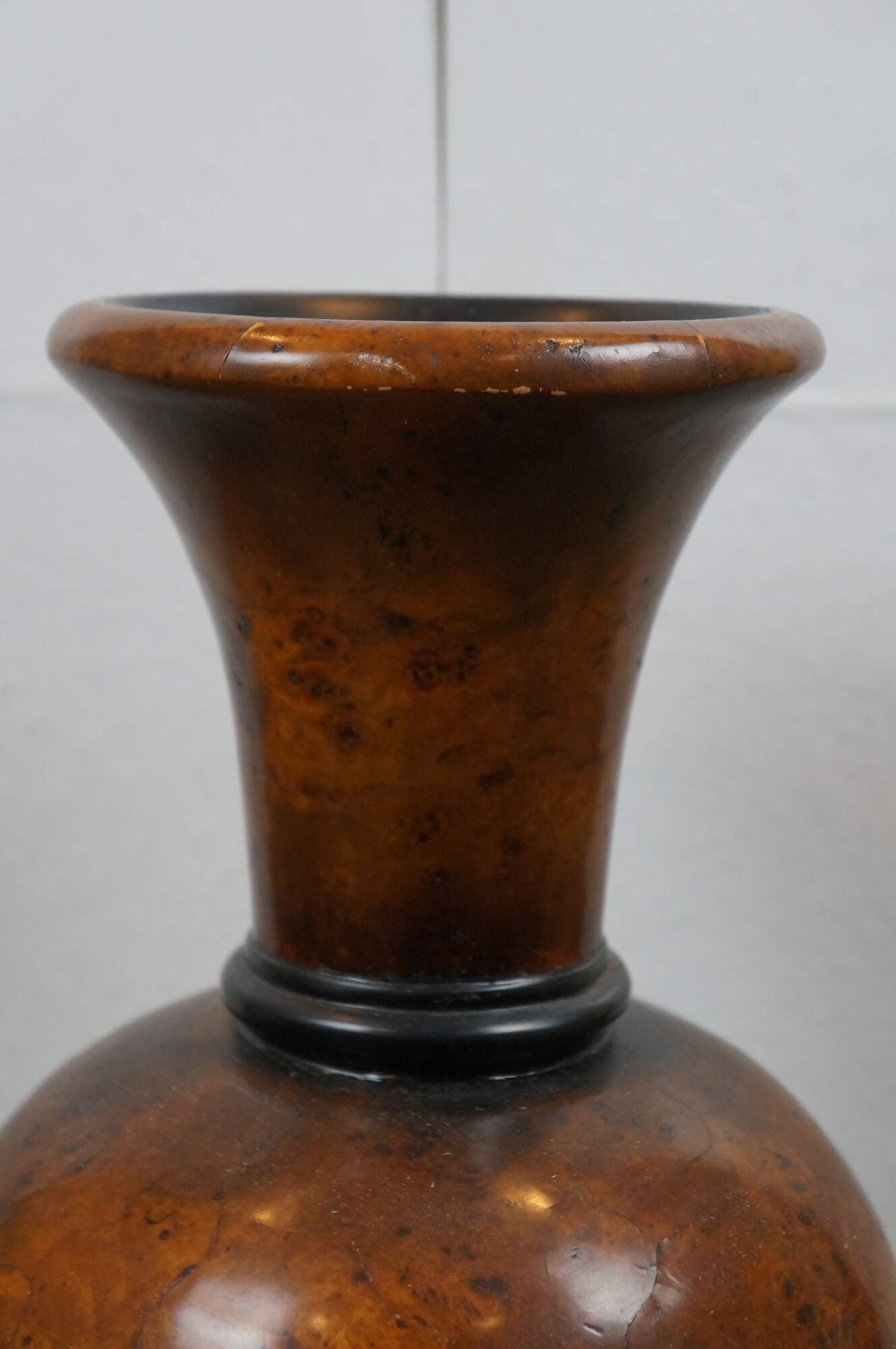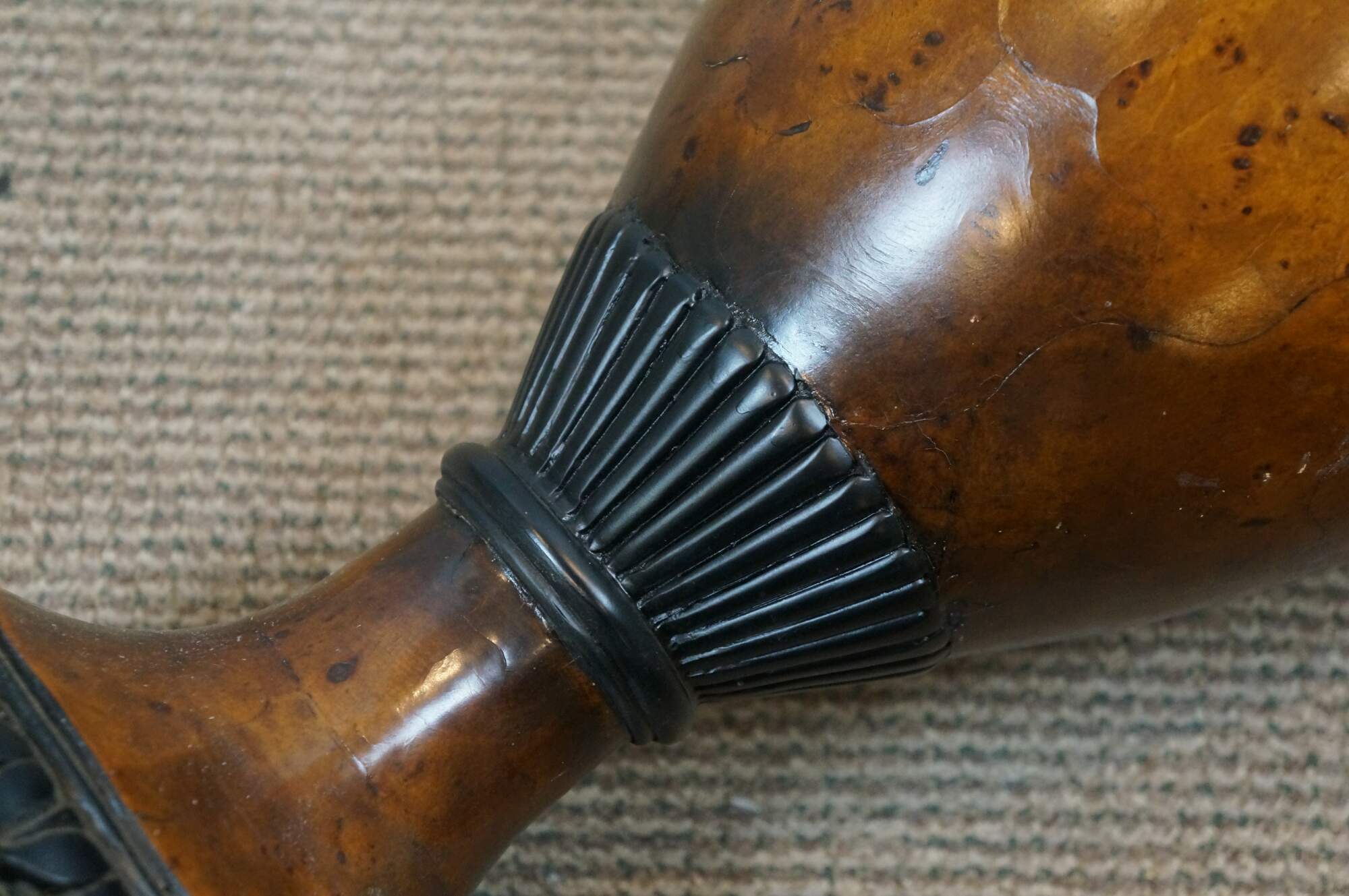 Late 20th century burl wood veneer floor vase / urn with ebonized details and leaf carved border. Leather padded base.