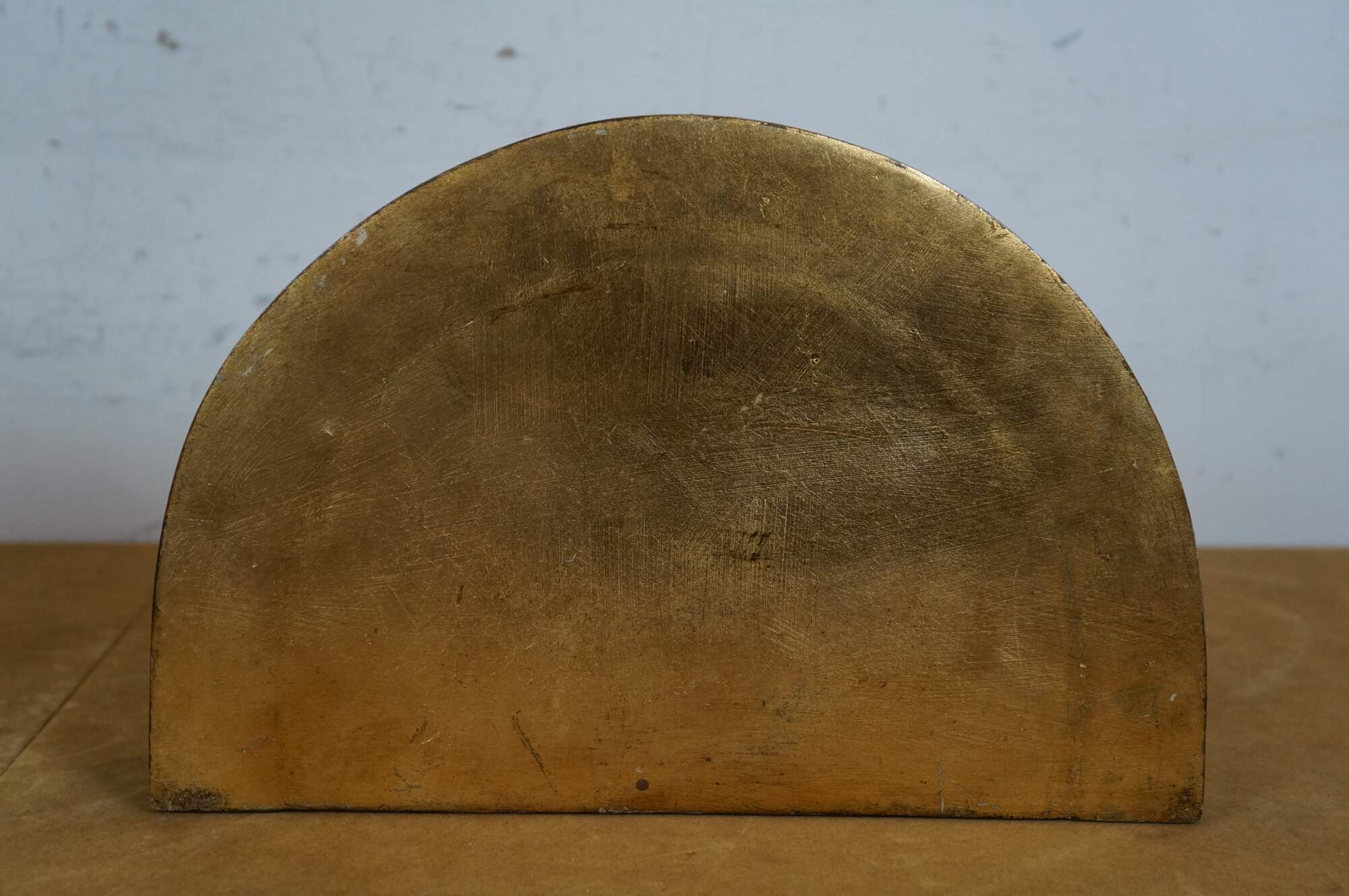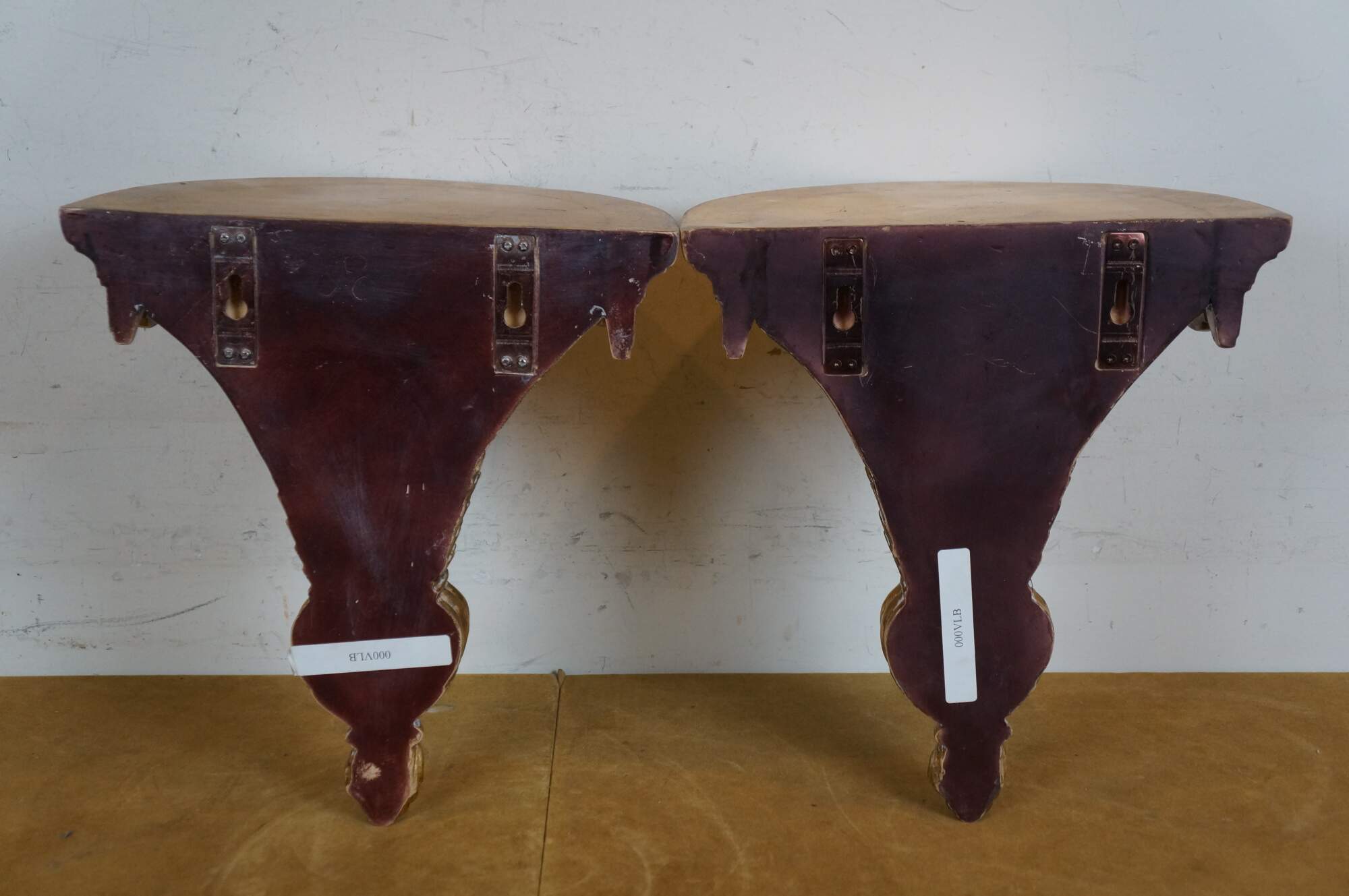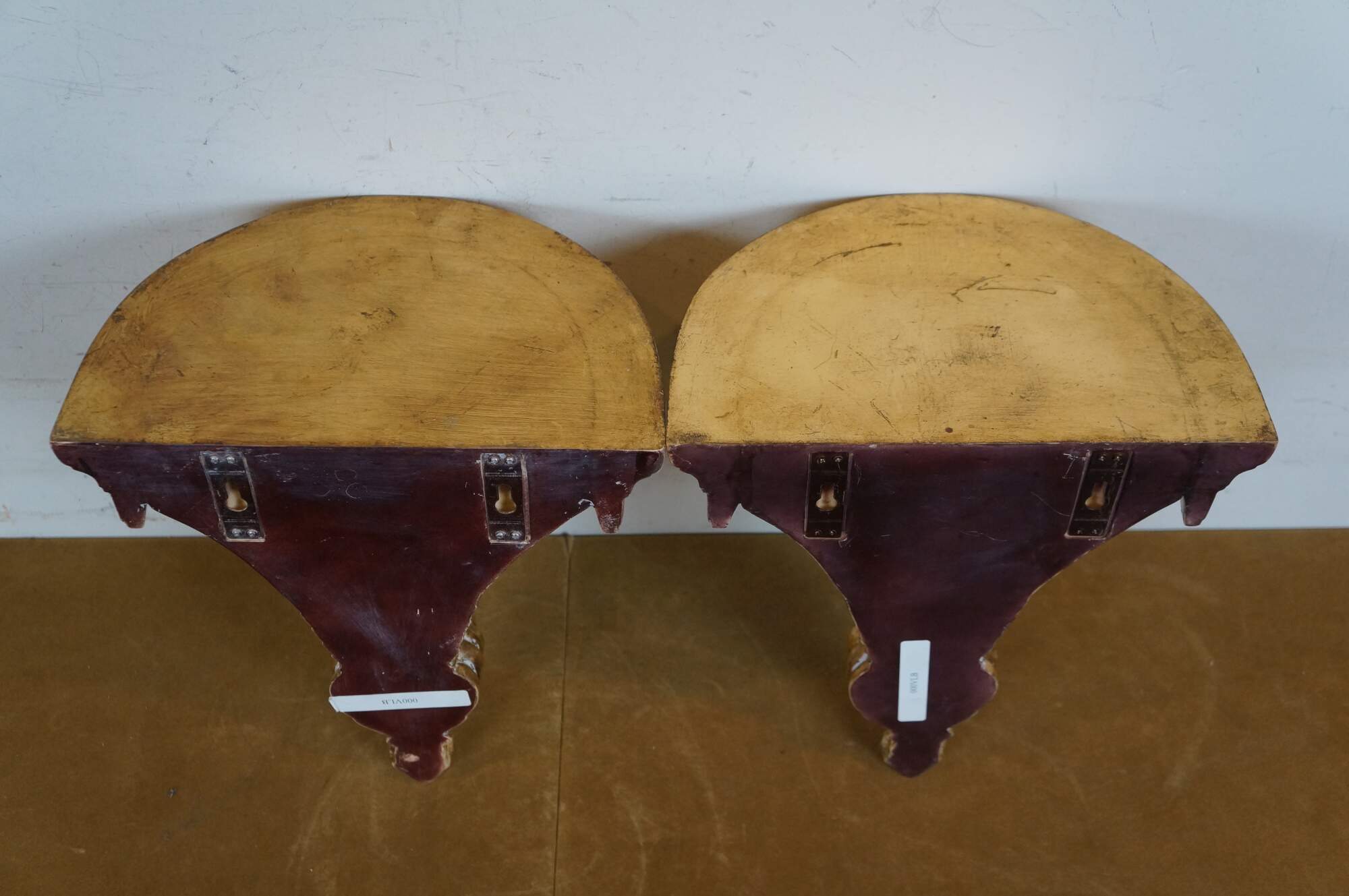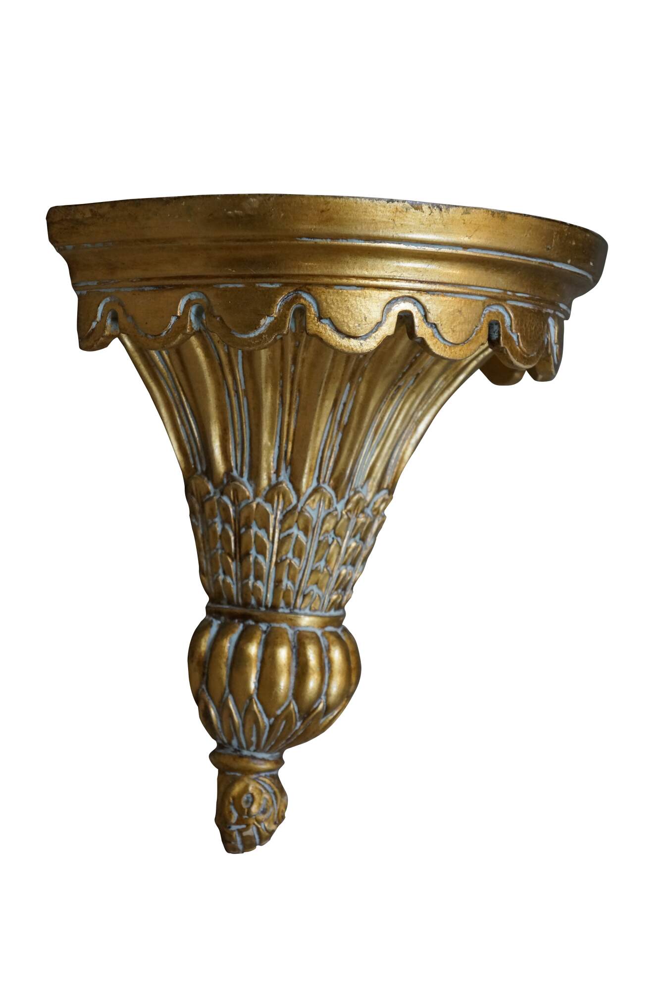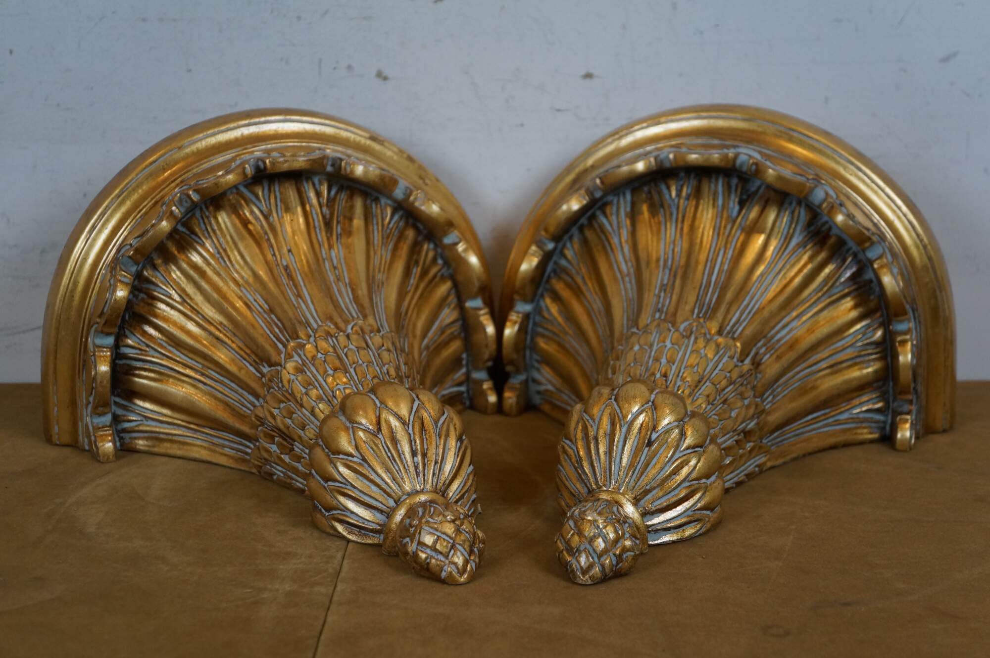 Pair of early 21st century gilt composite wall brackets / sconces / shelves, featuring tapered torch shaped bases with a pineapple and acanthus leaf motif, with a scalloped edge demilune / half round top.
