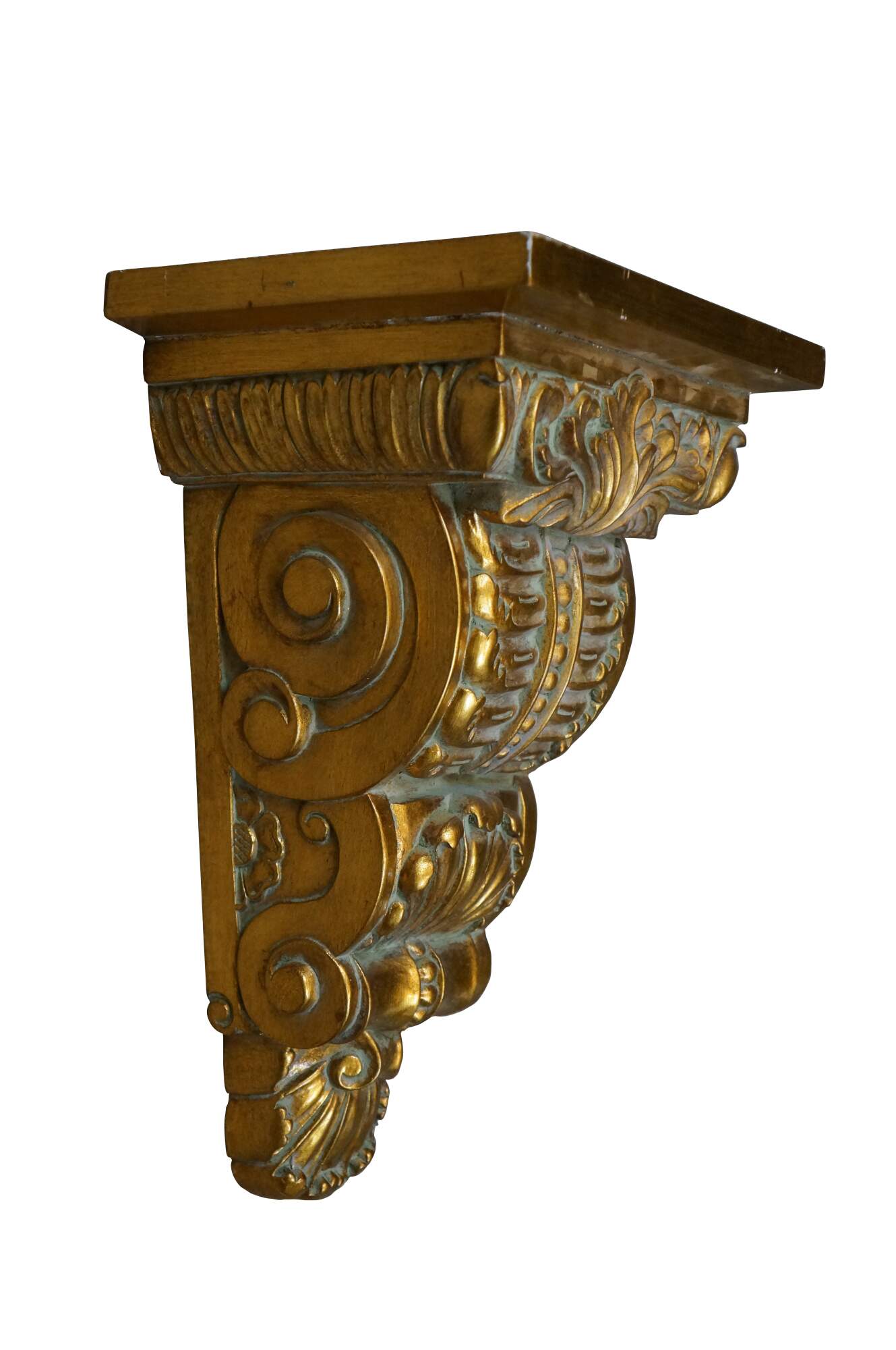 Set of four late 20th century gilt wood wall brackets / shelves / sconces, carved with scrollwork sides and neoclassical acanthus leaves and scallop shell accents, with rectangular tops.