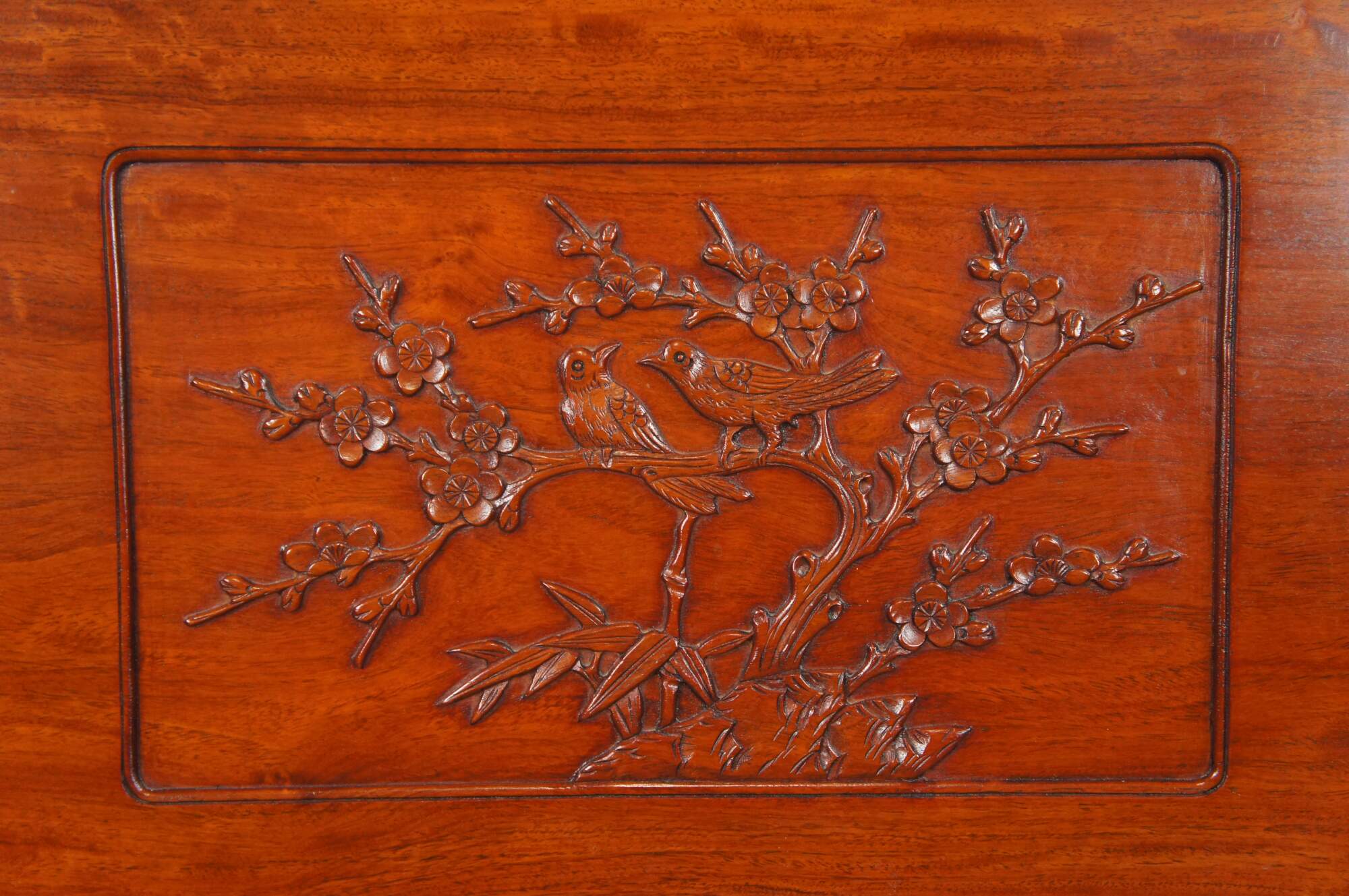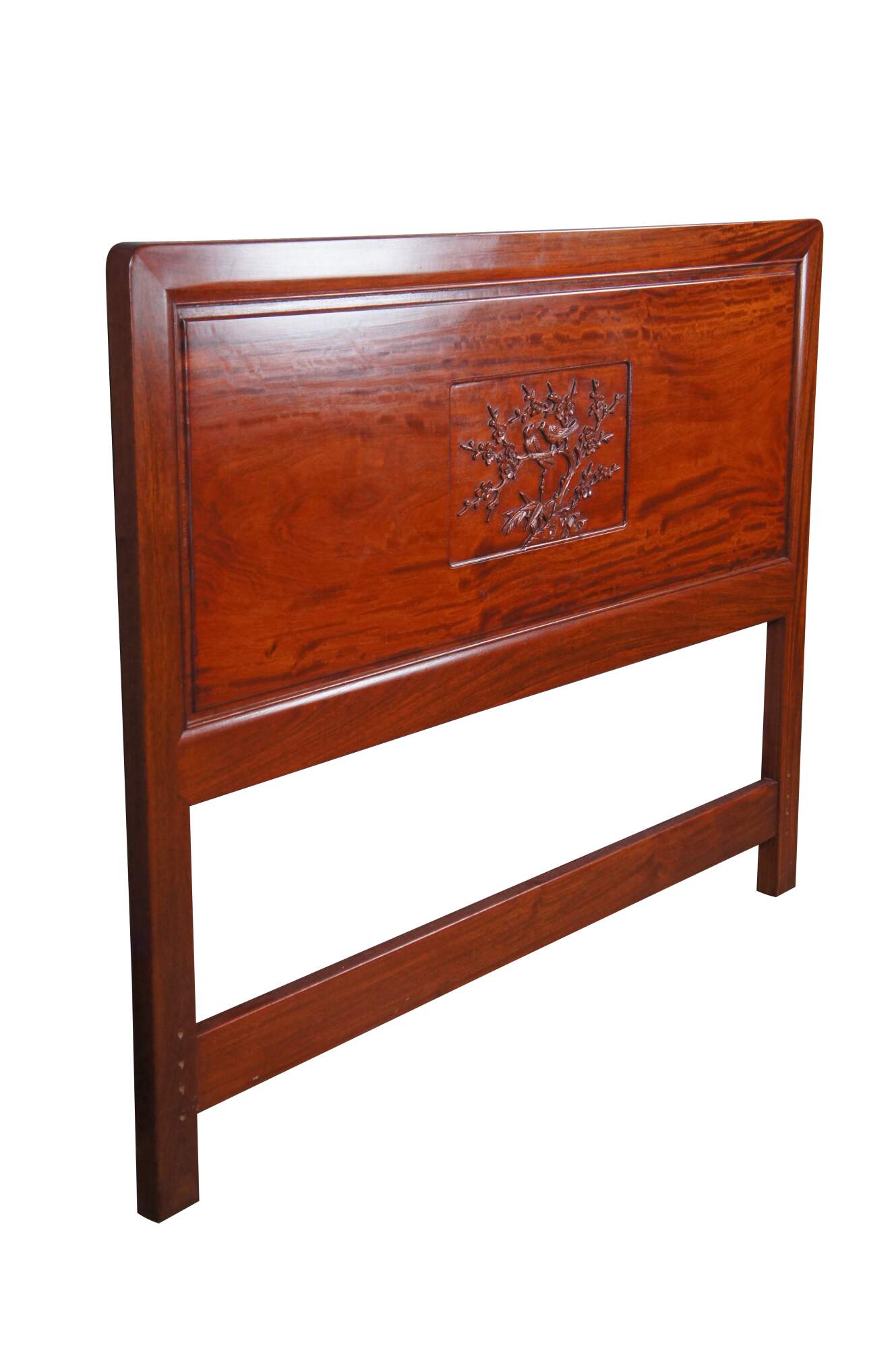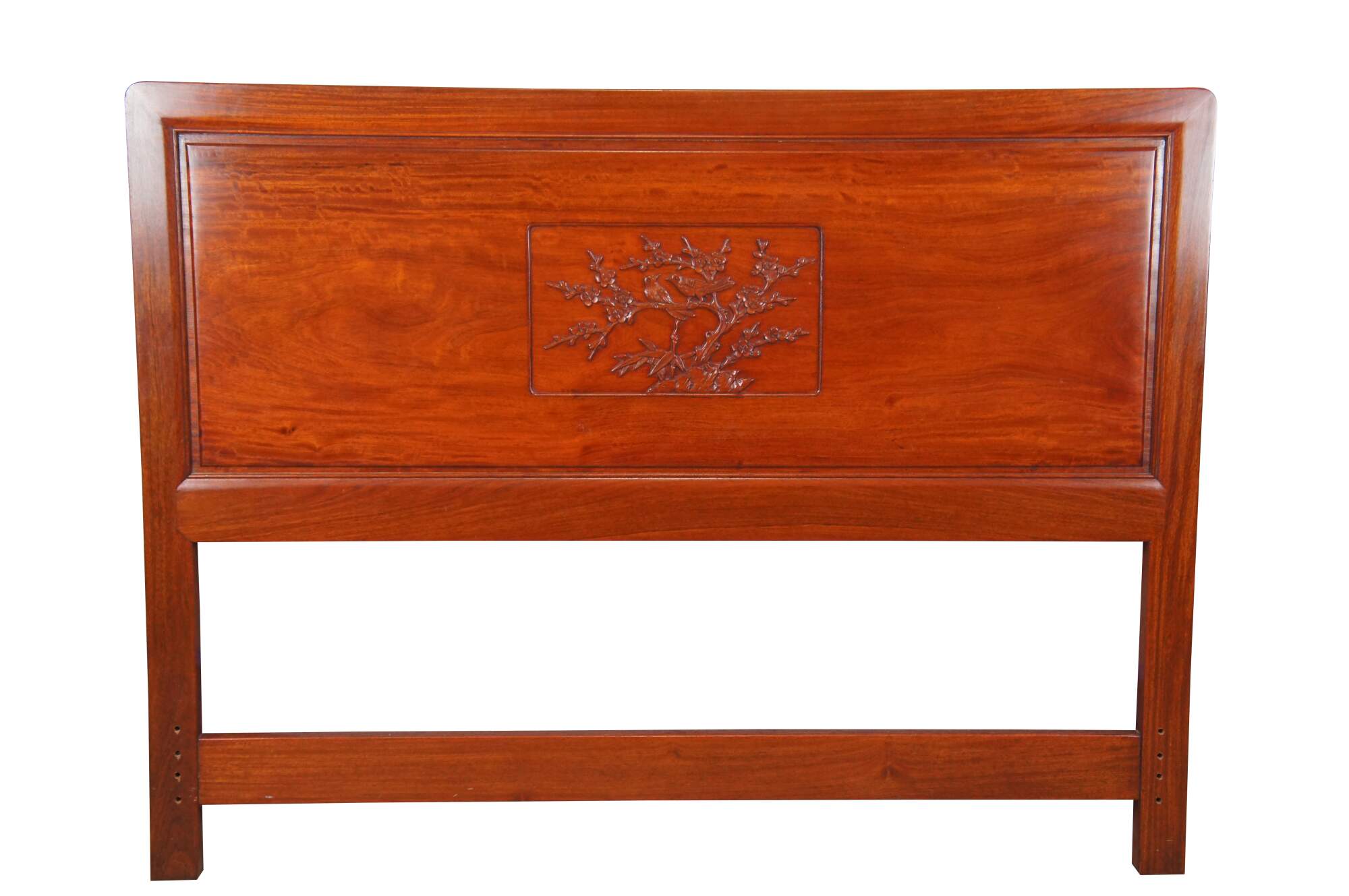 Vintage solid Rosewood full sized headboard by Far Eastern Furnishings of Hong Kong. It features a carving of song birds and cherry blossoms on the center panel.