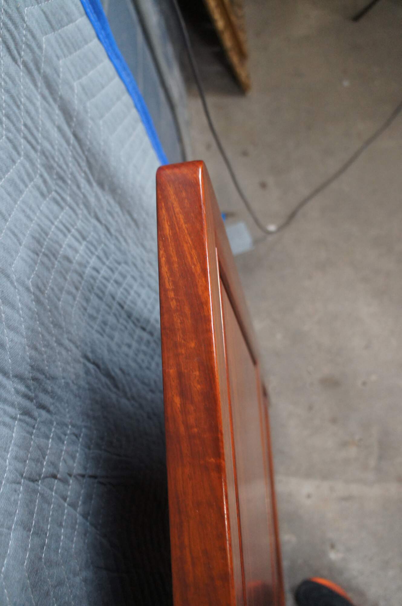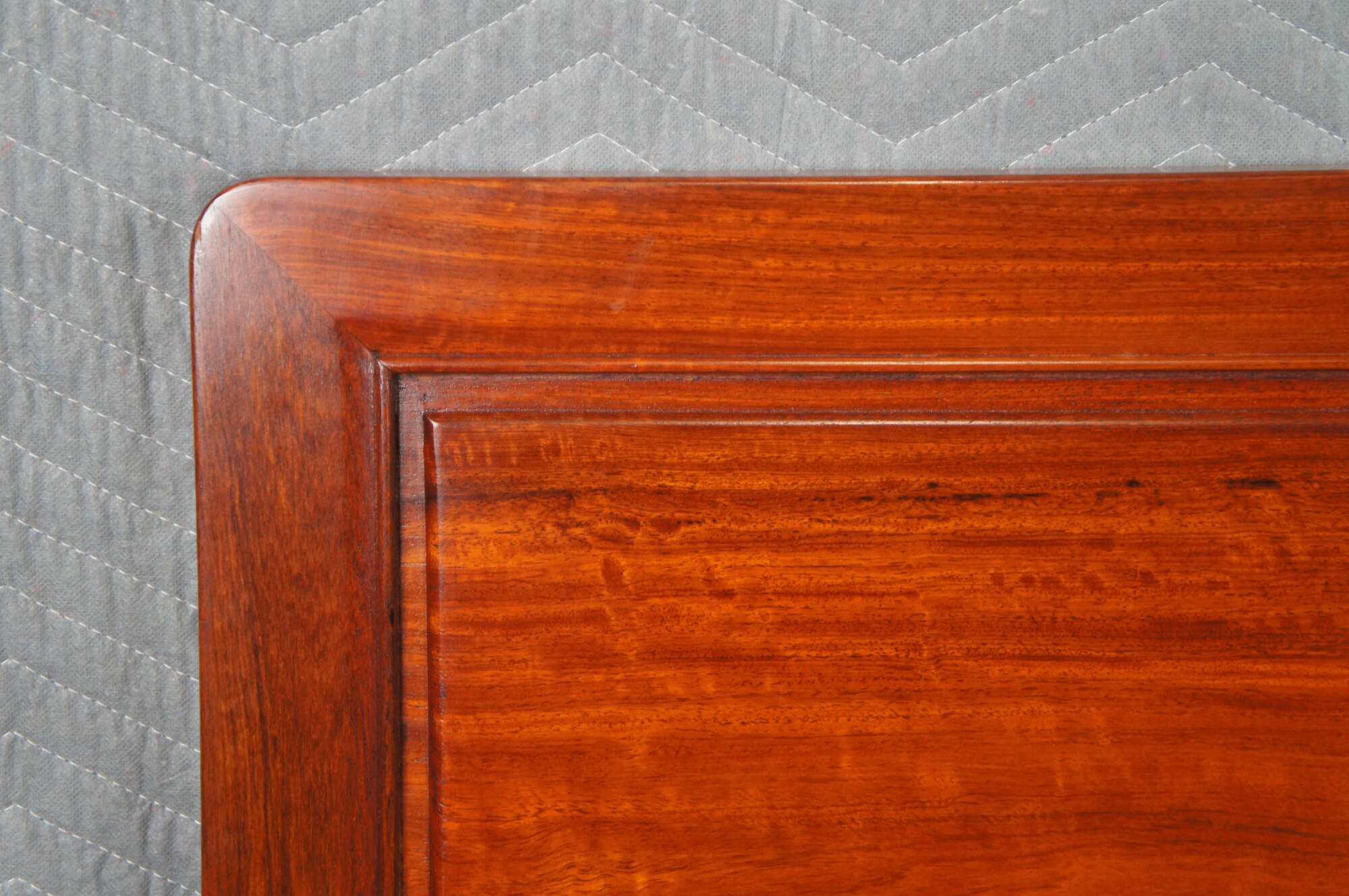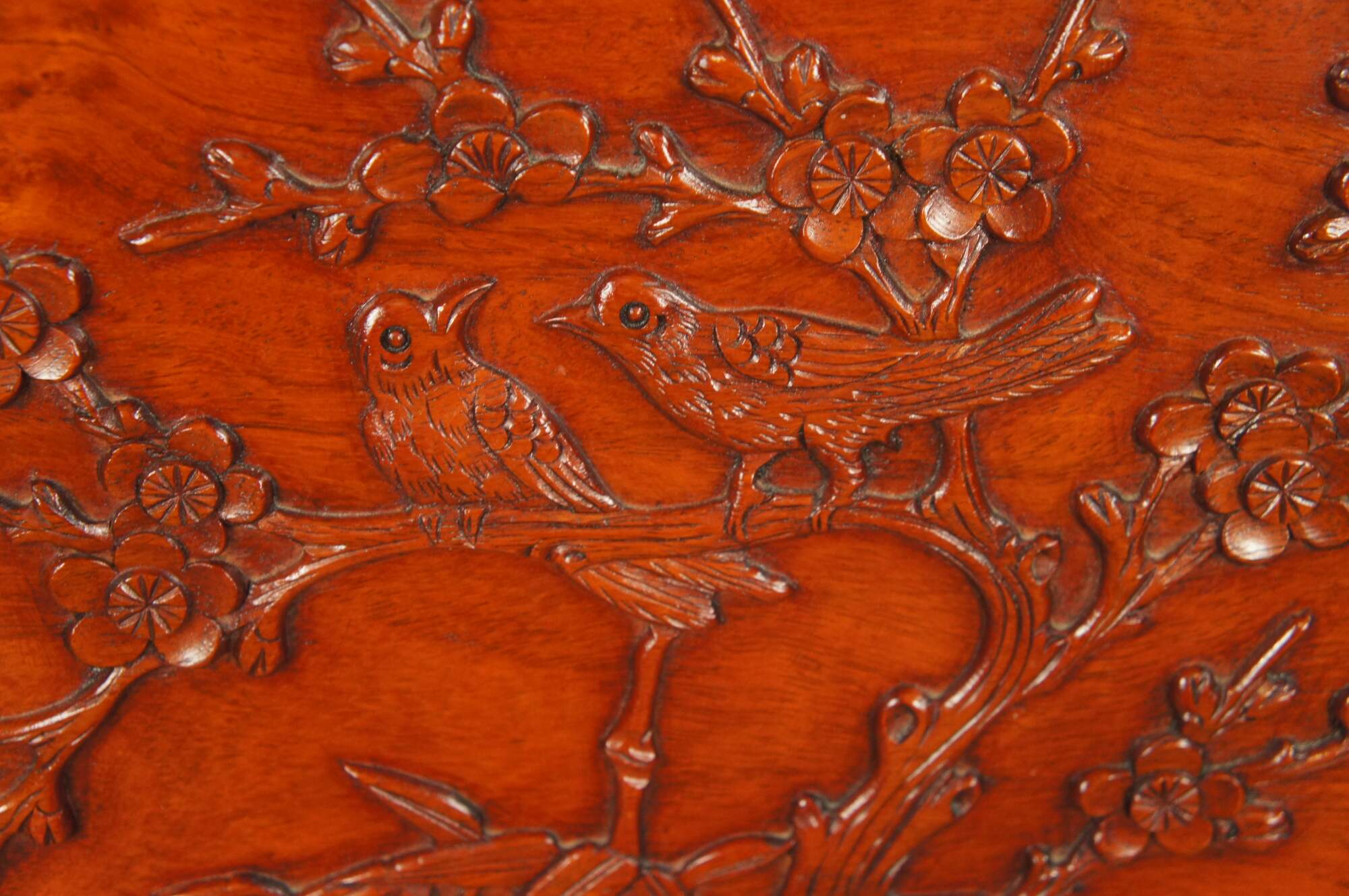 Vintage solid Rosewood full sized headboard by Far Eastern Furnishings of Hong Kong. It features a carving of song birds and cherry blossoms on the center panel.