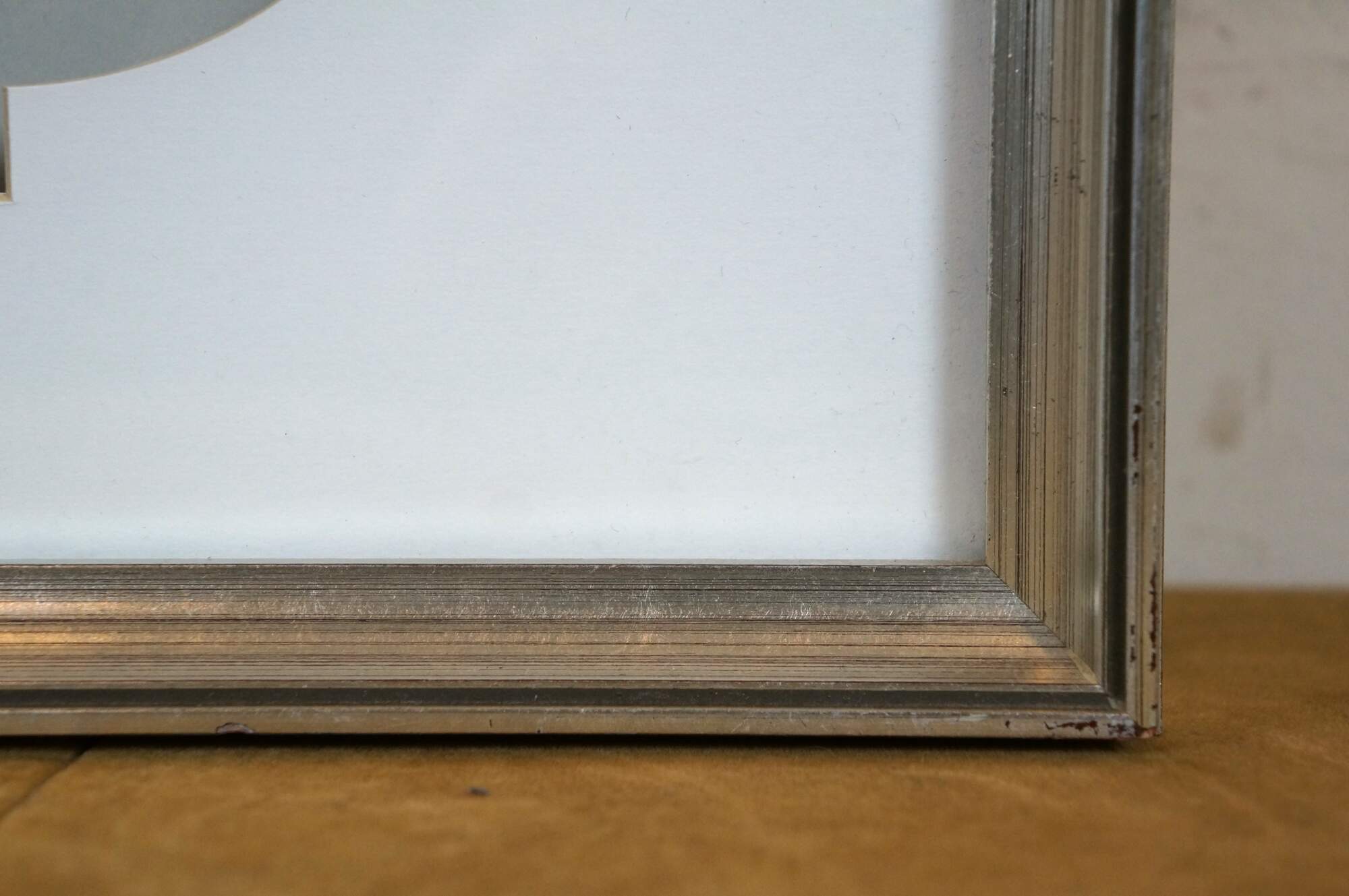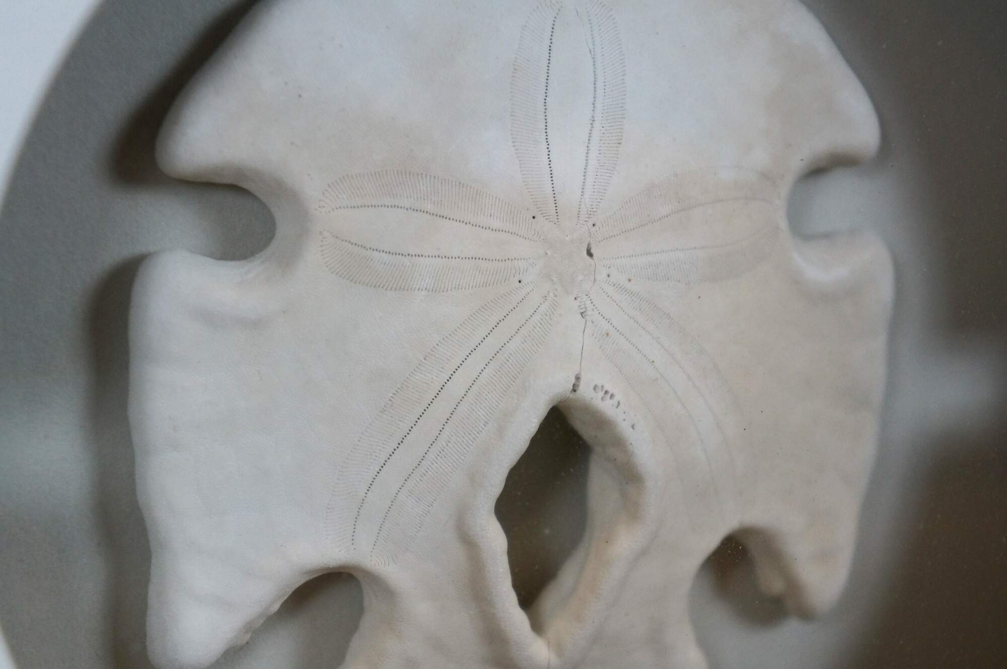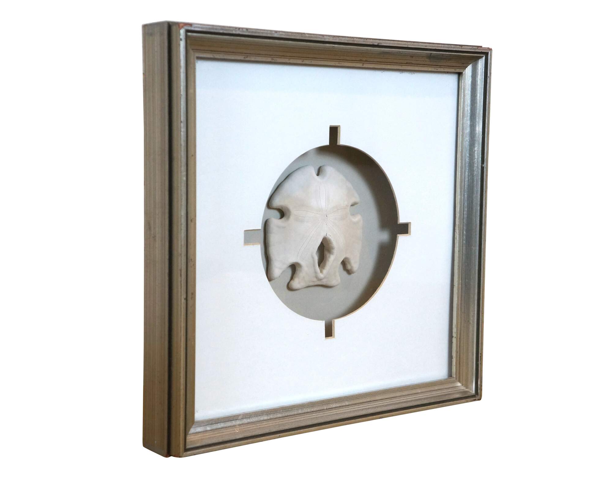 Sand dollar set in a champagne gilt shadow box frame with white and gray layered mat.