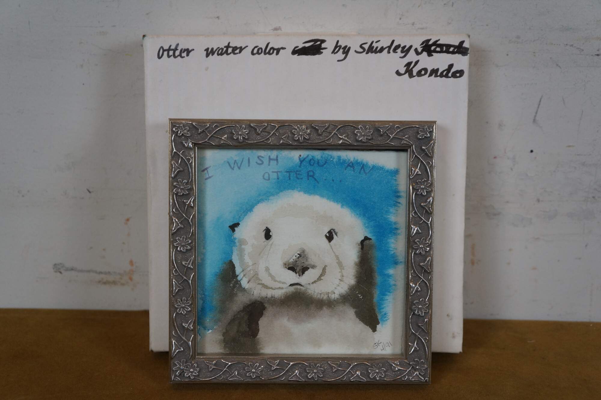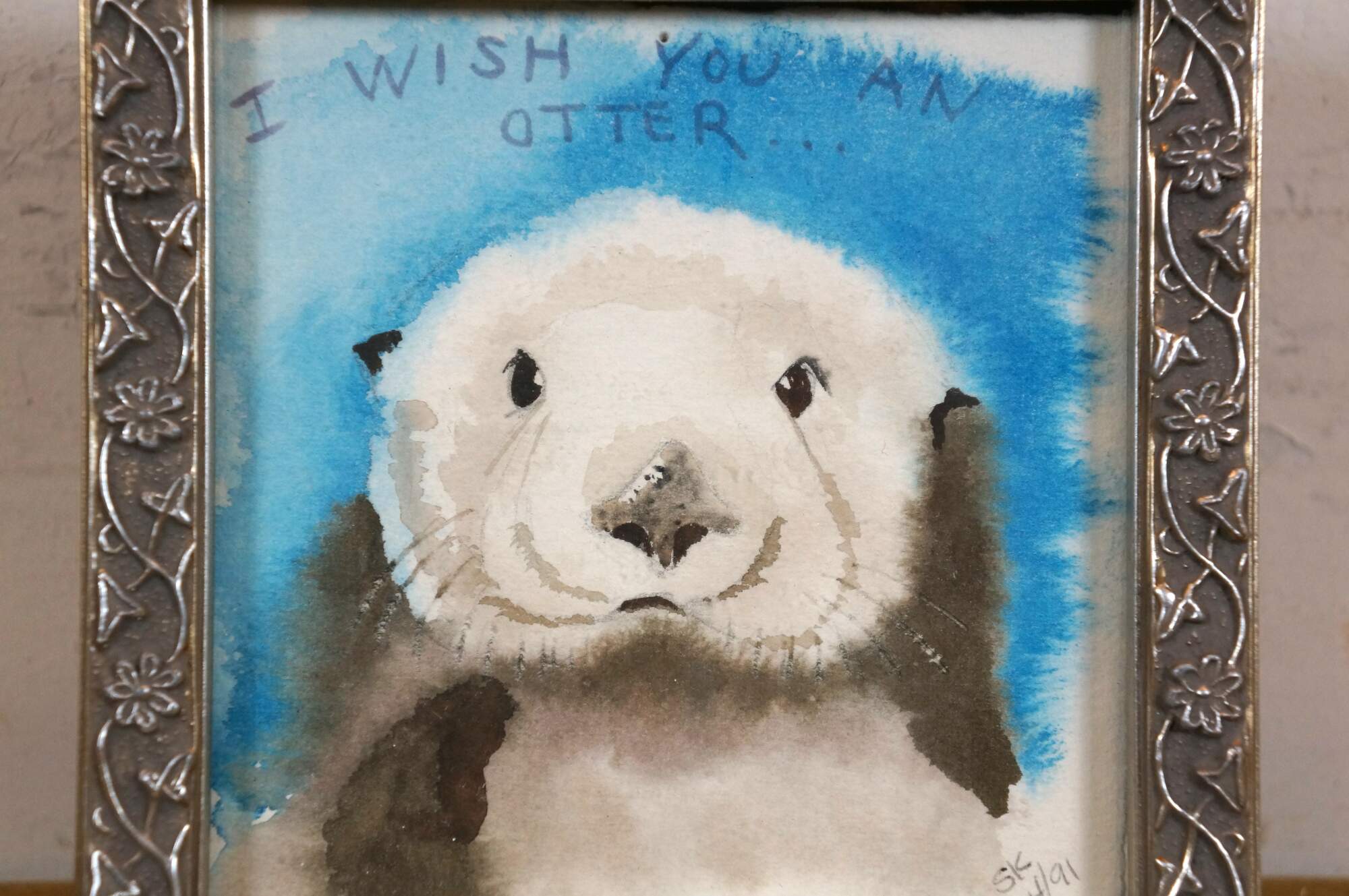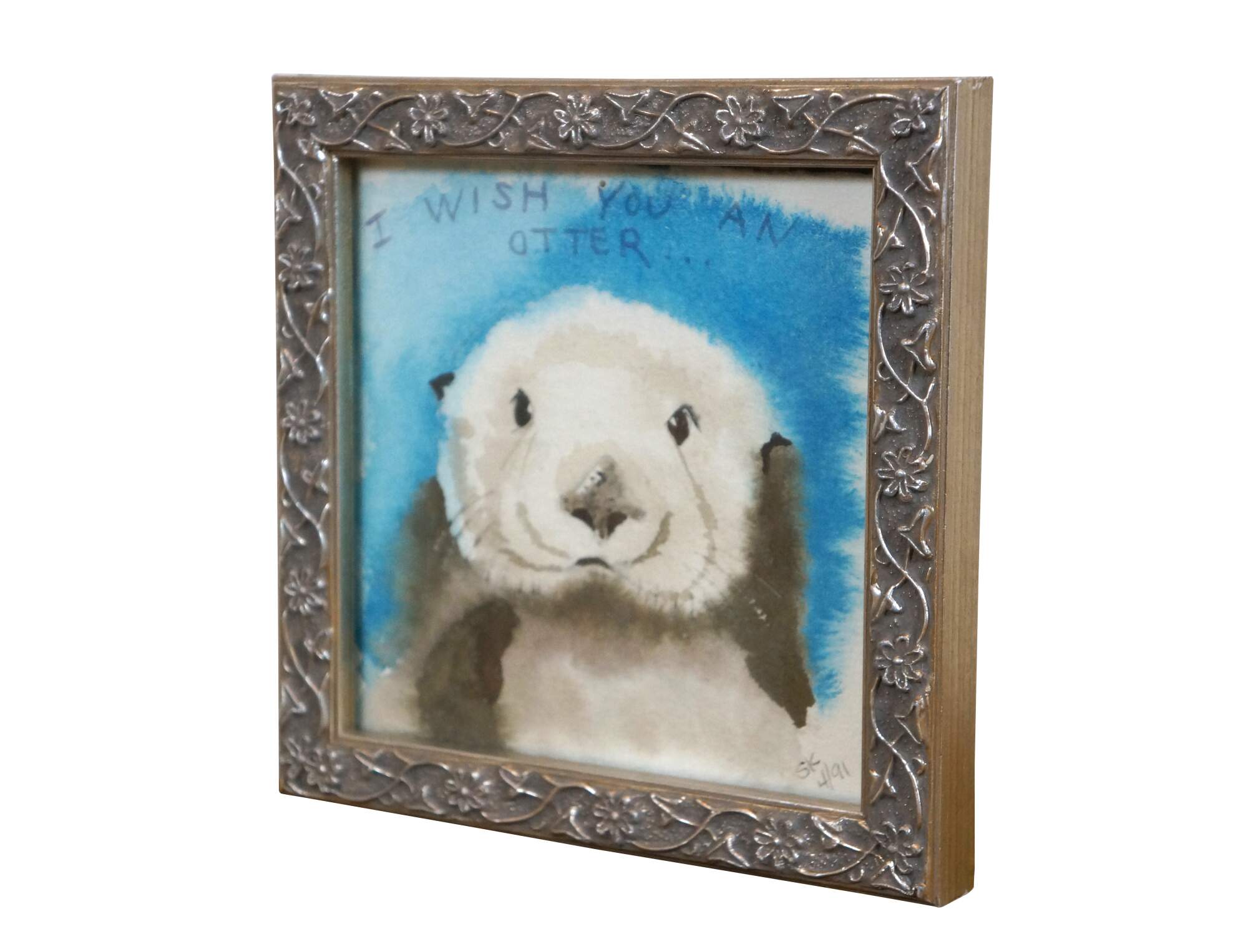 Vintage 1990s original watercolor painting depicting a sea otter under the words "I Wish You an Otter..." Signed SK 4/91 in the lower right corner. The box identifies the artist as Shirley Kondo. The frame is silver-painted composite molded with a flowering vine.