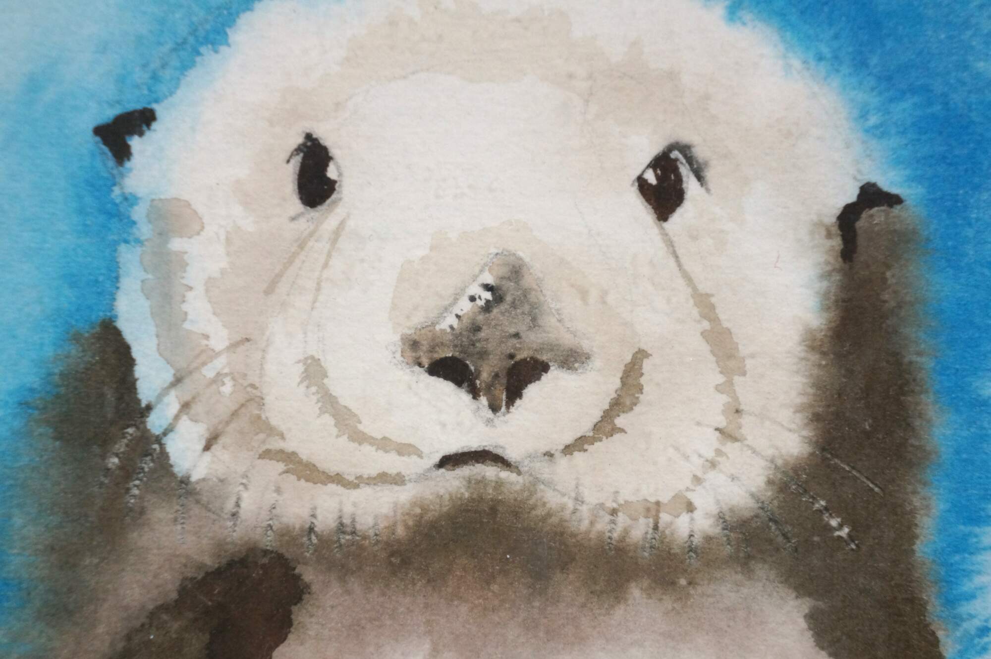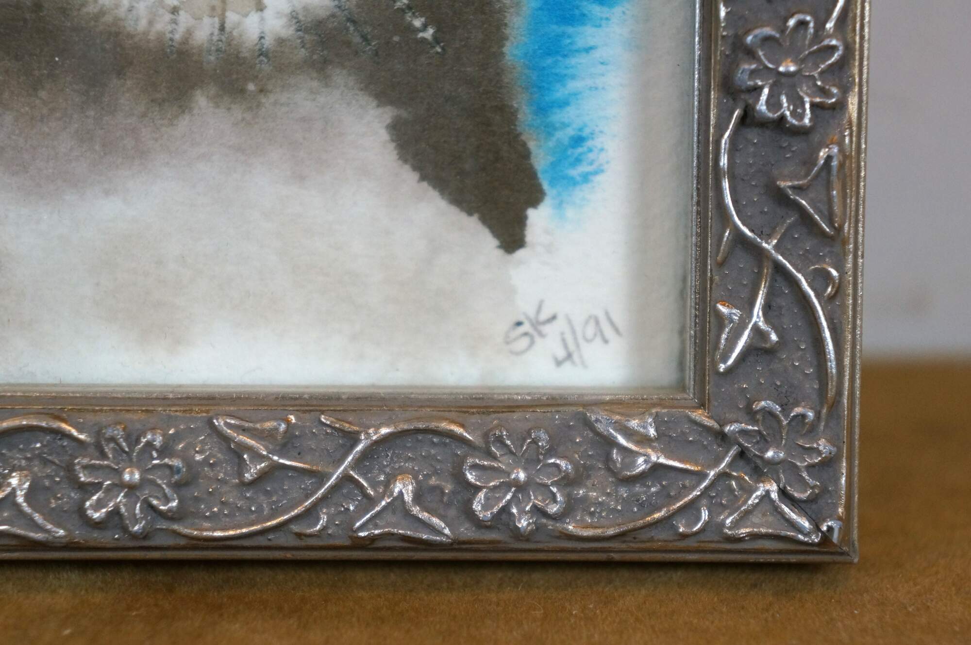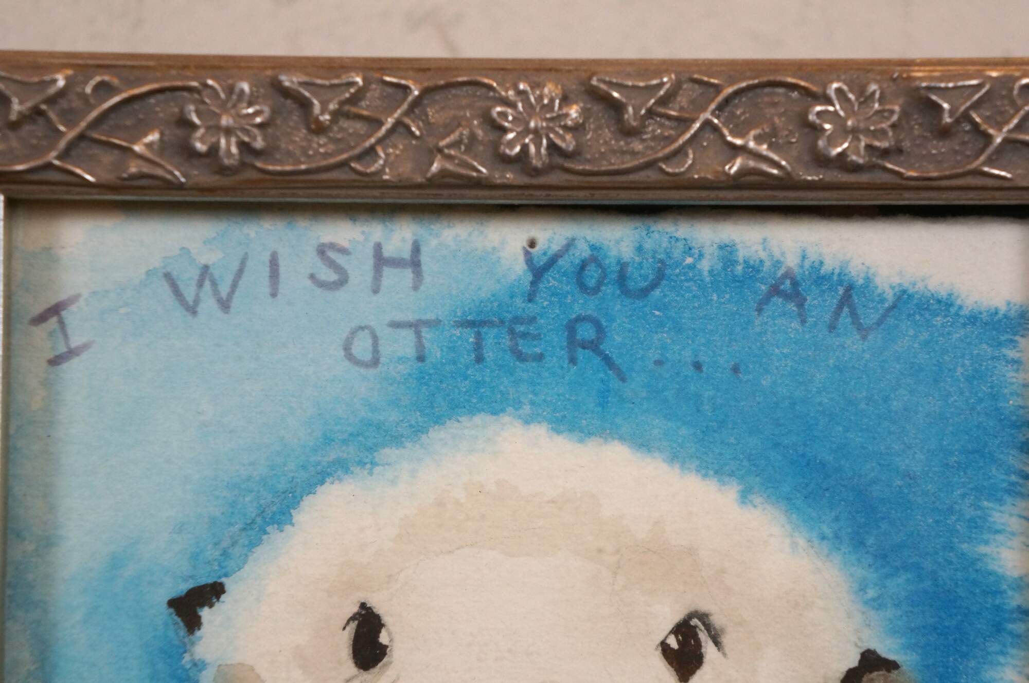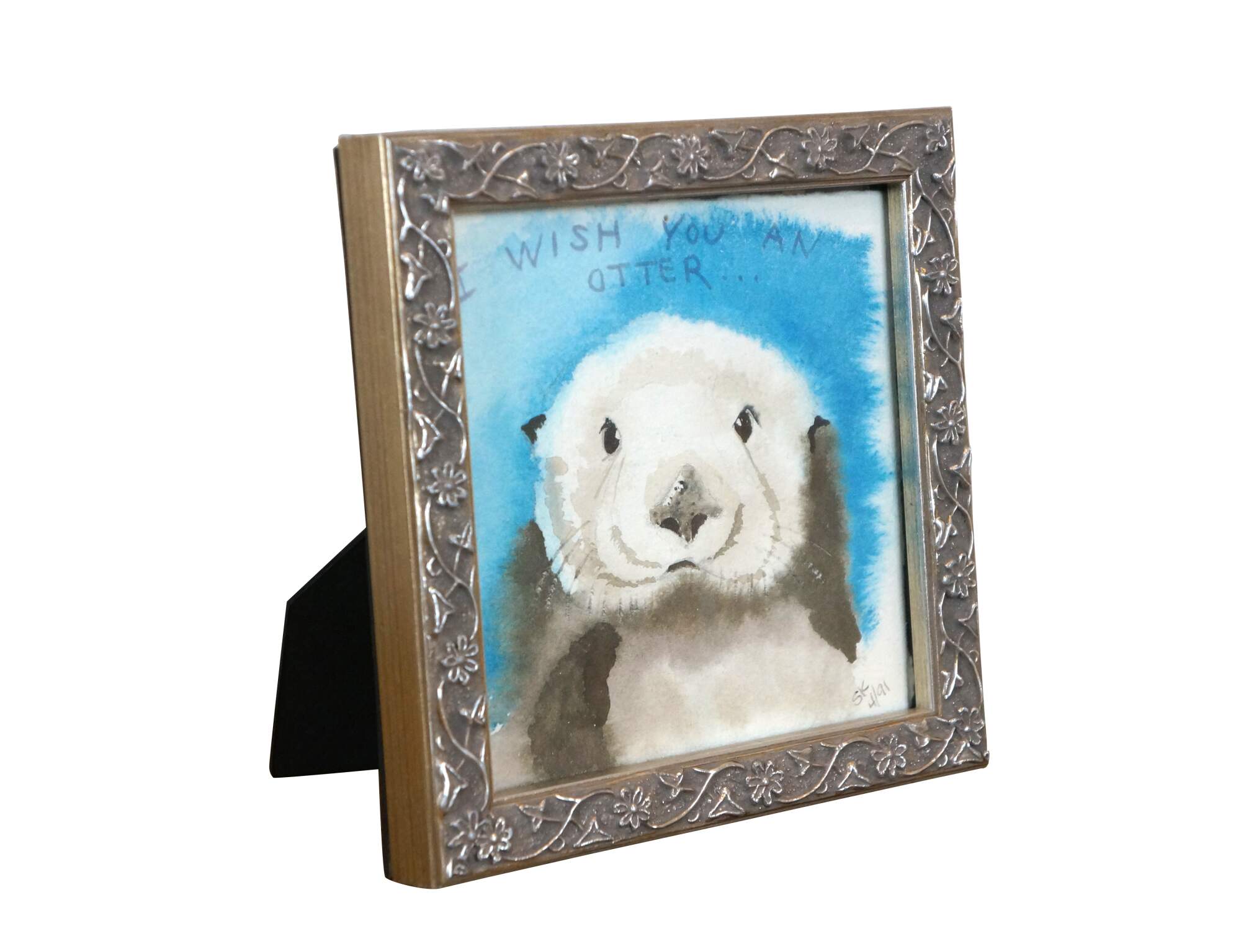 Vintage 1990s original watercolor painting depicting a sea otter under the words "I Wish You an Otter..." Signed SK 4/91 in the lower right corner. The box identifies the artist as Shirley Kondo. The frame is silver-painted composite molded with a flowering vine.