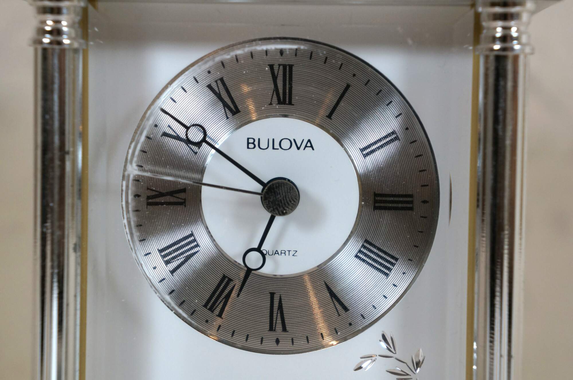 Vintage circa 1980s Bulova model B-1349 carriage-style desk clock. Traditional carriage clock shape with rectangular body and neoclassical columns flanking the silver face with black hands and Roman numerals, with an etched floral accent in the lower right corner. Metal and plastic body, finished in bright silver paint, with a rotating handle on top. Battery-operated quartz movement. Made in West Germany.