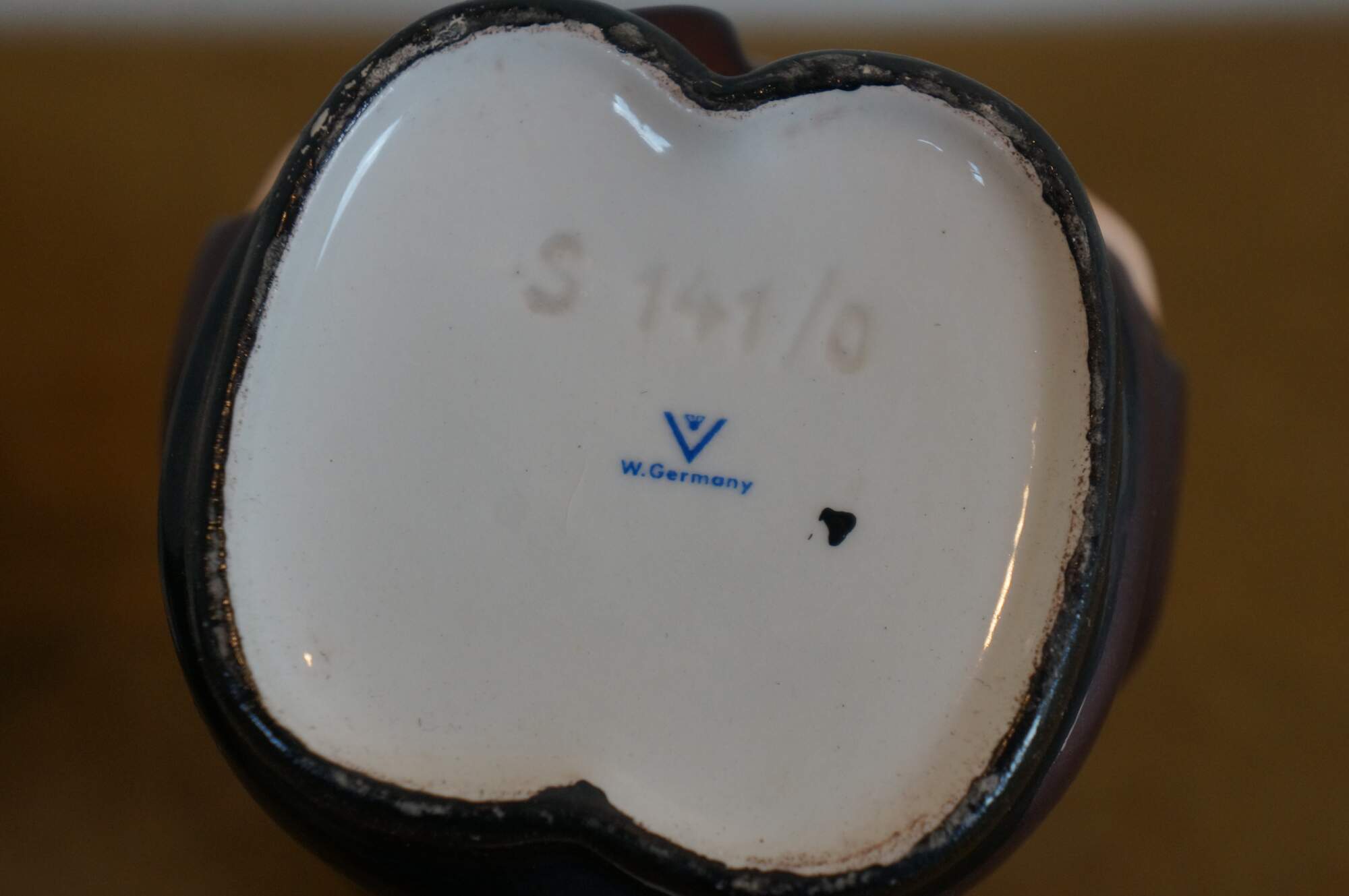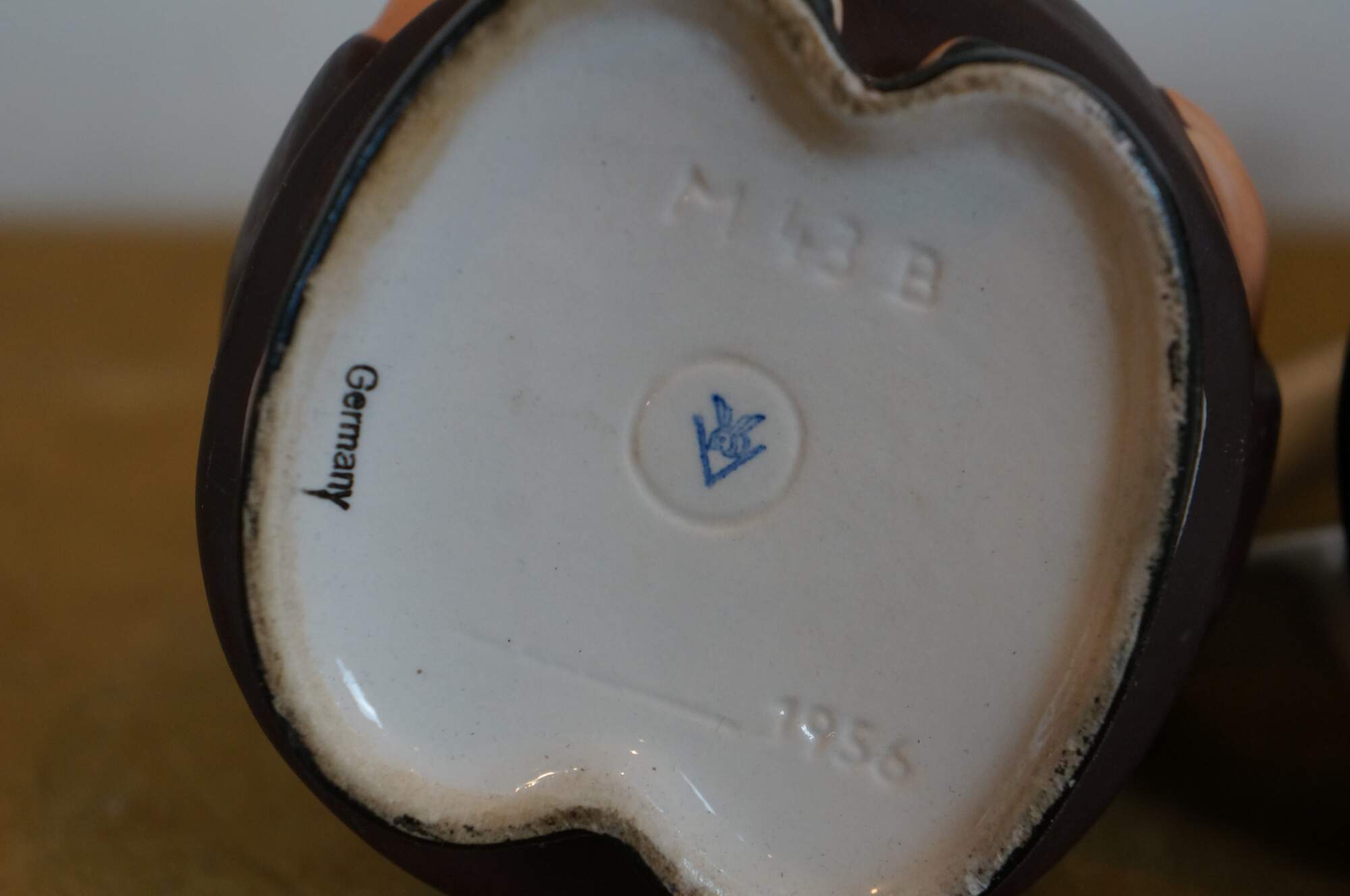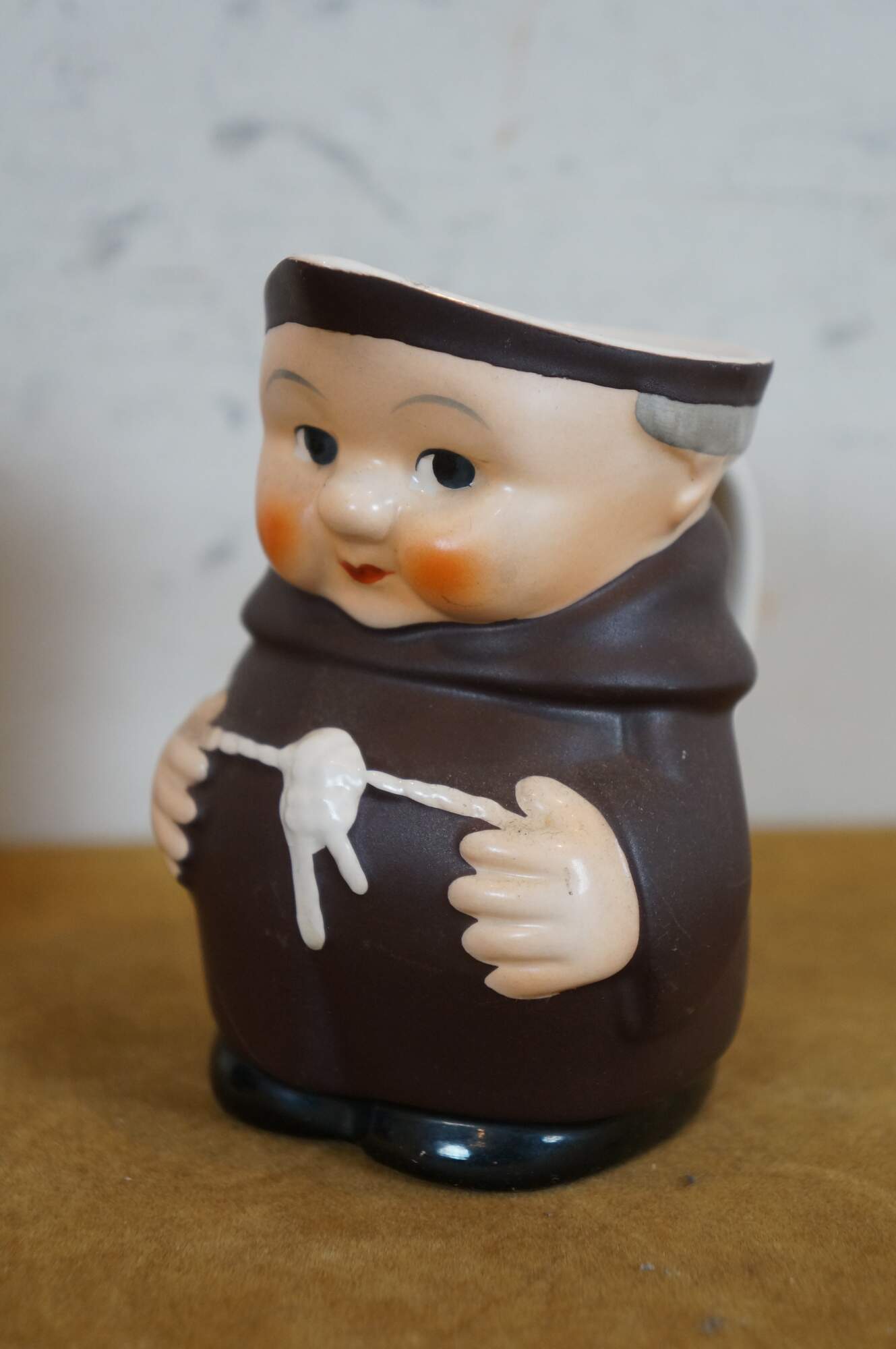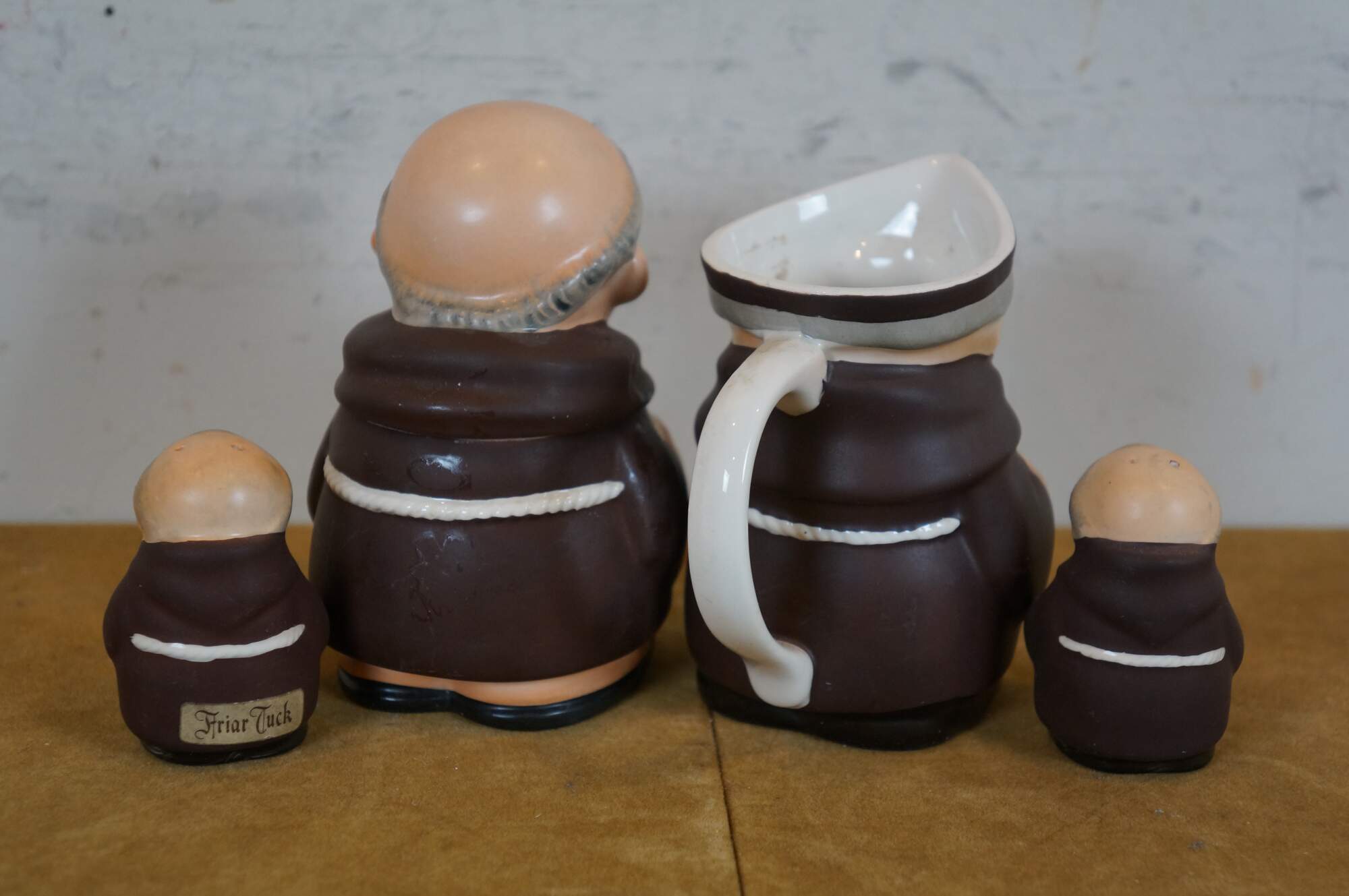 Mid-20th century 4-piece Goebel / MI Hummel porcelain creamer, lidded sugar bowl, and salt and pepper shakers in the shape of Friar Tuck / Franciscan monks. Friar Tuck shakers: TMK-3 Stylized Bee printed mark (used circa 1960-1972). Sugar bowl: M43B 1956 incised marks; TMK-2 Full Bee printed mark (used circa 1940-1959). Creamer: S141/0 incised mark; TMK-3 Stylized Bee printed mark (used circa 1960-1972).