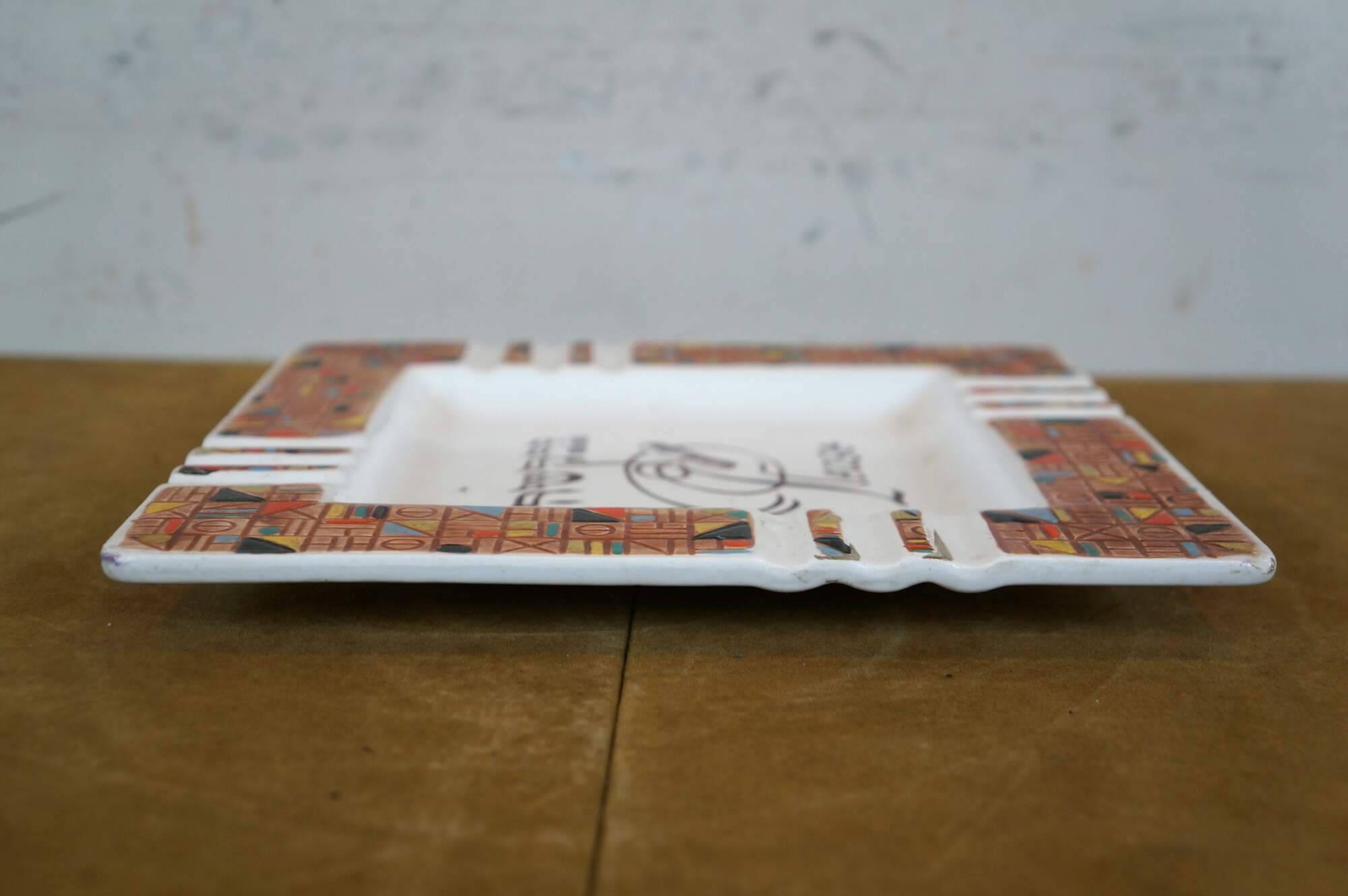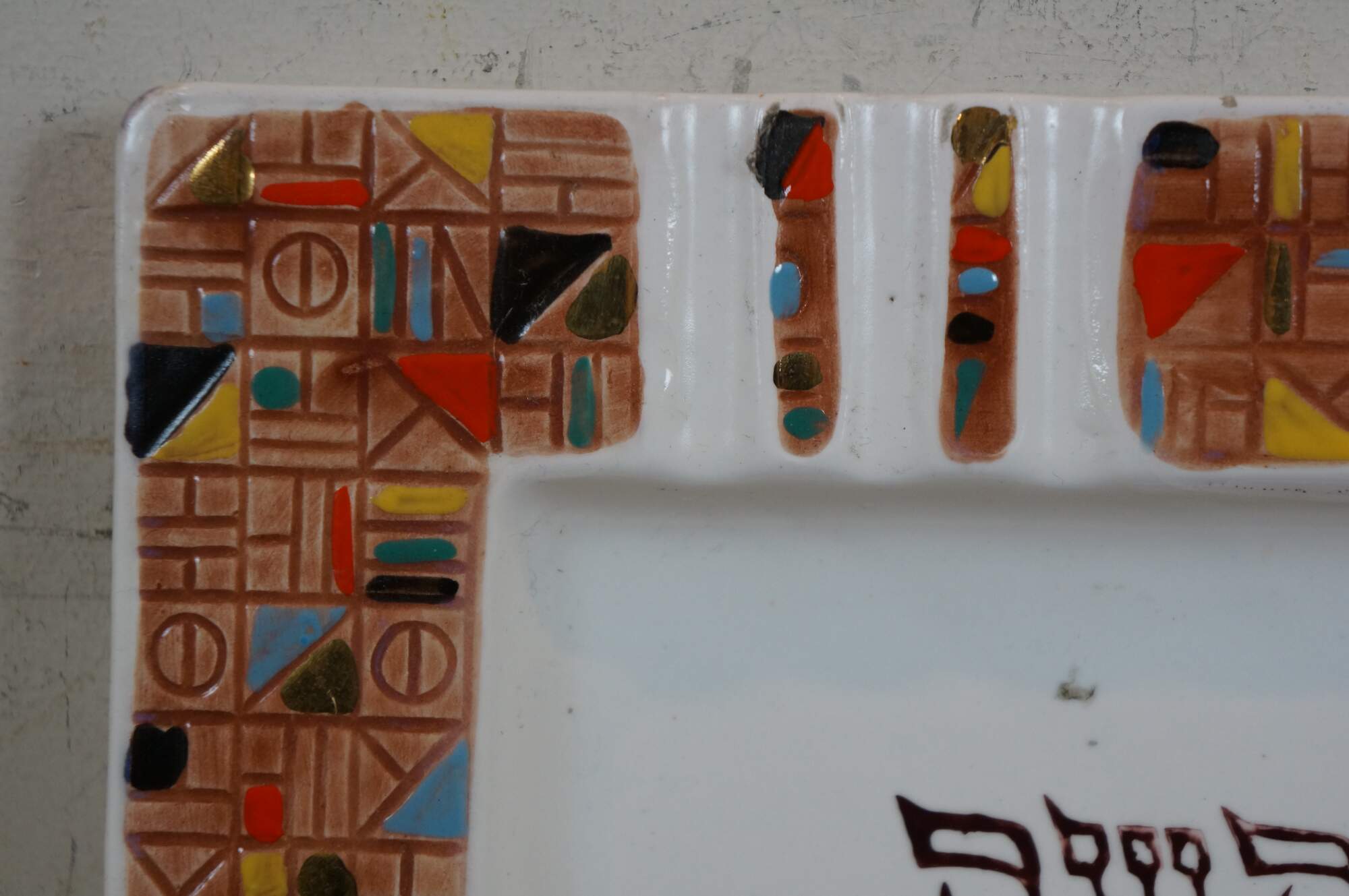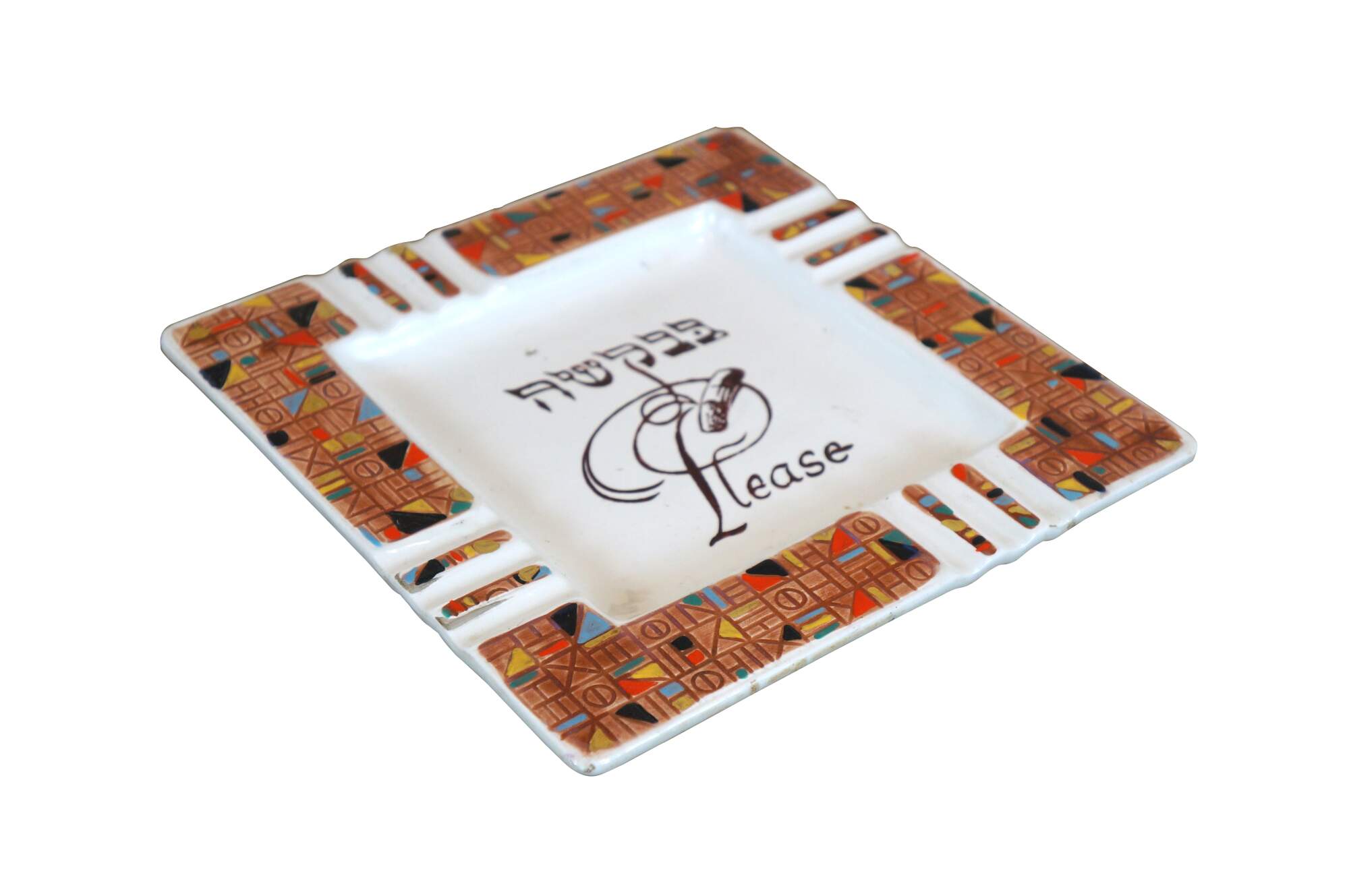 Vintage mid to late 20th century Judaica porcelain ashtray/plate. Square form featuring a multicolored mosaic-style design around the edge, broken by three cigarette rests on each side. At the center is the word "Please" in Hebrew and English, overlaid with a lightly smoking cigar. Designed in America by Va-Dai - E400/P.