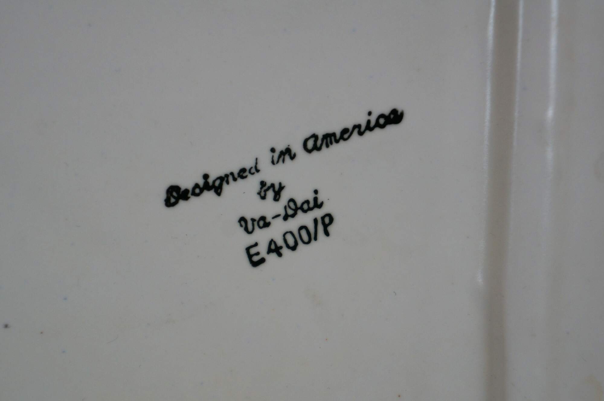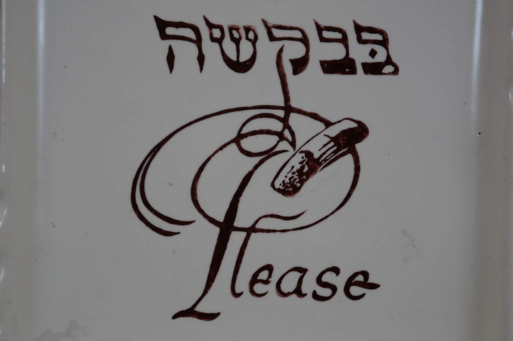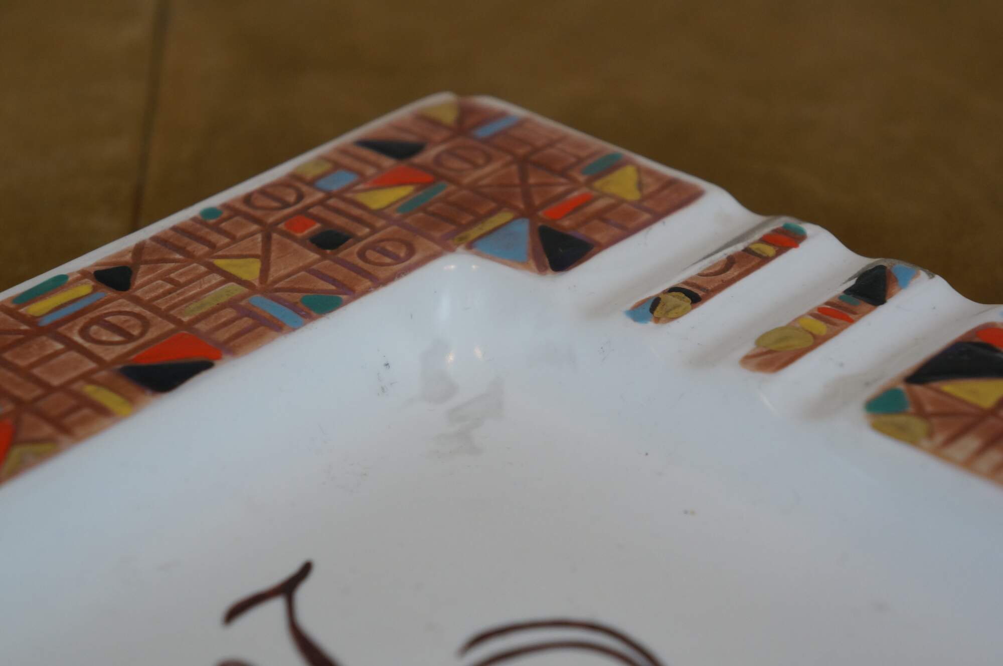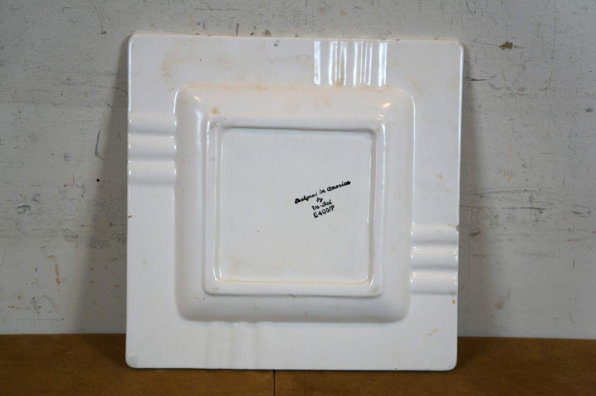 Vintage mid to late 20th century Judaica porcelain ashtray/plate. Square form featuring a multicolored mosaic-style design around the edge, broken by three cigarette rests on each side. At the center is the word "Please" in Hebrew and English, overlaid with a lightly smoking cigar. Designed in America by Va-Dai - E400/P.