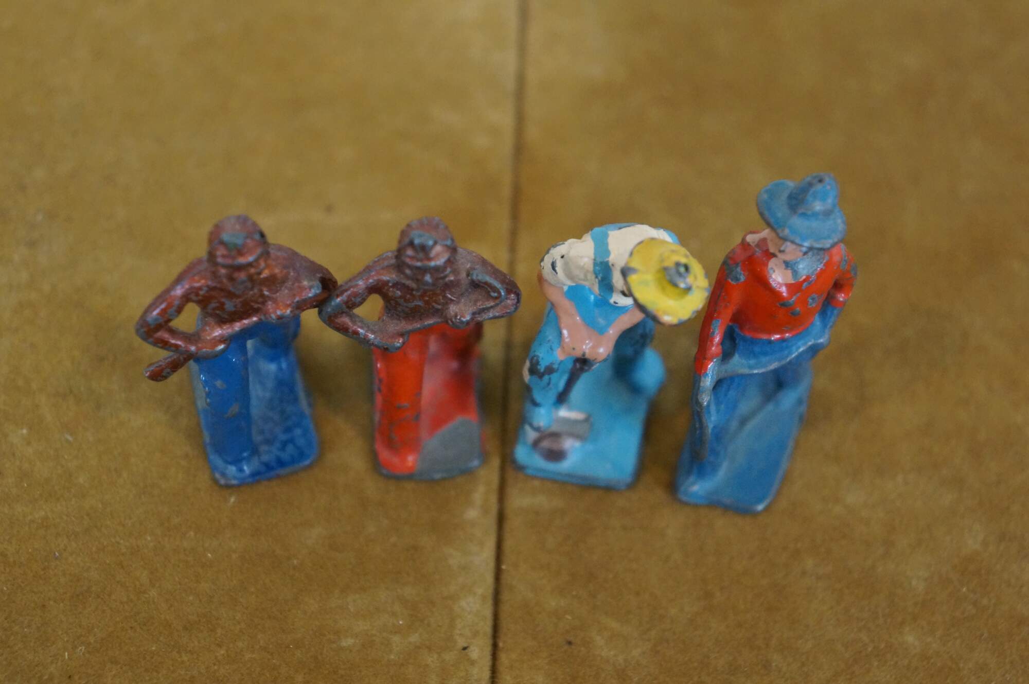4 early to mid 20th century cast lead toy figures including two Native Americans with rifles, one farmer digging with a spade shovel, and one cowboy with lasso. Three dimensional figures with rectangular bases. Made in England.