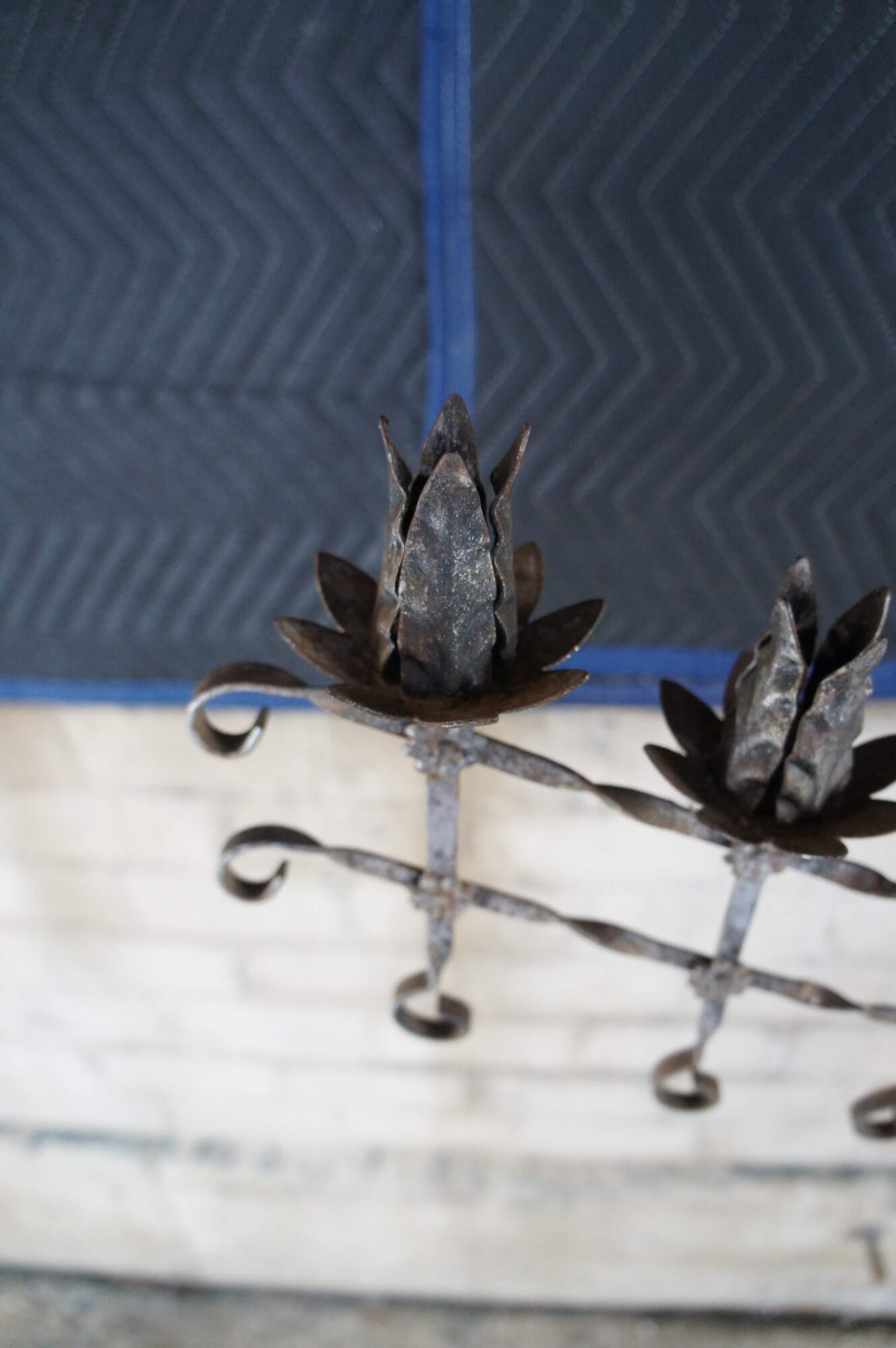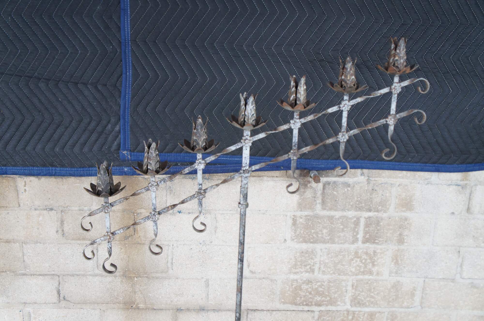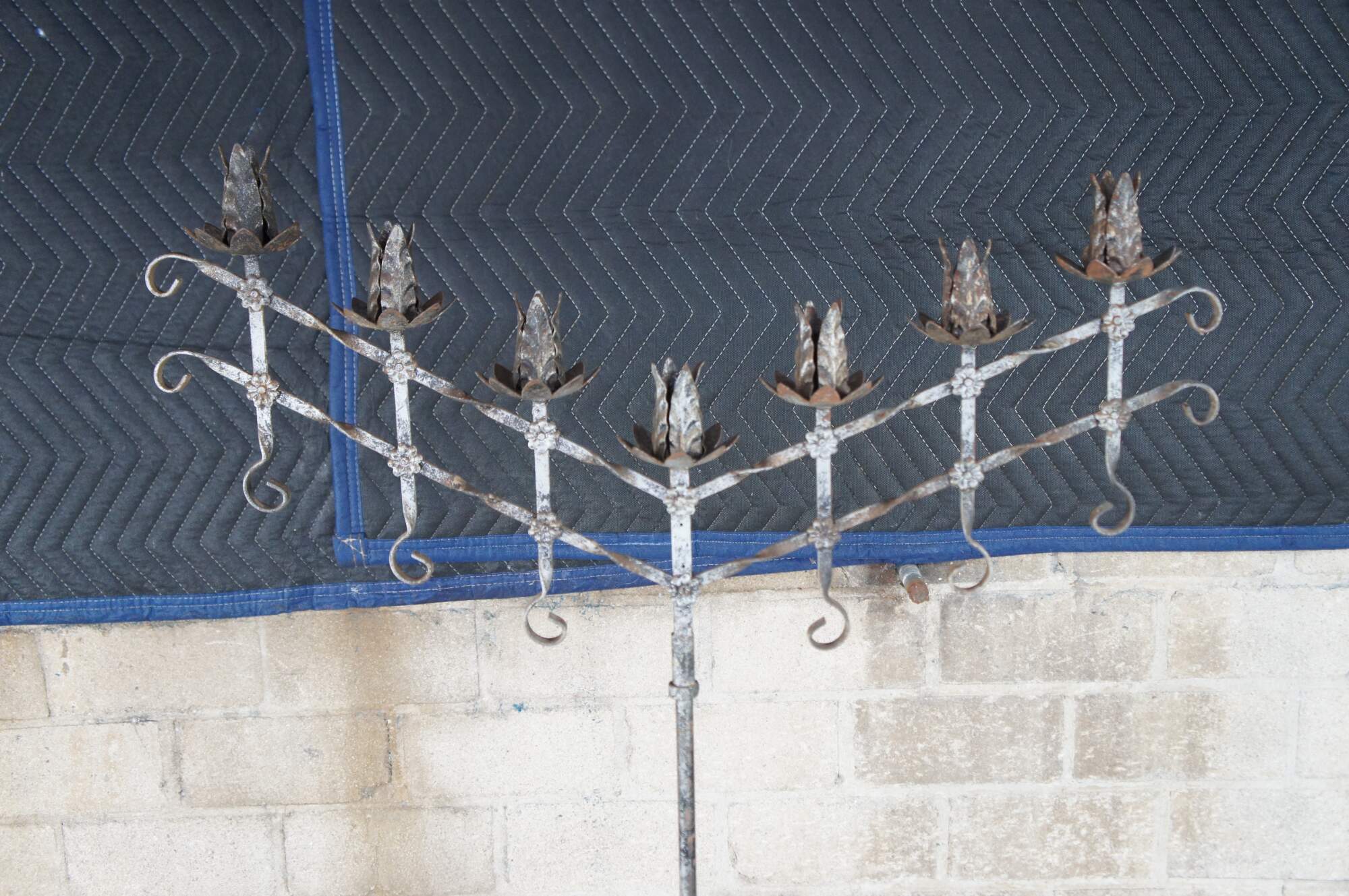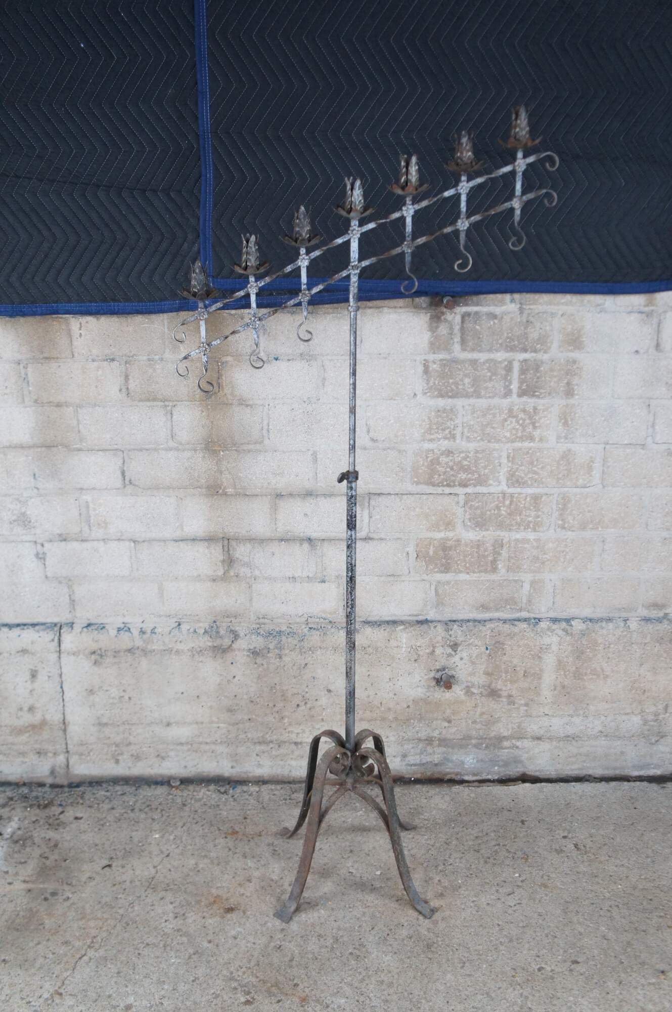 Set of Wrought Iron Adjustable Church Altar Candelabras. The candelabra or central light section is hinged allowing for adjustments from the V or Y formation to a straight line or staircase setup. Each candelabra is set on an adjustable base allowing them to be raised to close to 7' tall. The bases are downswept with scrolled accents. Eanch candle is held by an acanthus leaf enclosure over a flower pedal base.