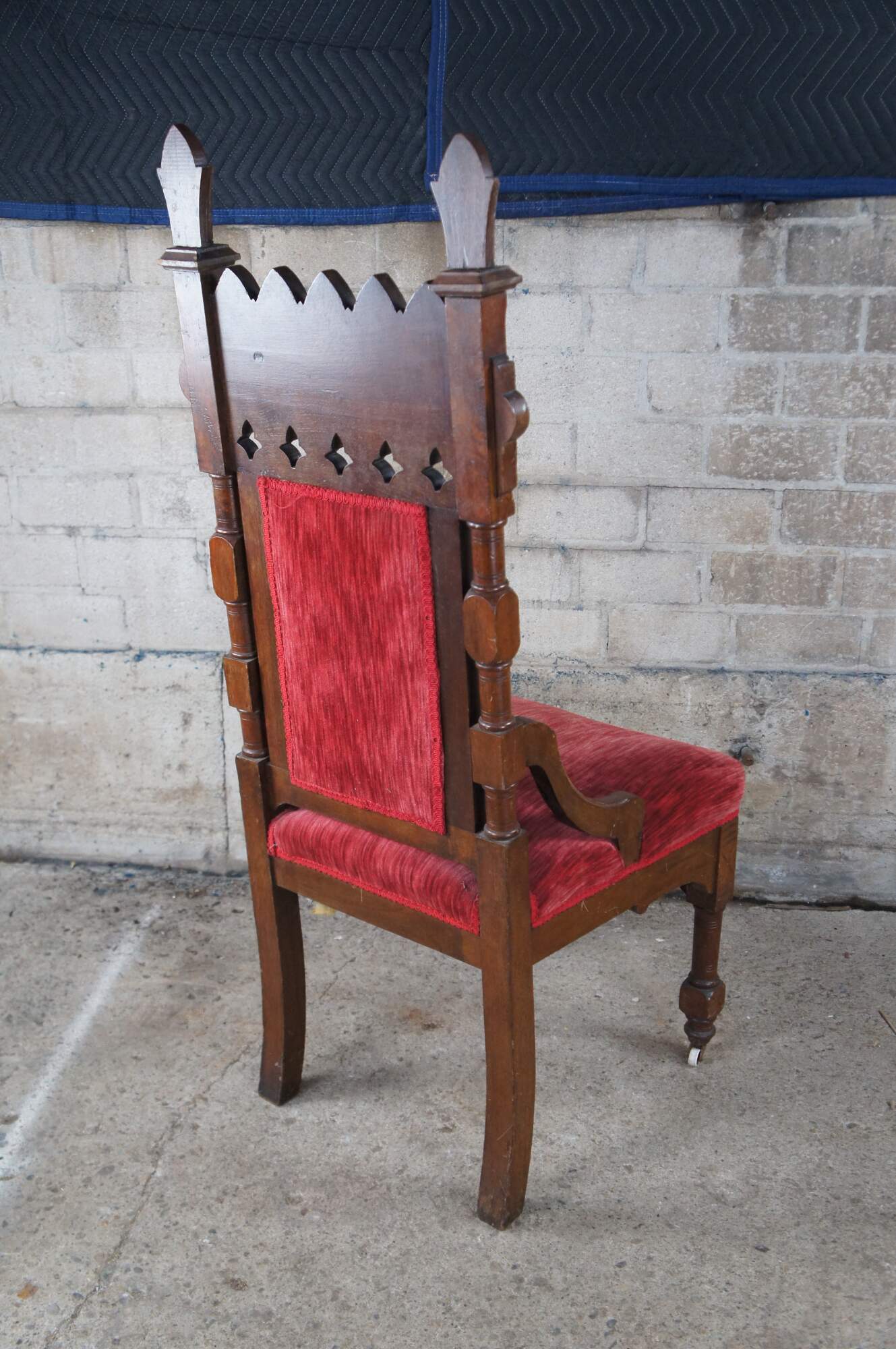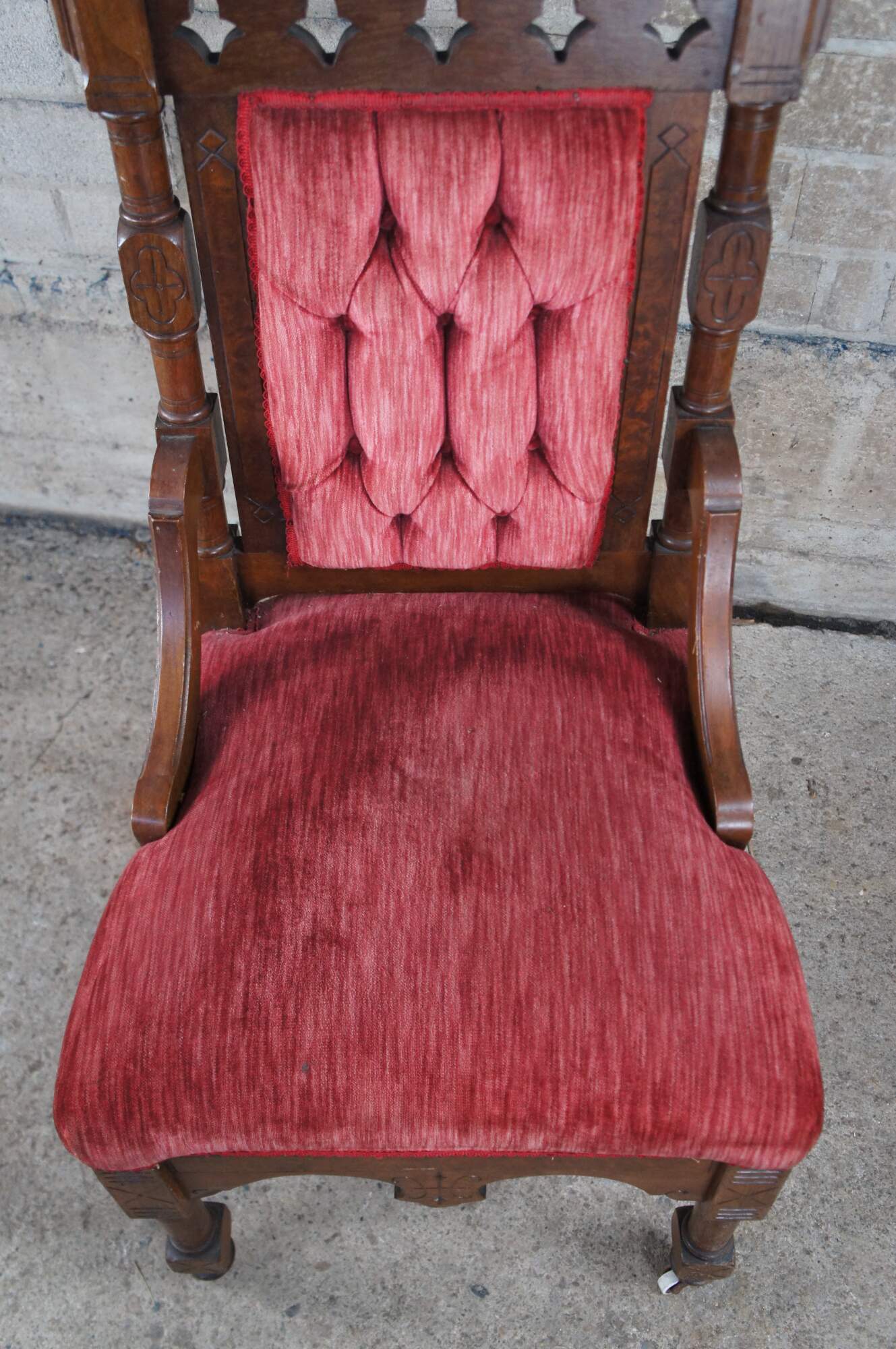 Pair of antique Victorian Gothic-style highback throne chairs. Features a walnut frame with a pierced and carved back, upholstered in a red velvet with a tufted back. The chair is accented by walnut burl panels and topped by mitre hat-carved finials. The mitre hat is the type of headgear often seen on popes and bishops. The chairs are supported by blocked and turned legs with porcelain casters.