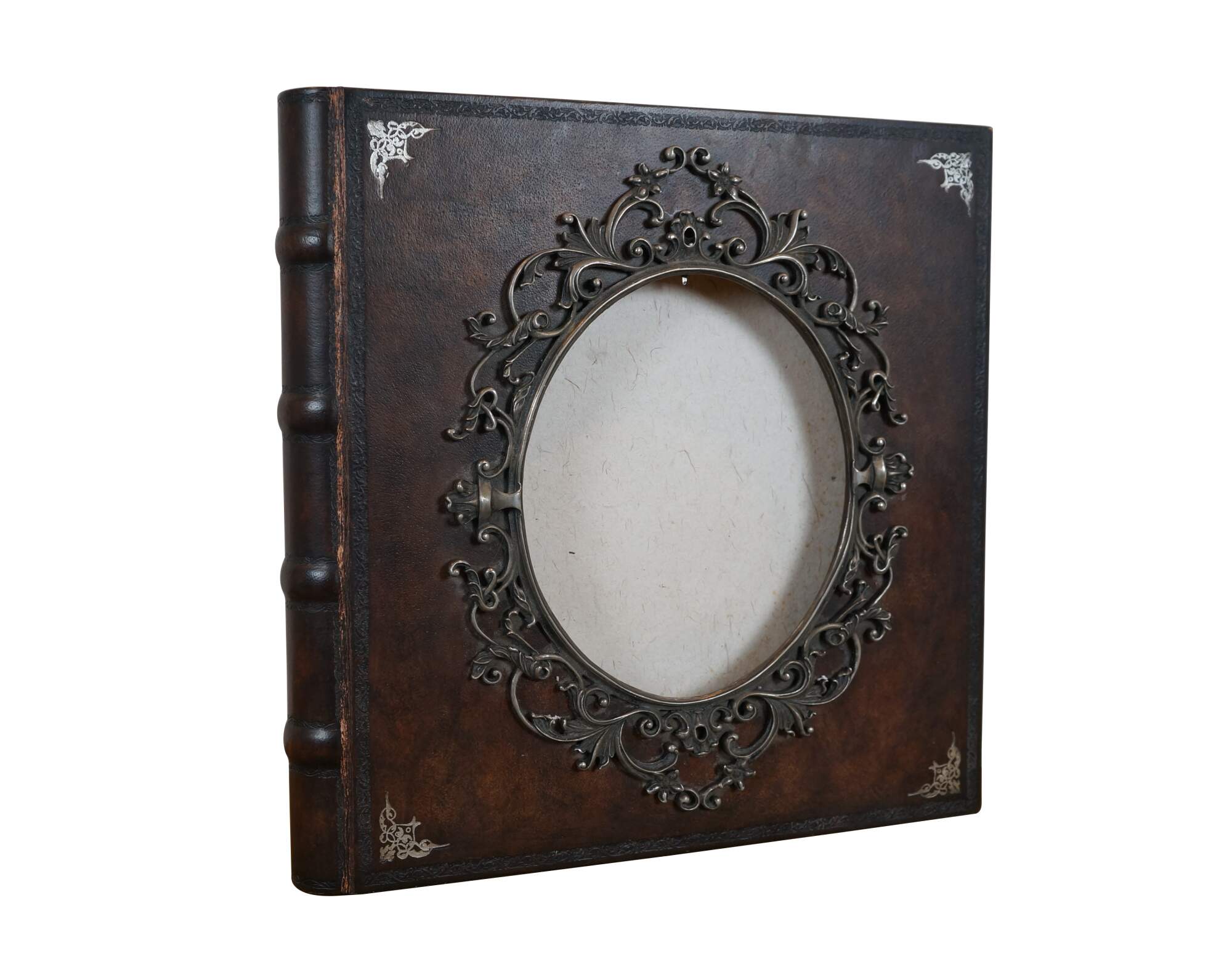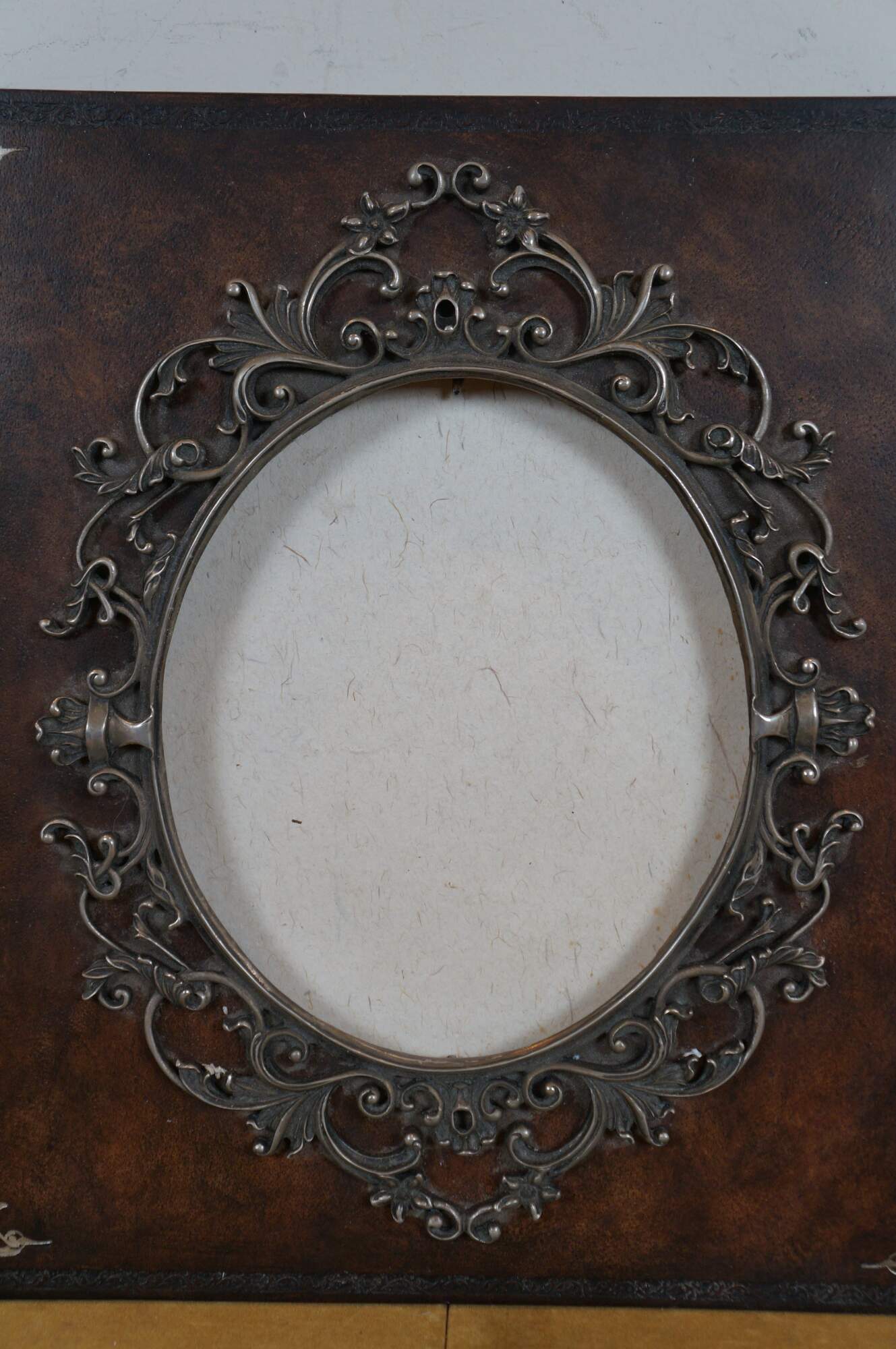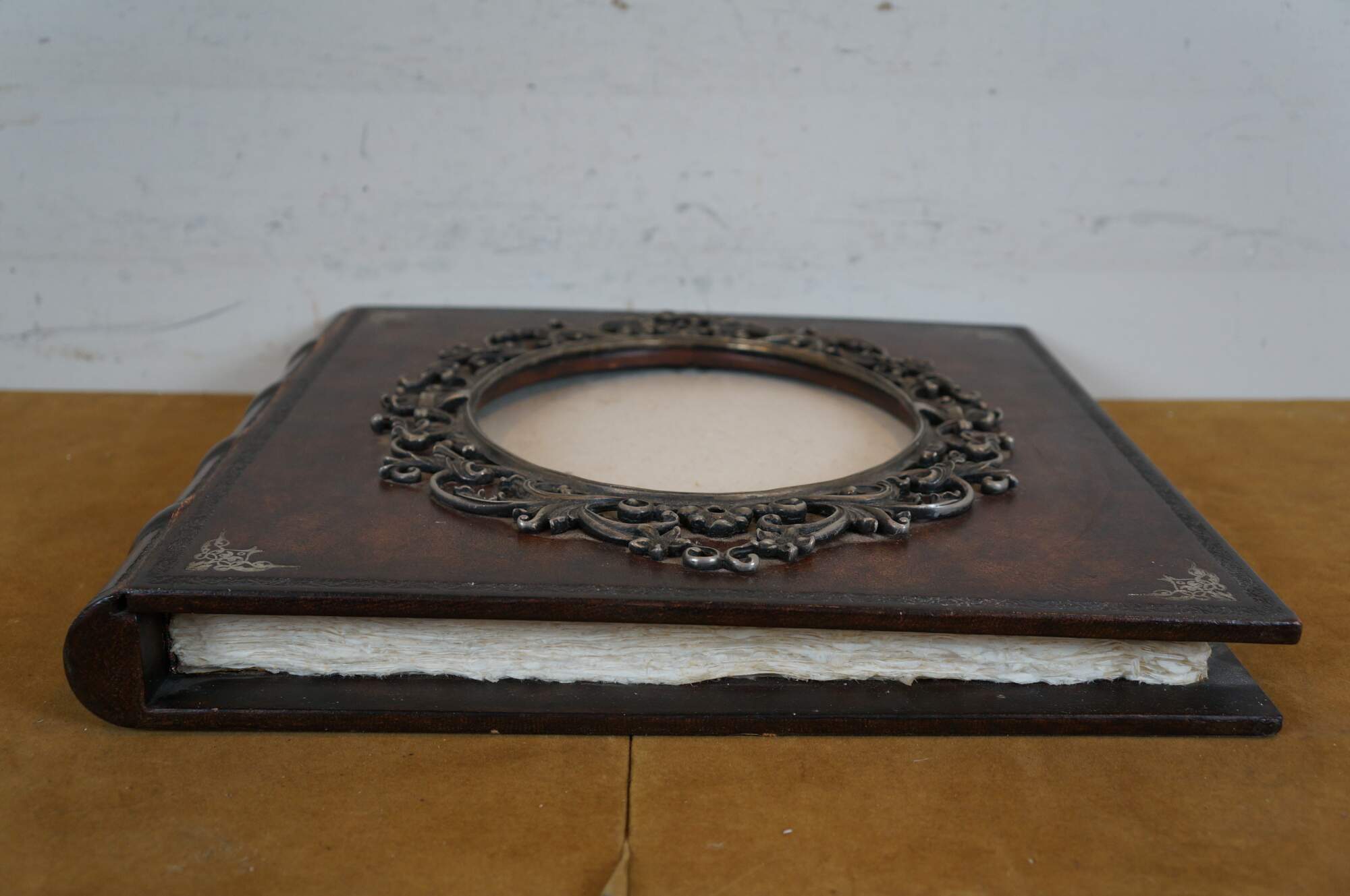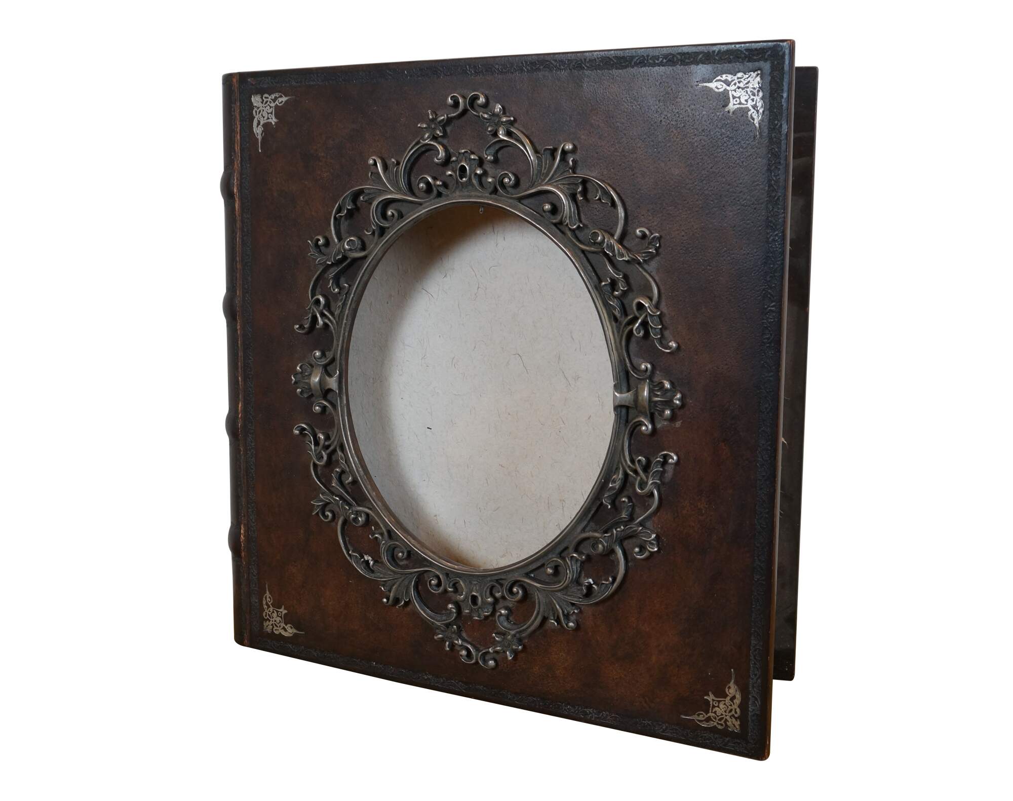 Late 20th century Maitland Smith tooled leather memories photo album scrap book with wooden spine and stamped gilt details. Front of cover incorporates an oval photo space with an ornate silverplate foliate picture frame. Contains approximately 75 blank pages.