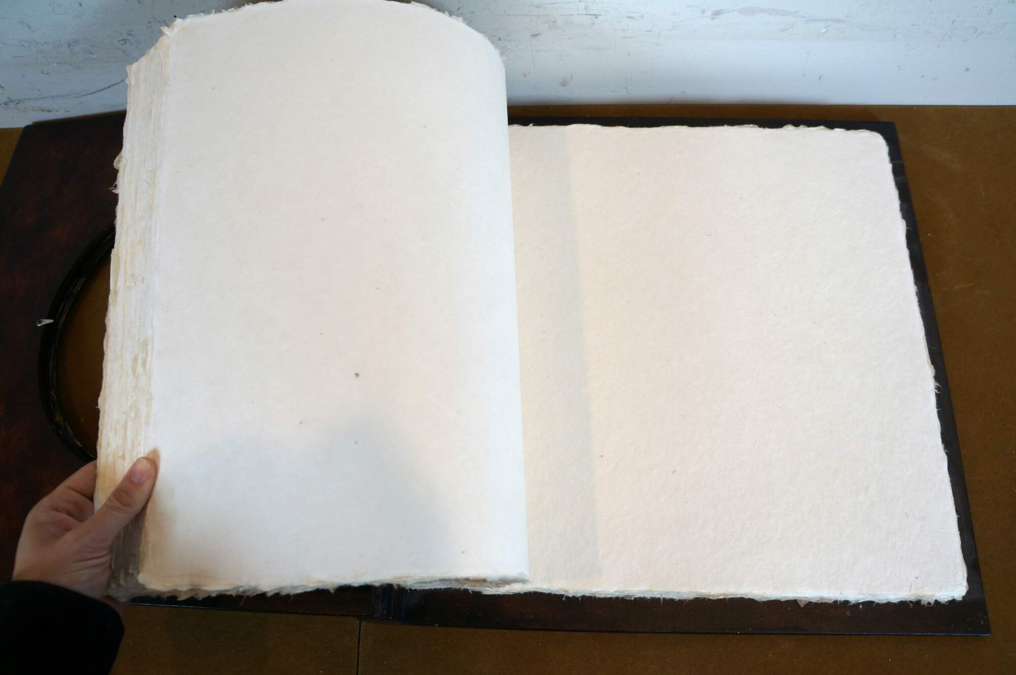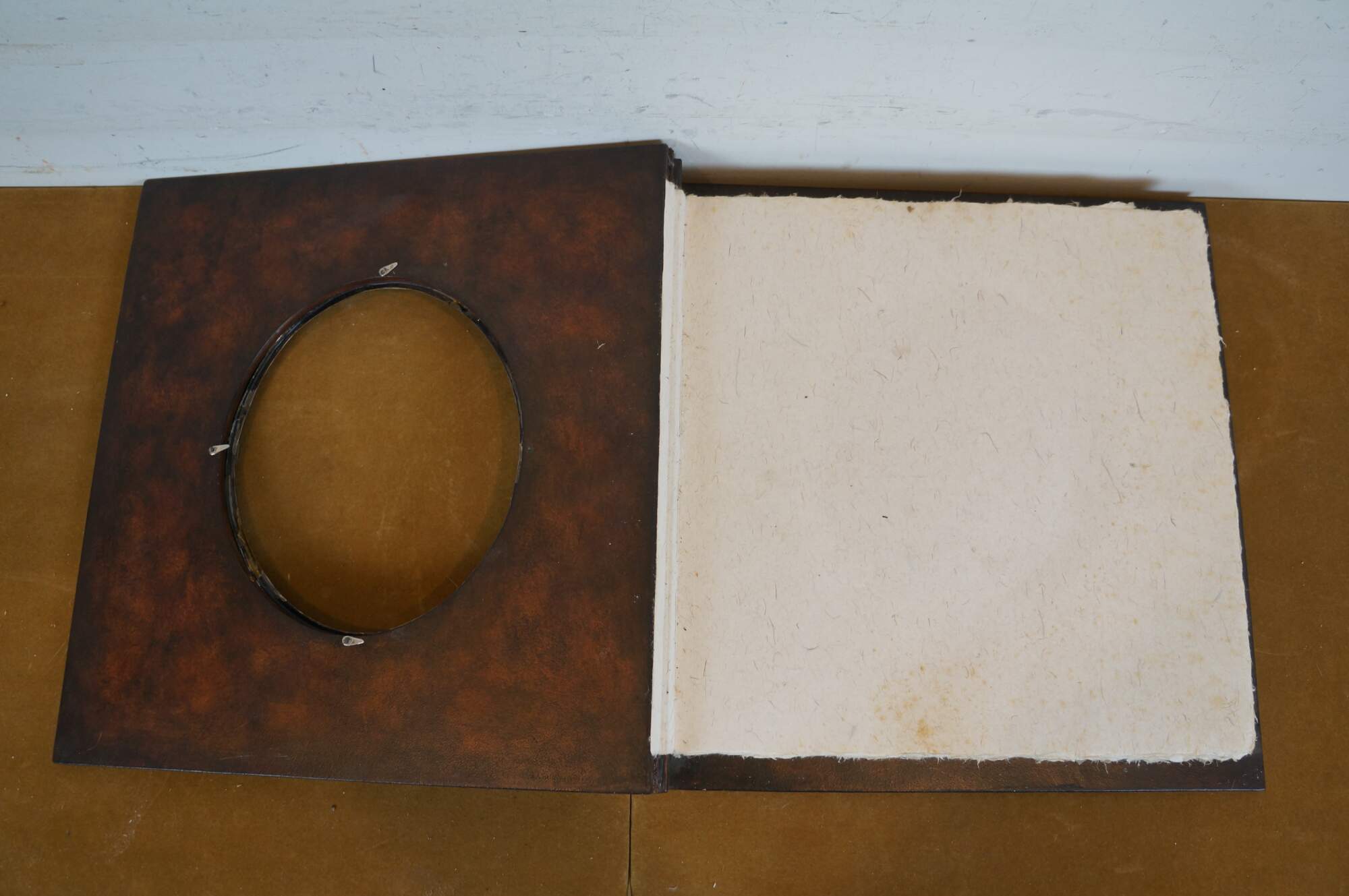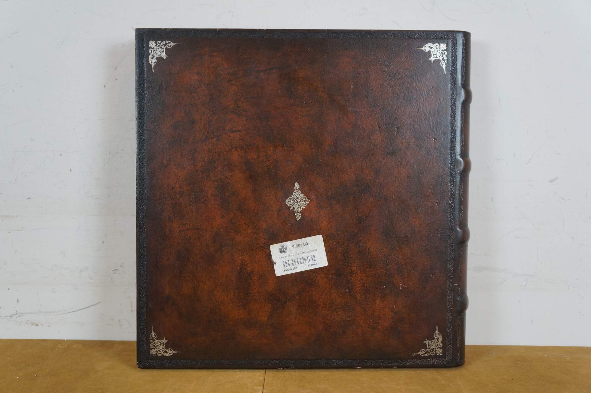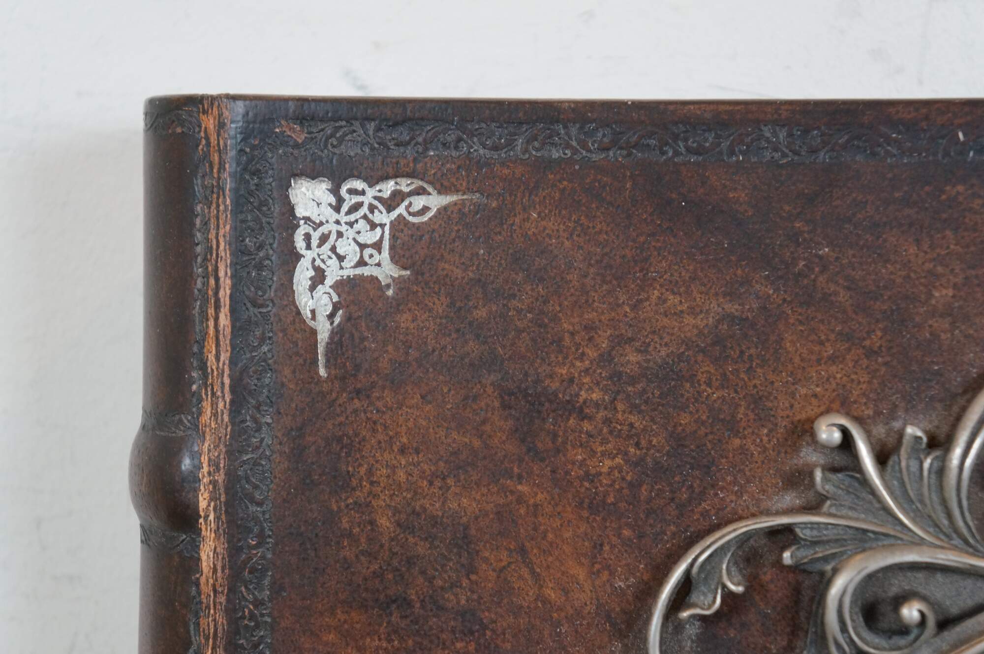 Late 20th century Maitland Smith tooled leather memories photo album scrap book with wooden spine and stamped gilt details. Front of cover incorporates an oval photo space with an ornate silverplate foliate picture frame. Contains approximately 75 blank pages.