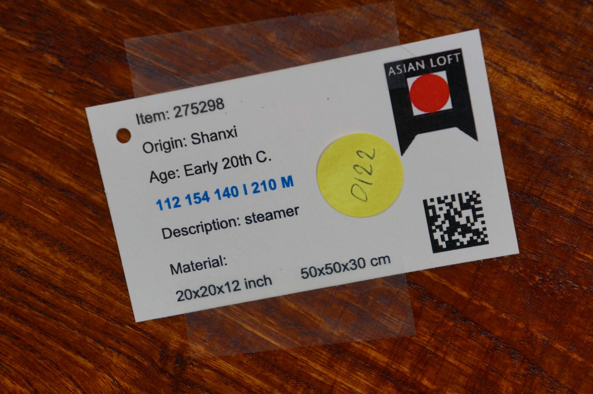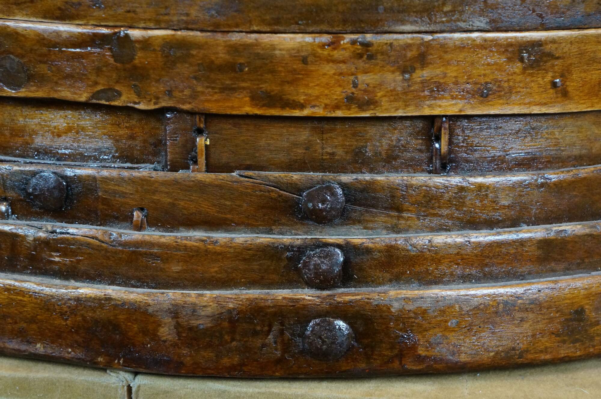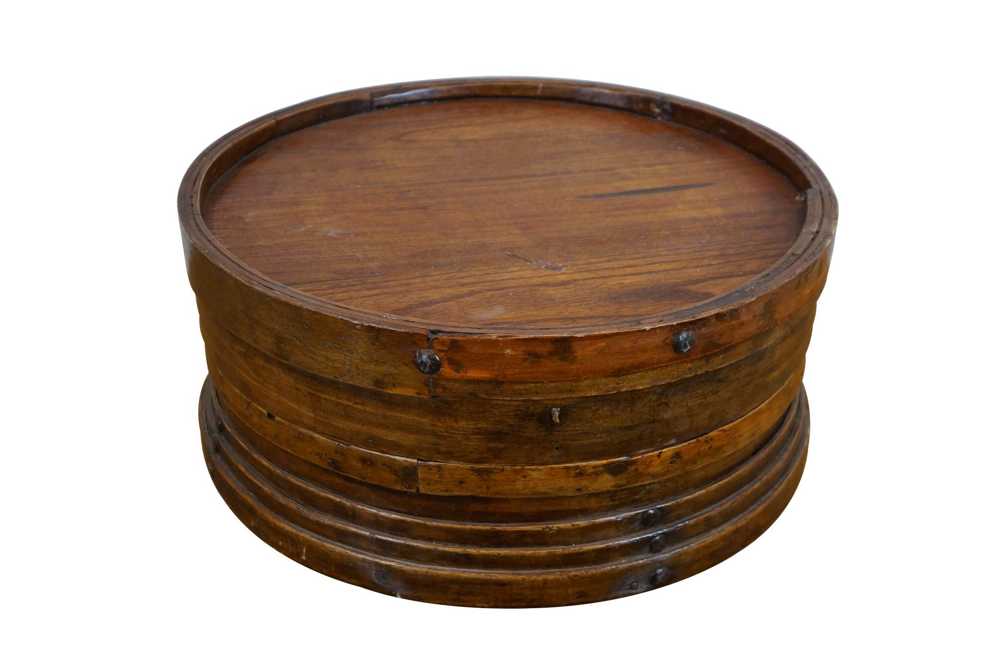 Early 20th century Shanxi wooden storage box used for serving steamed dumplings / food at family gatherings. This steamer box features traditional round, rustic, bentwood construction with metal nails / rivets.