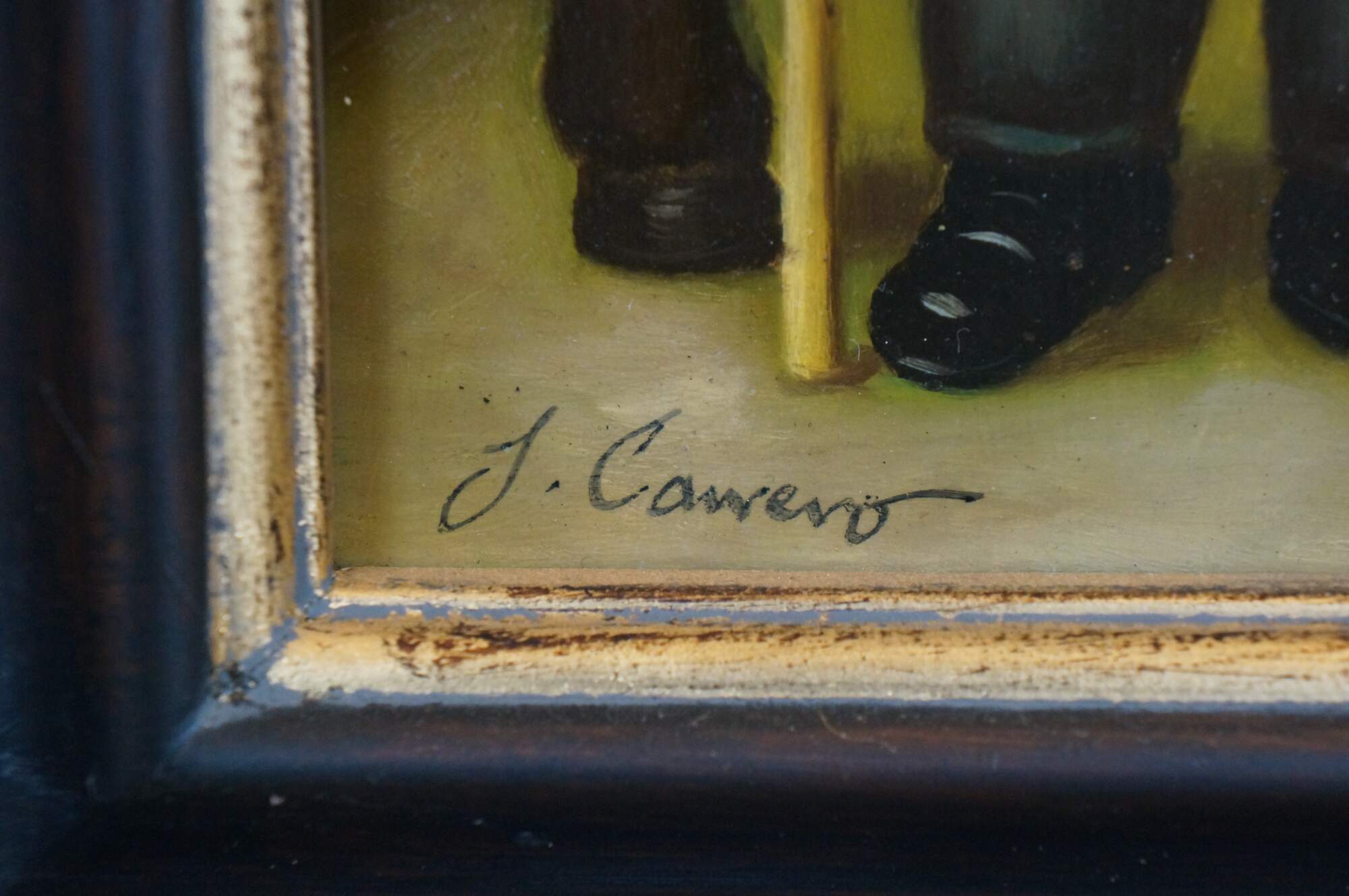 Late 20th century Timeless Treasures oil on board painting styled after "Picador y caballo" (Picador and Horse) by Fernando Botero (original painted in 1988, cureently housed at Museo de Antioquia, Medellín, Colombia). Signed in lower left corner. Includes Certificate of Authenticity Number AFD131528. Frame made in China.