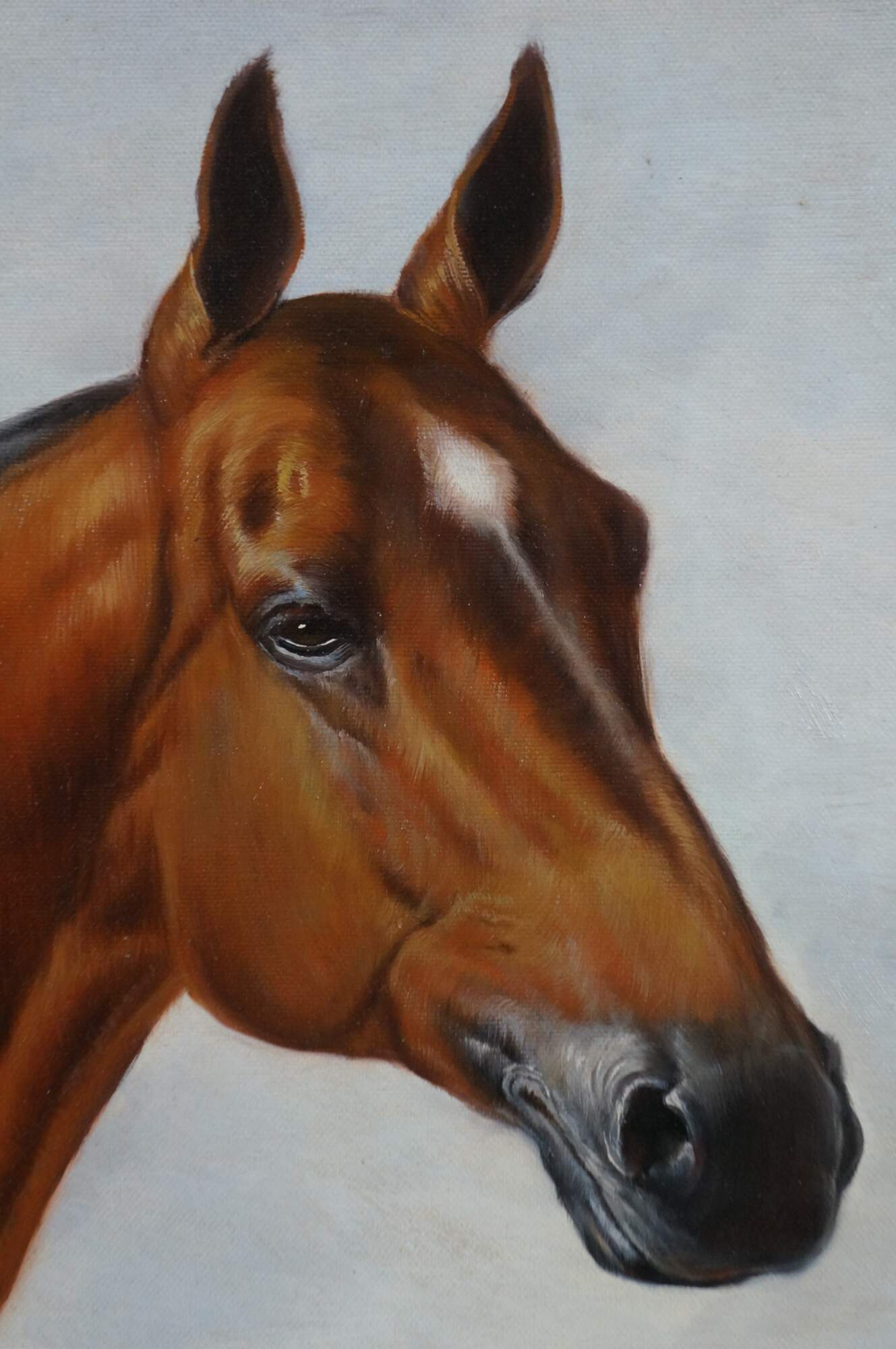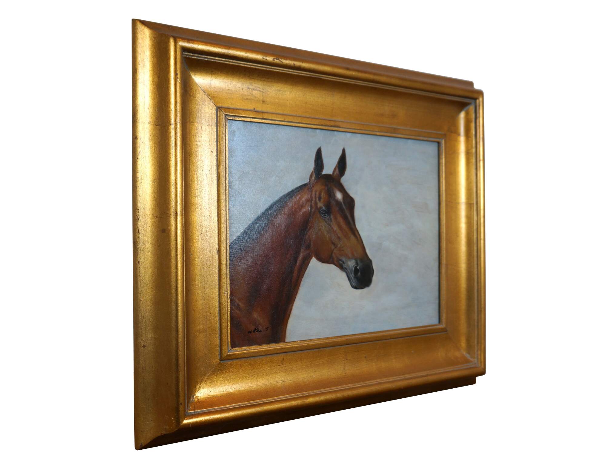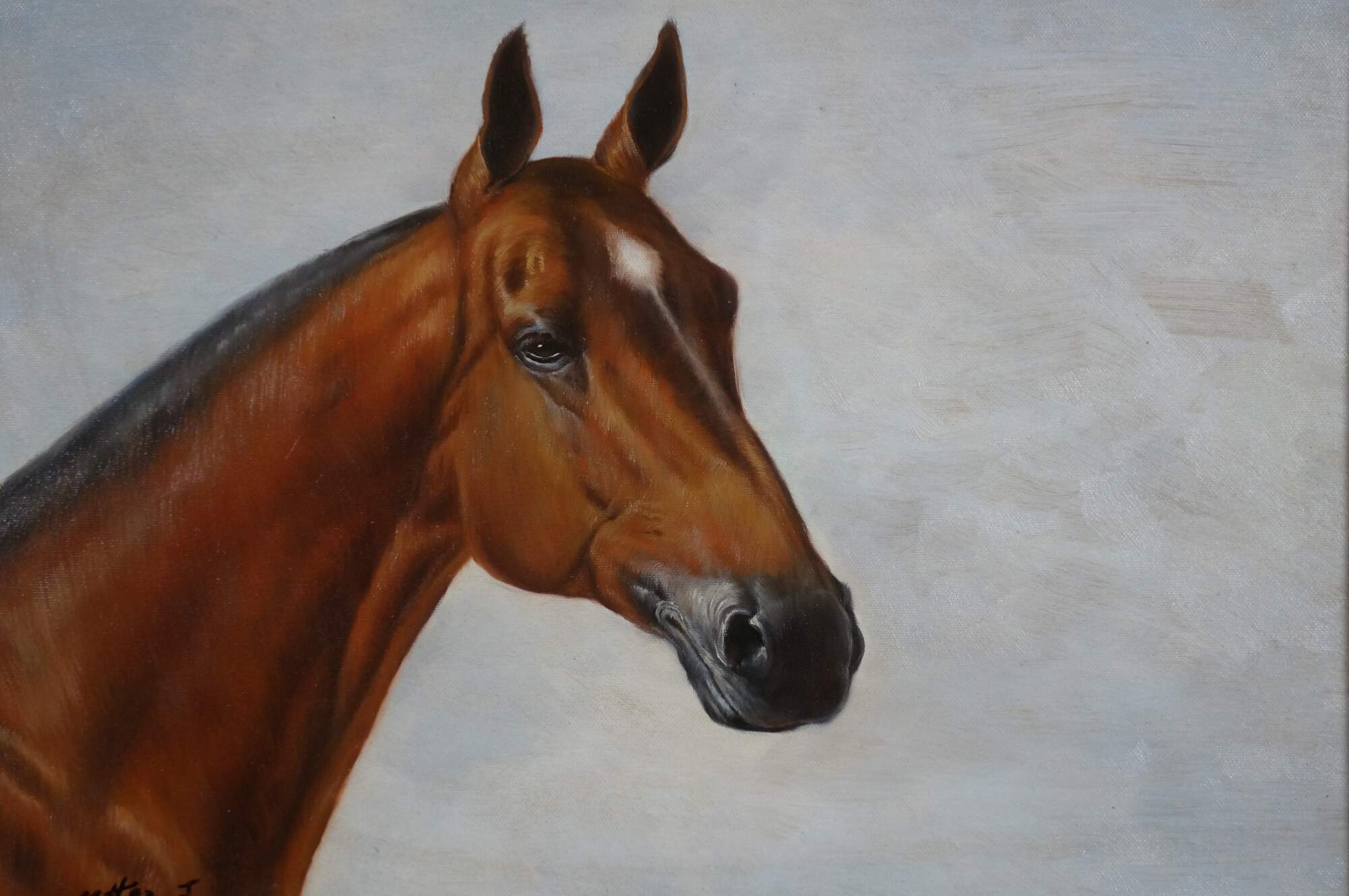Late 20th century oil painting on canvas of the head / bust of a brown horse with black mane and muzzle, and a white blaze on the forehead. Signed in lower left corner (Utter J). Beveled gilt wood frame.