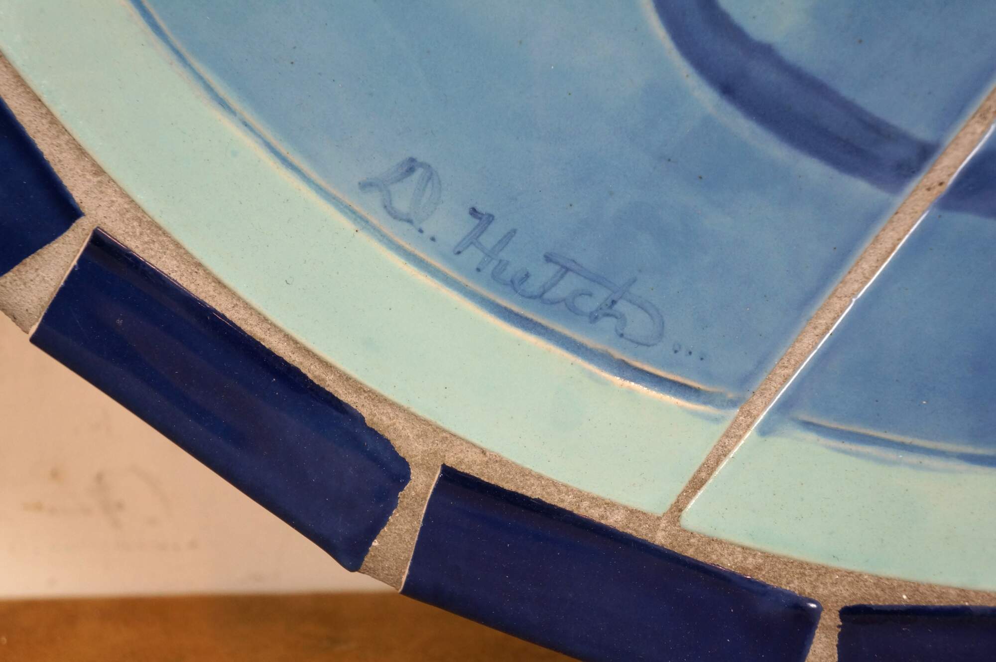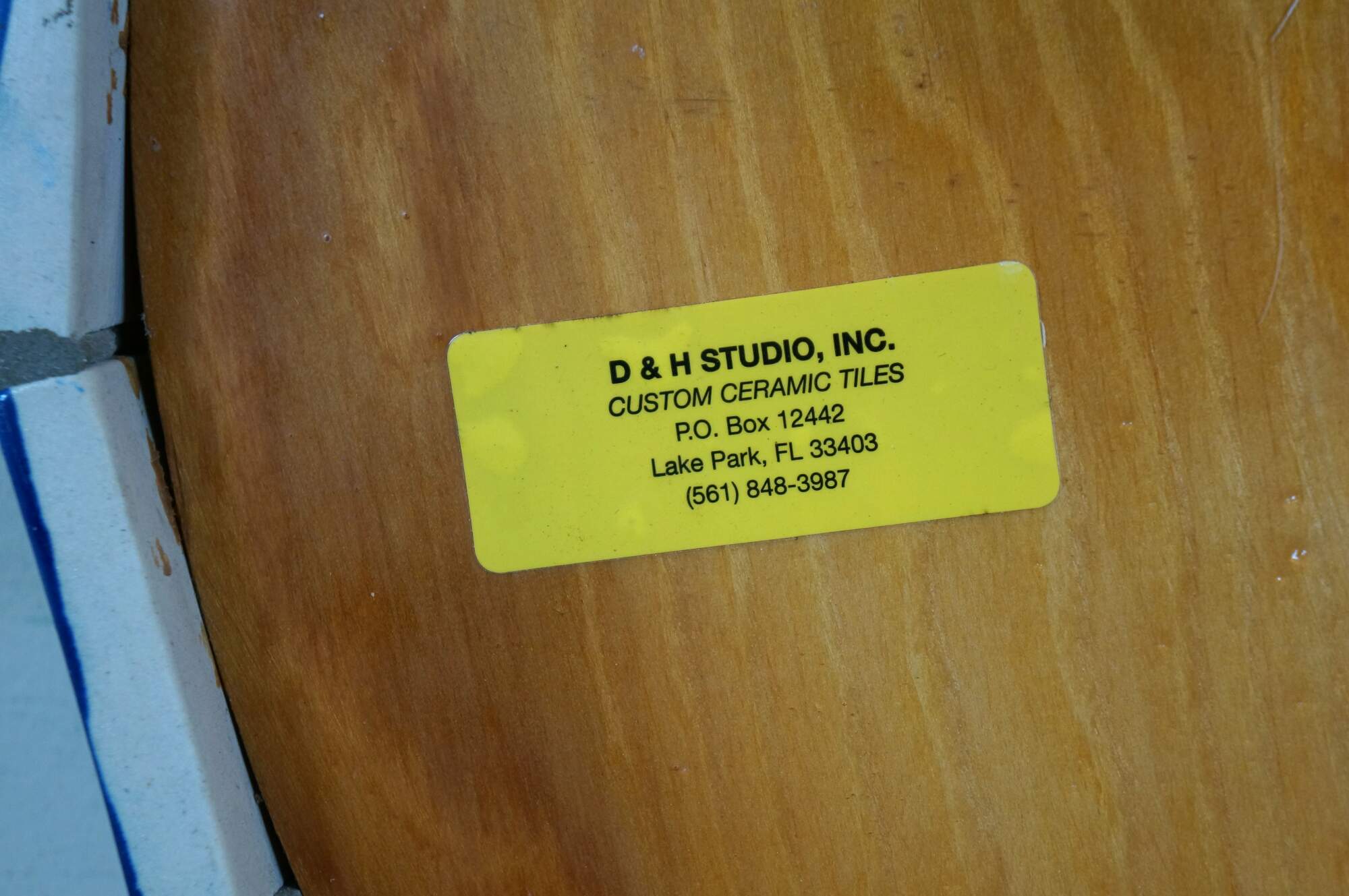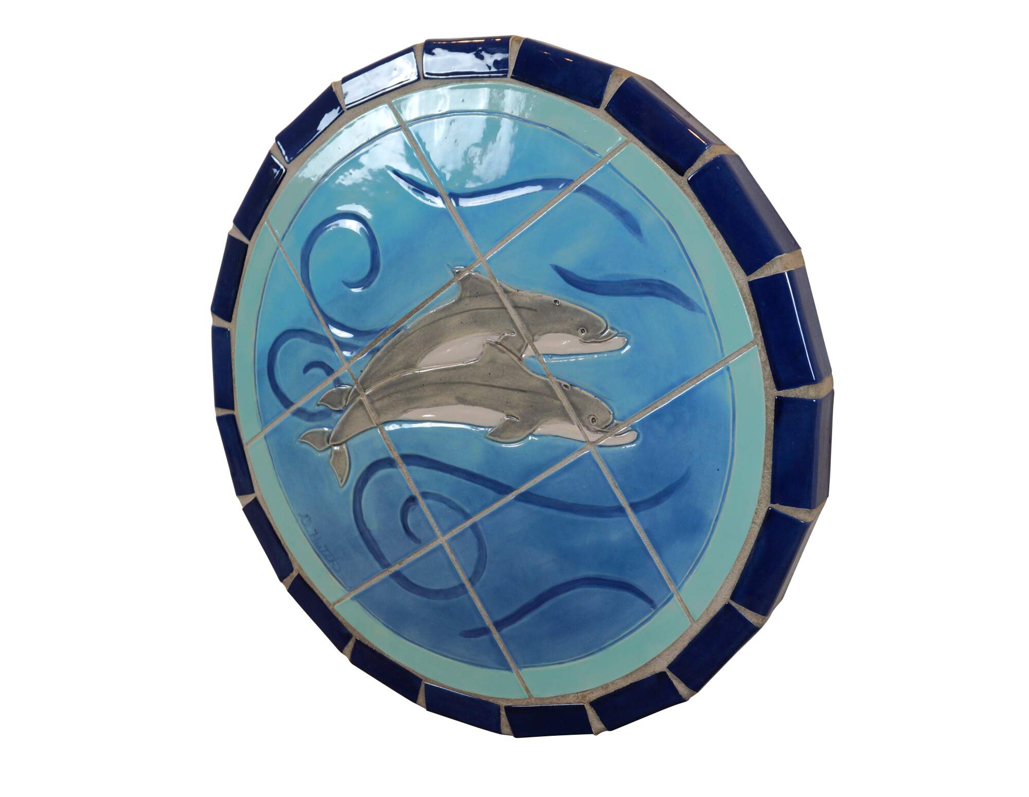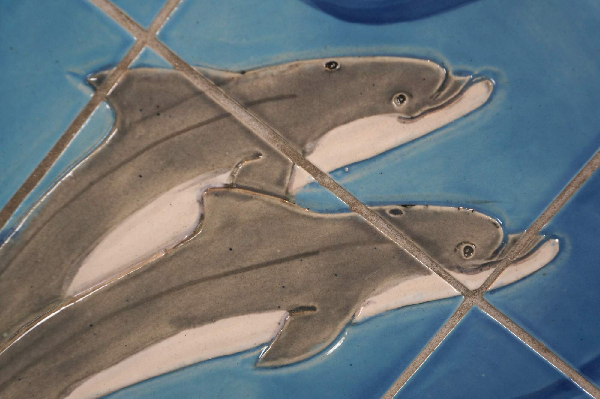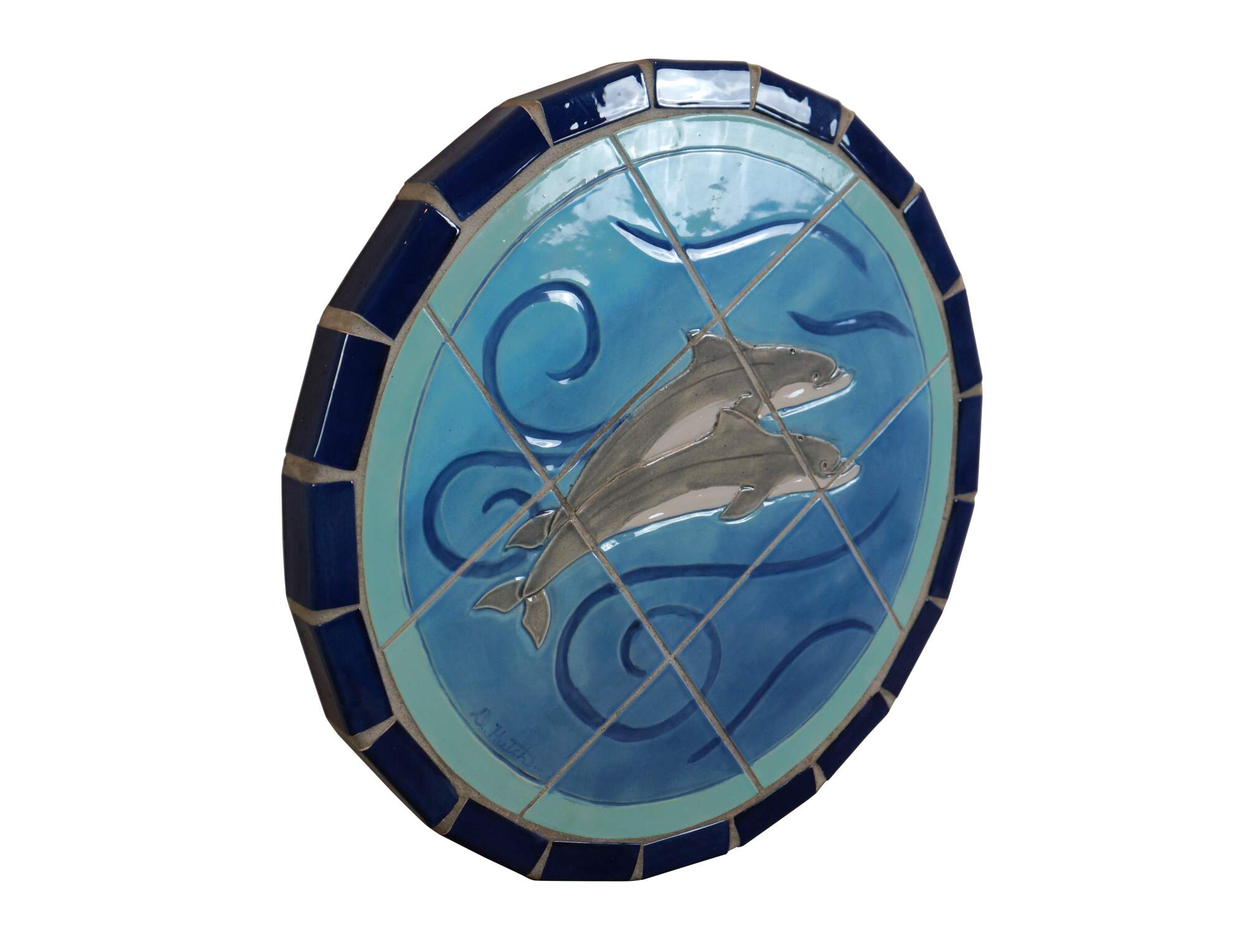 Ceramic tile art wall medallion depicting a pair of dolphins swimming in the ocean. Signed D. Hutch. D&H Studio Inc - Custom Ceramic Tiles - Lake Park, FL.