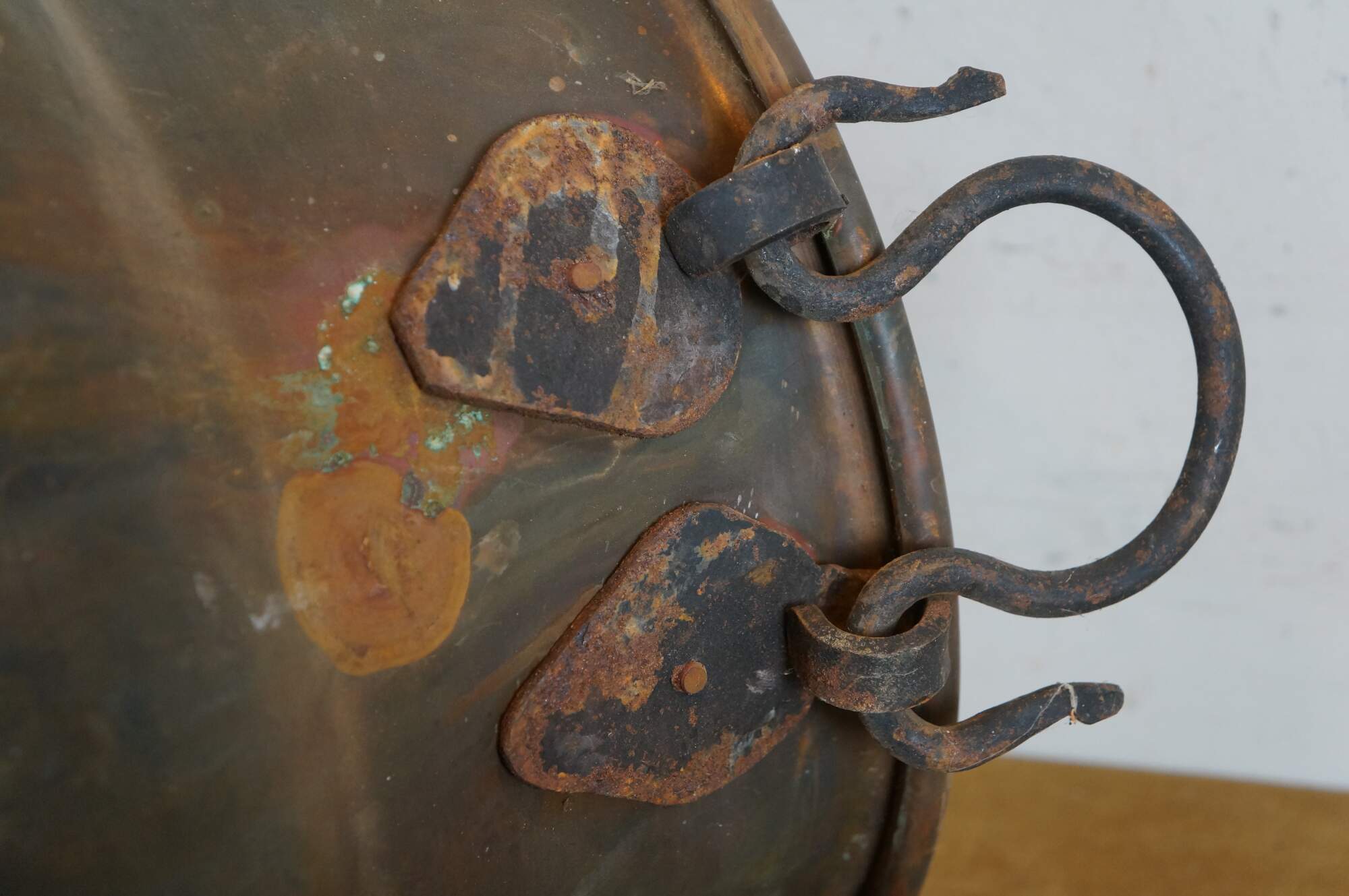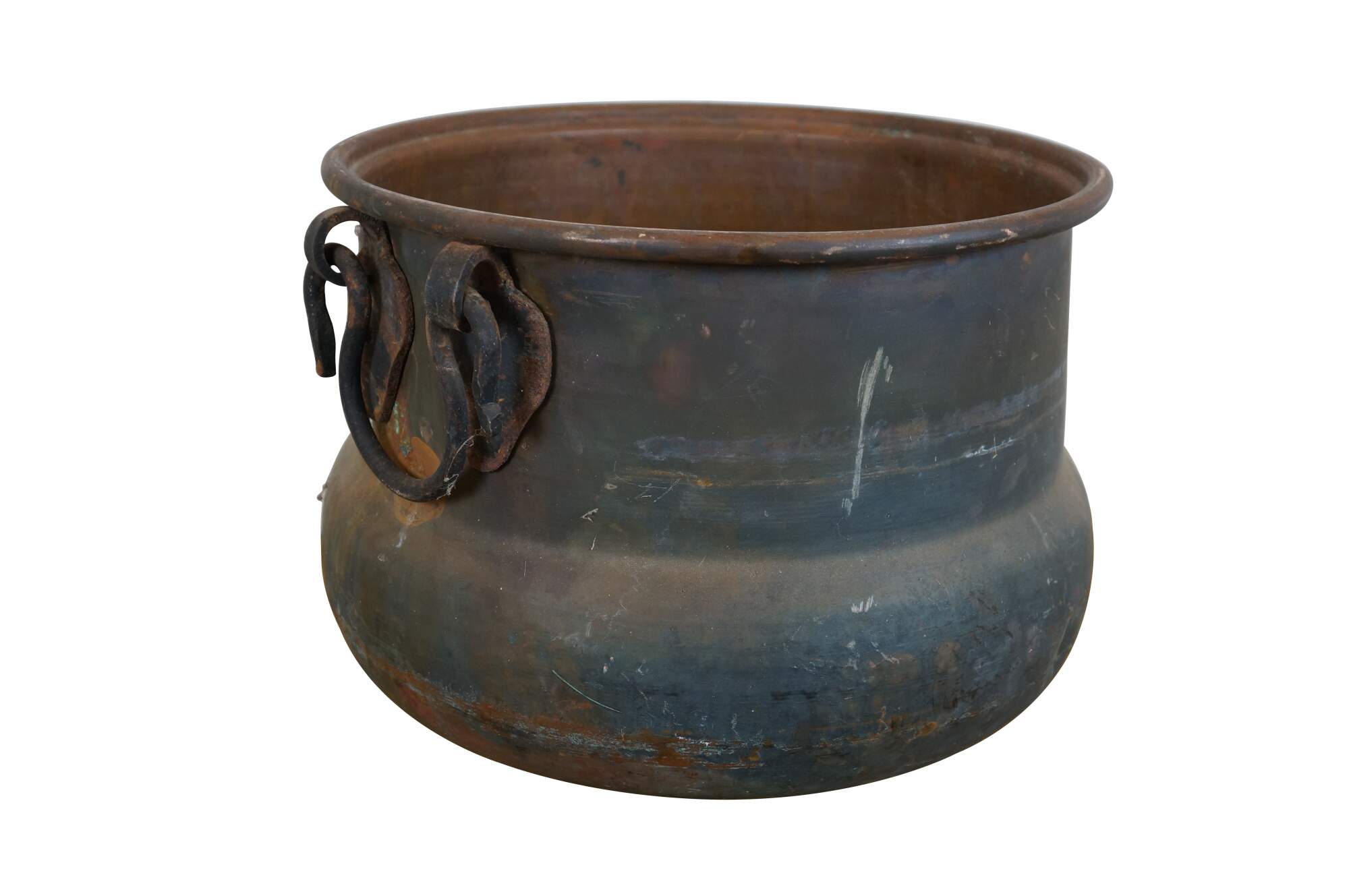 Antique hammered copper cauldron/cooking pot with rolled rim and two ox-bow shaped / rattail iron handles.