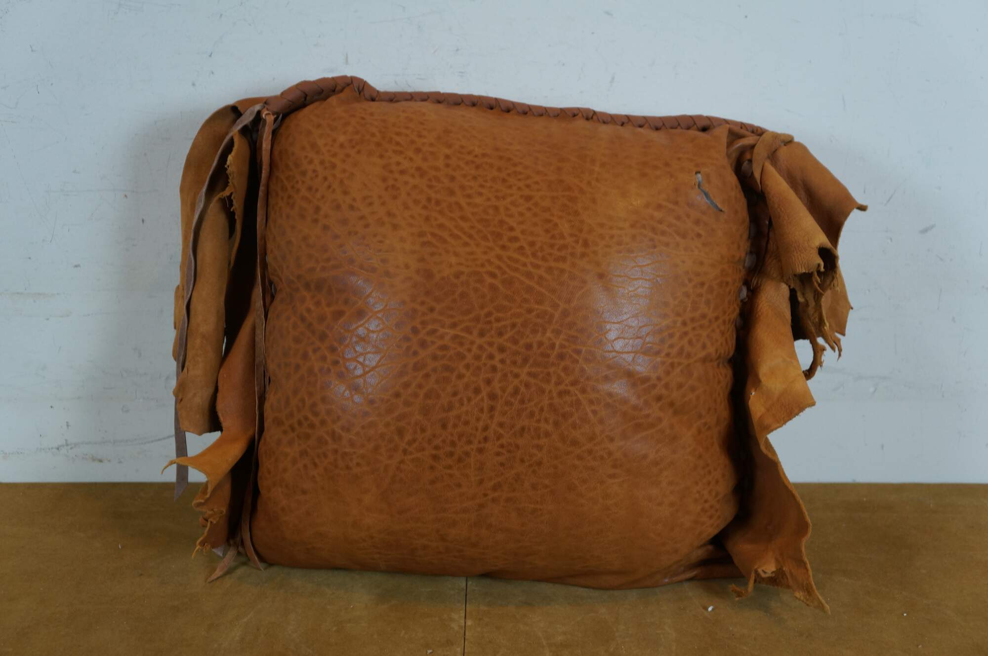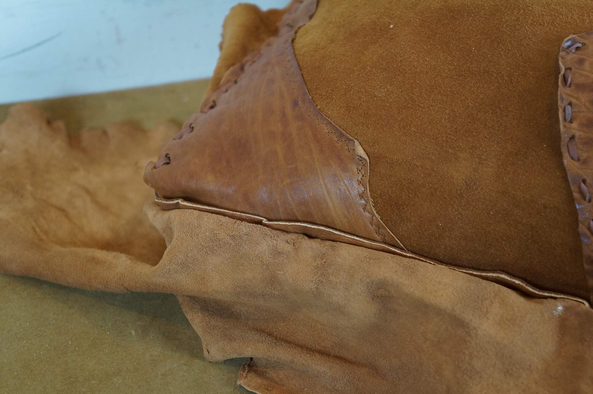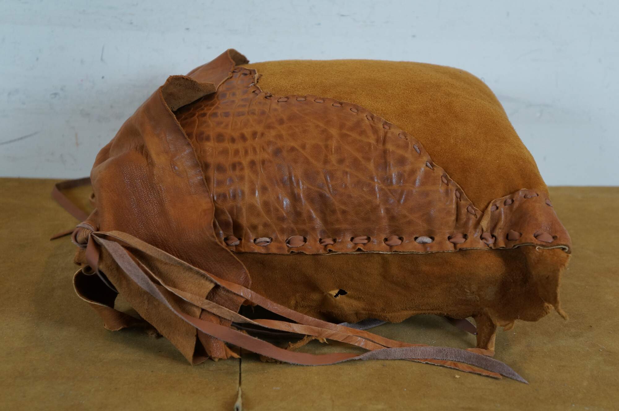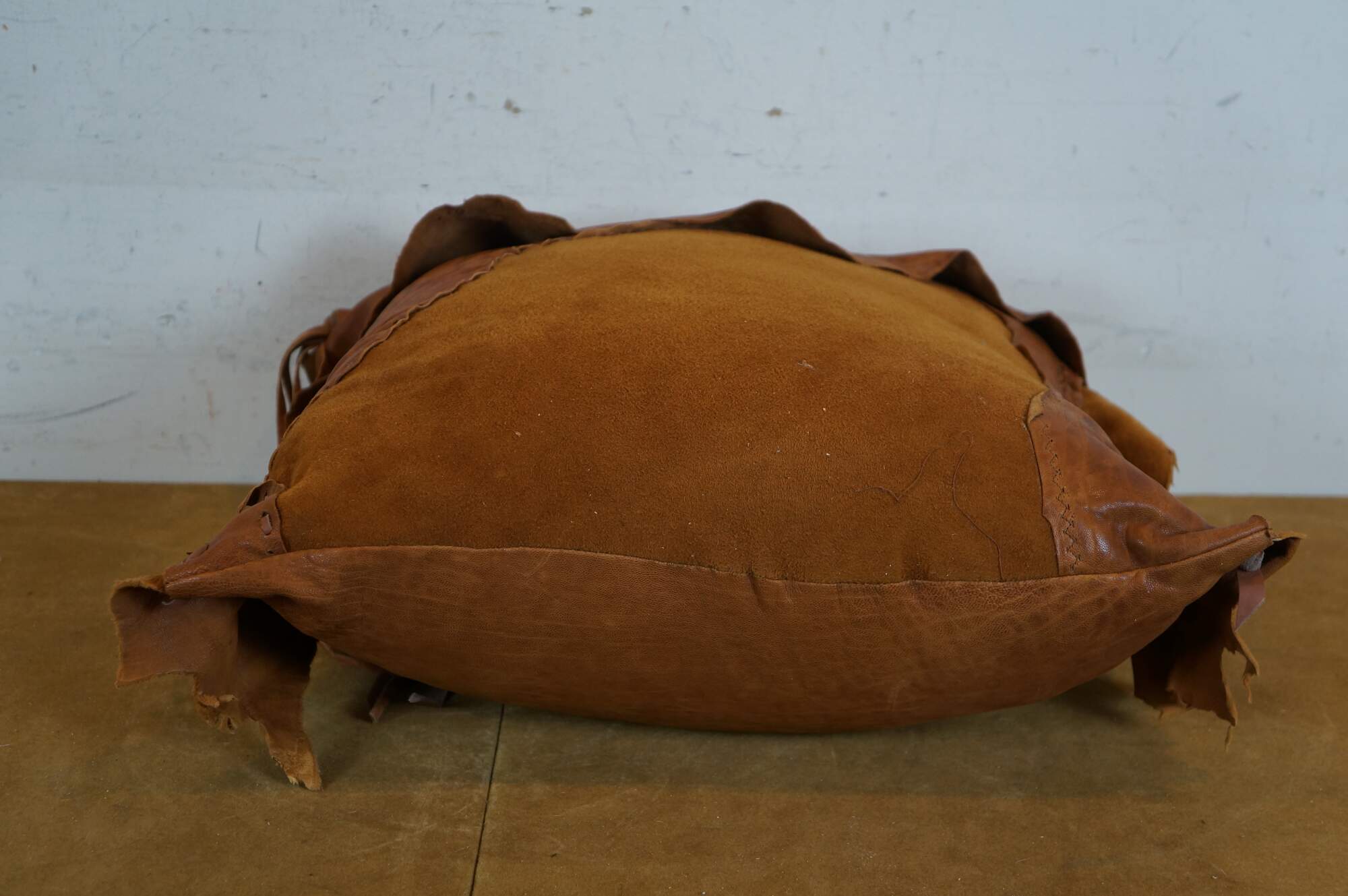 Rustic Southwestern / Native American brown leather throw pillow, fashioned with a patchwork of suede and textured leather with a rough cut edge, decorative stitching and tassel corners. Fiber filled.