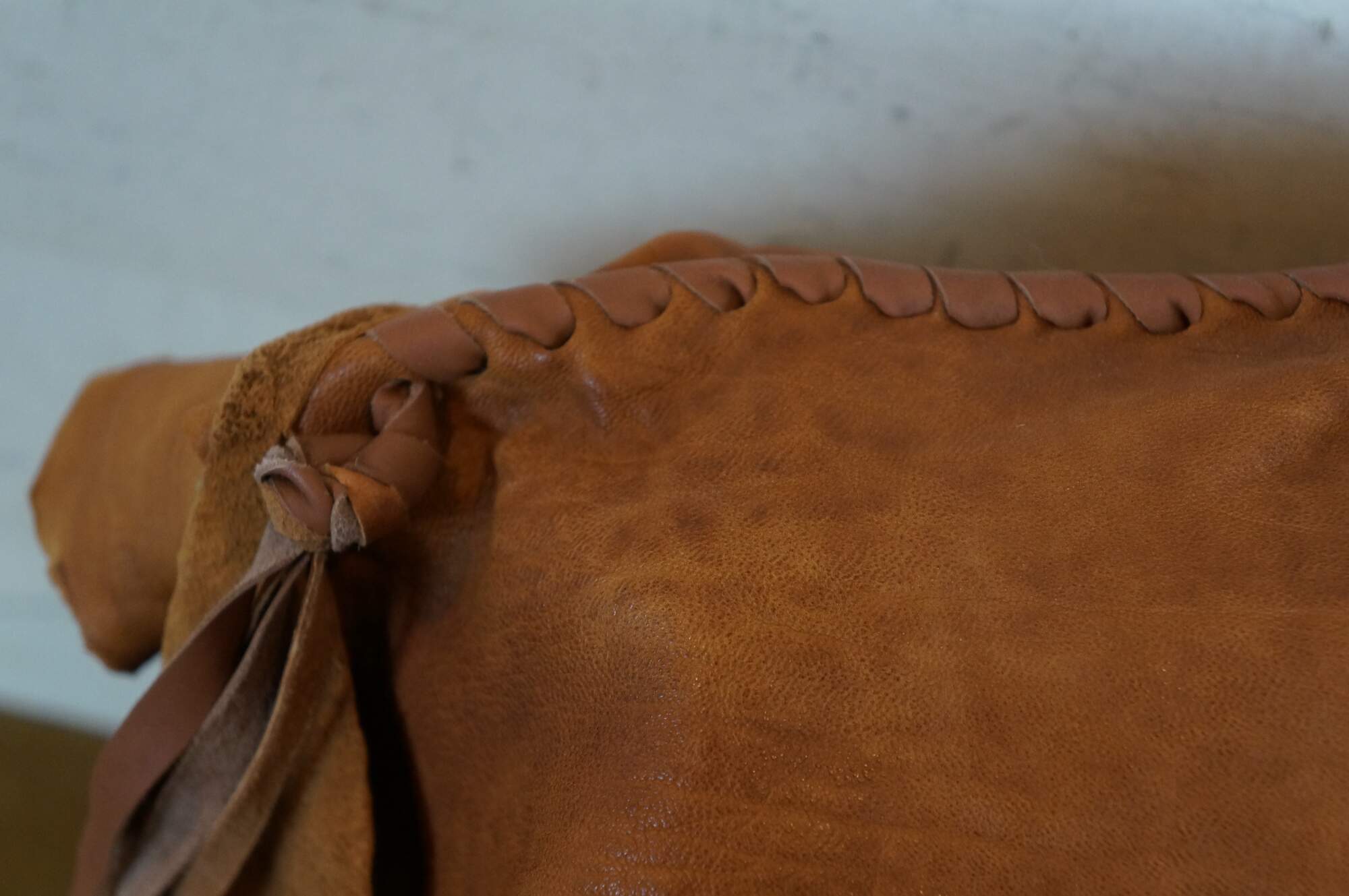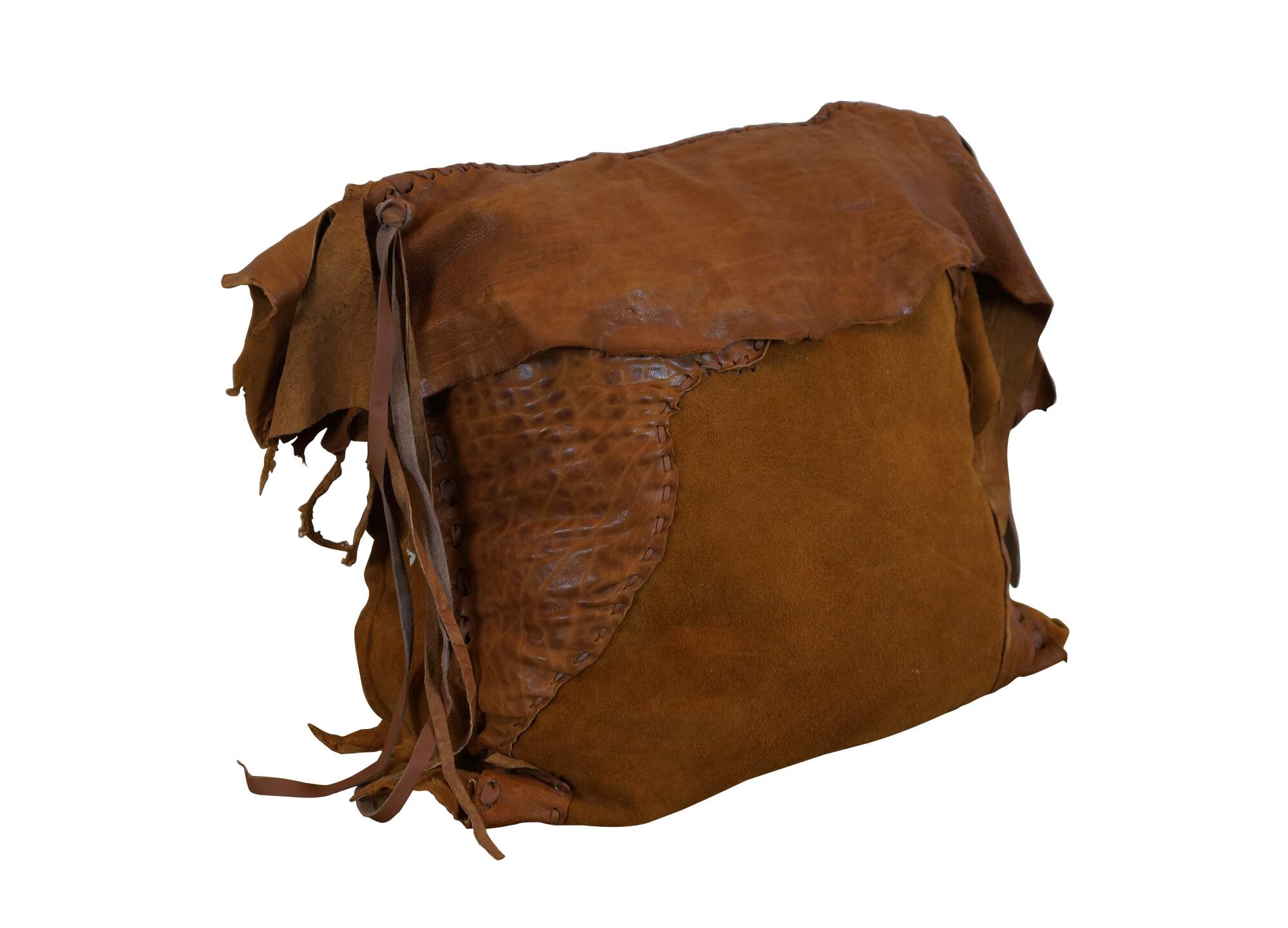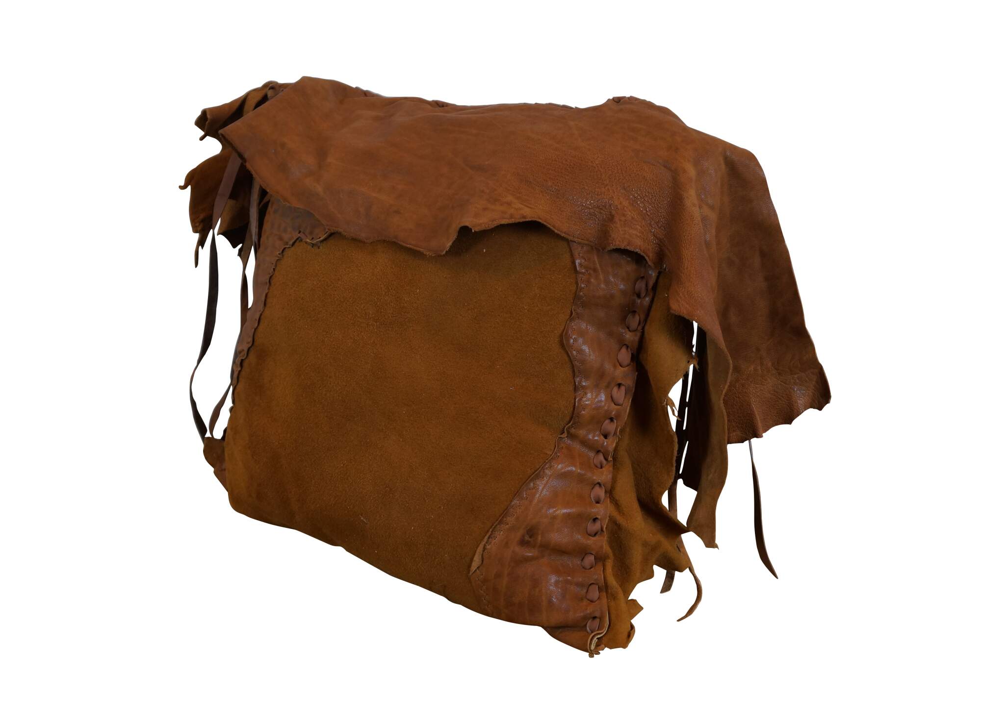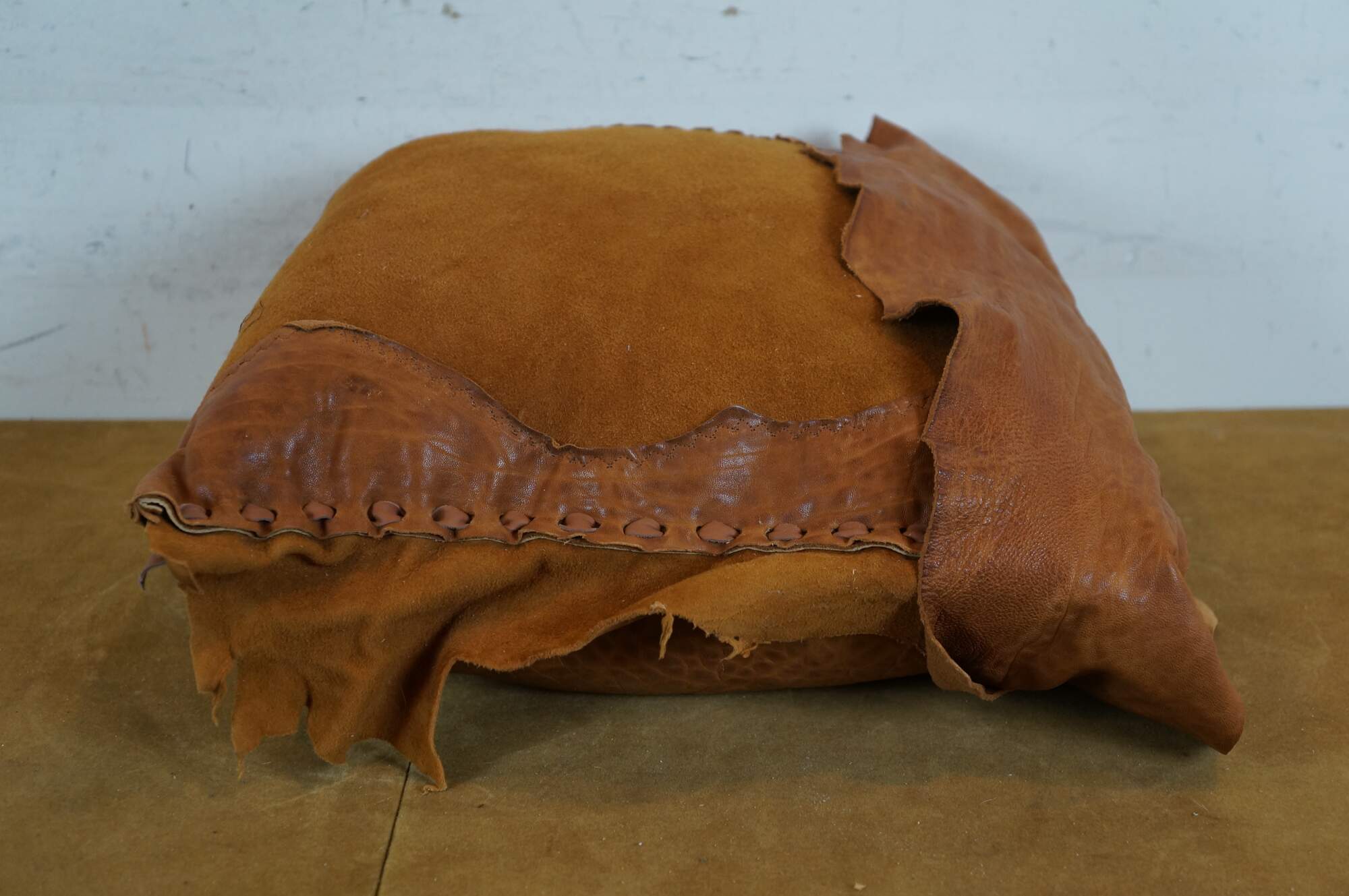 Rustic Southwestern / Native American brown leather throw pillow, fashioned with a patchwork of suede and textured leather with a rough cut edge, decorative stitching and tassel corners. Fiber filled.