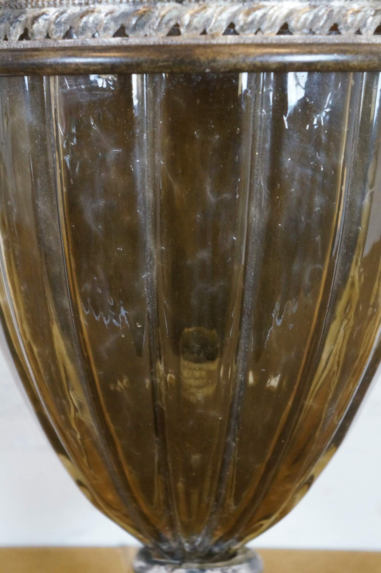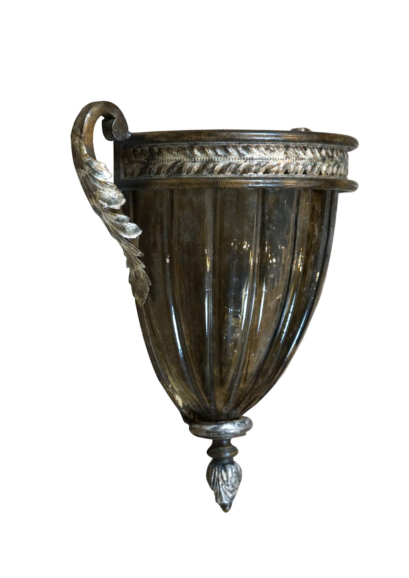 2005 Fine Art Lamps illuminated wall sconce shaped like a half-round neoclassical amphora or urn in fluted brown glass, with metal folaite acanthus handles, trim and finial with a bronze and silver finish.