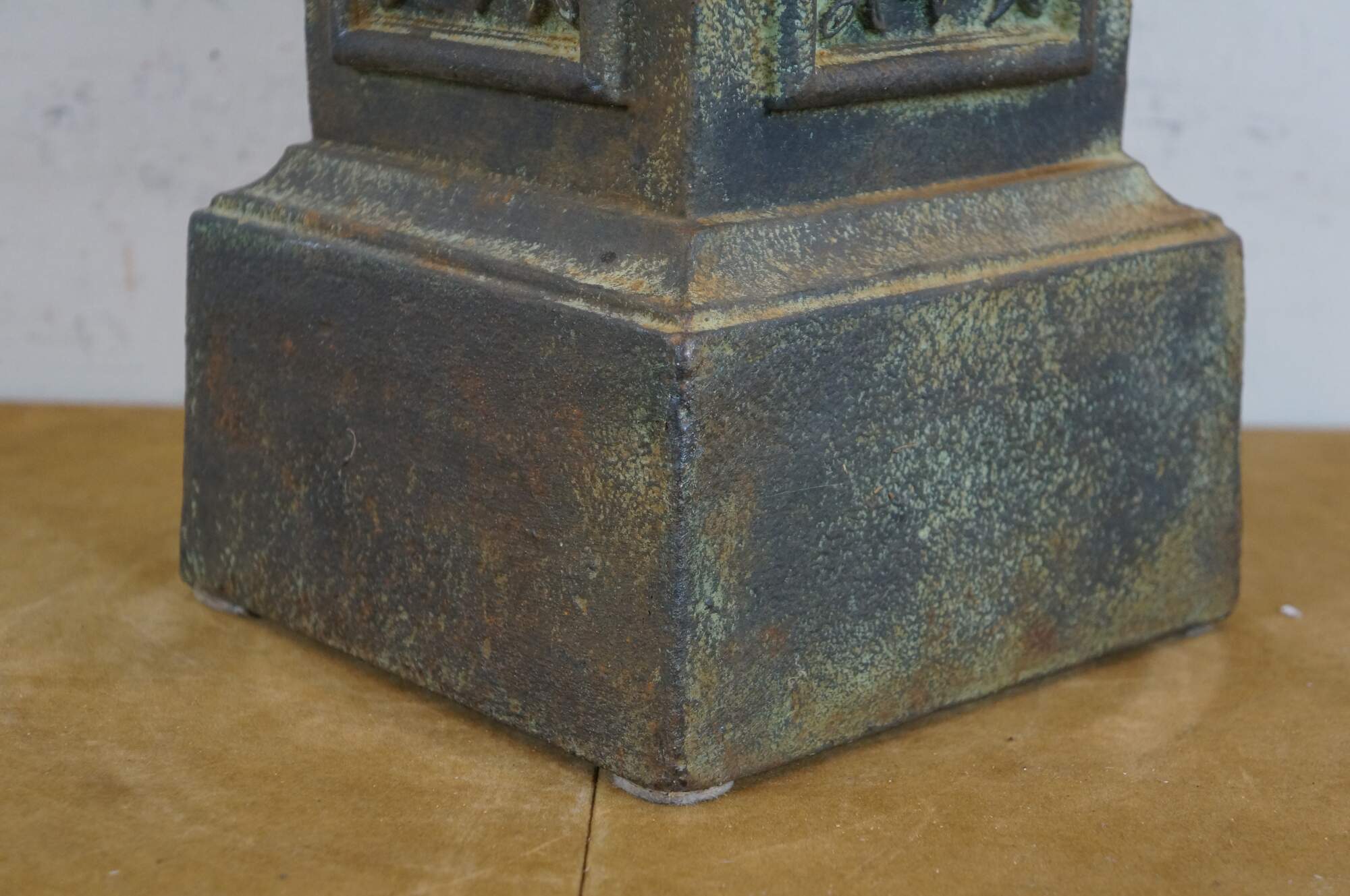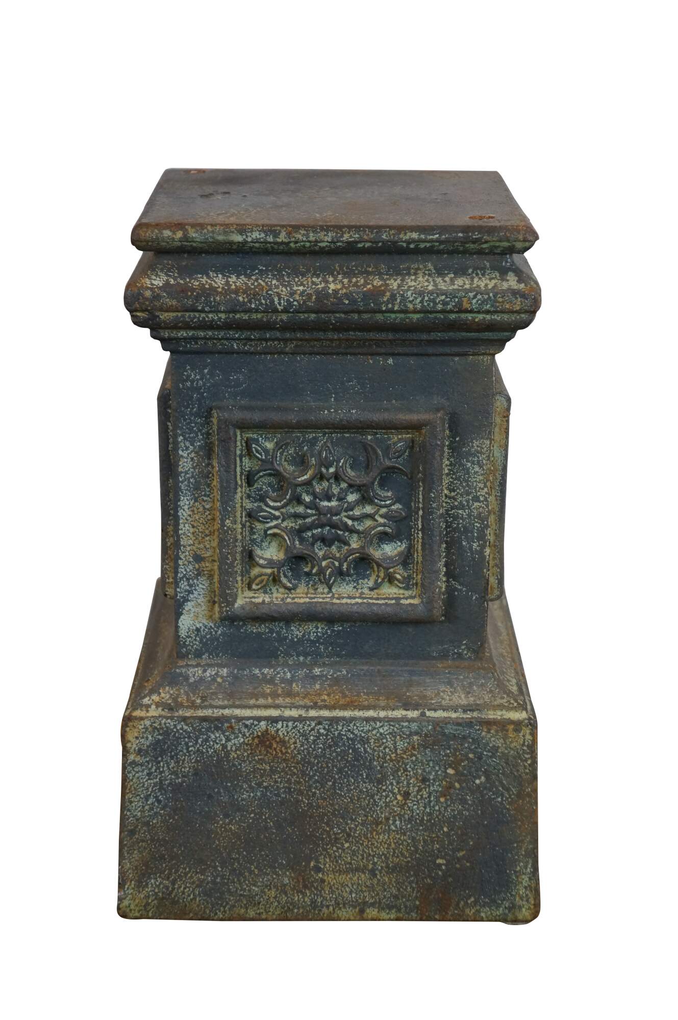 Cast iron square column shaped plinth with floral panels on each side. Perfect for use as a stand for plants, candles, or sculptures, indoors or out.
