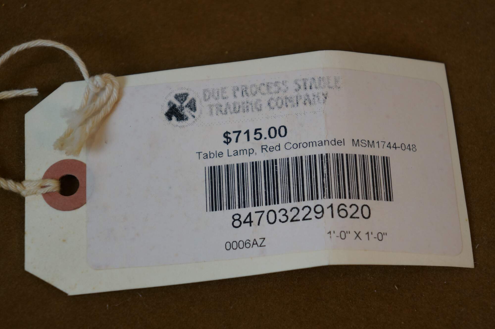 Maitland Smith, circa 1990s, vase / vessel / urn / jug shaped Chinoiserie table lamp featuring red coromandel style lacquer finish with a painted landscape / fishing scene in gold and balck, and black tesselated stone base. Includes harp, white paper shade and brass Chinese finial.
