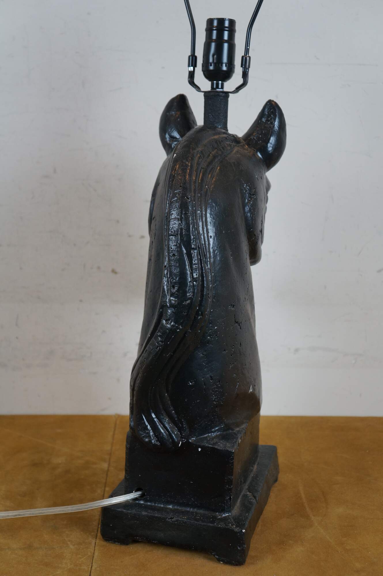 Black painted ceramic table lamp in the shape of a horse head on a rectangular plinth. Includes harp and flame shaped finial. Made in China.