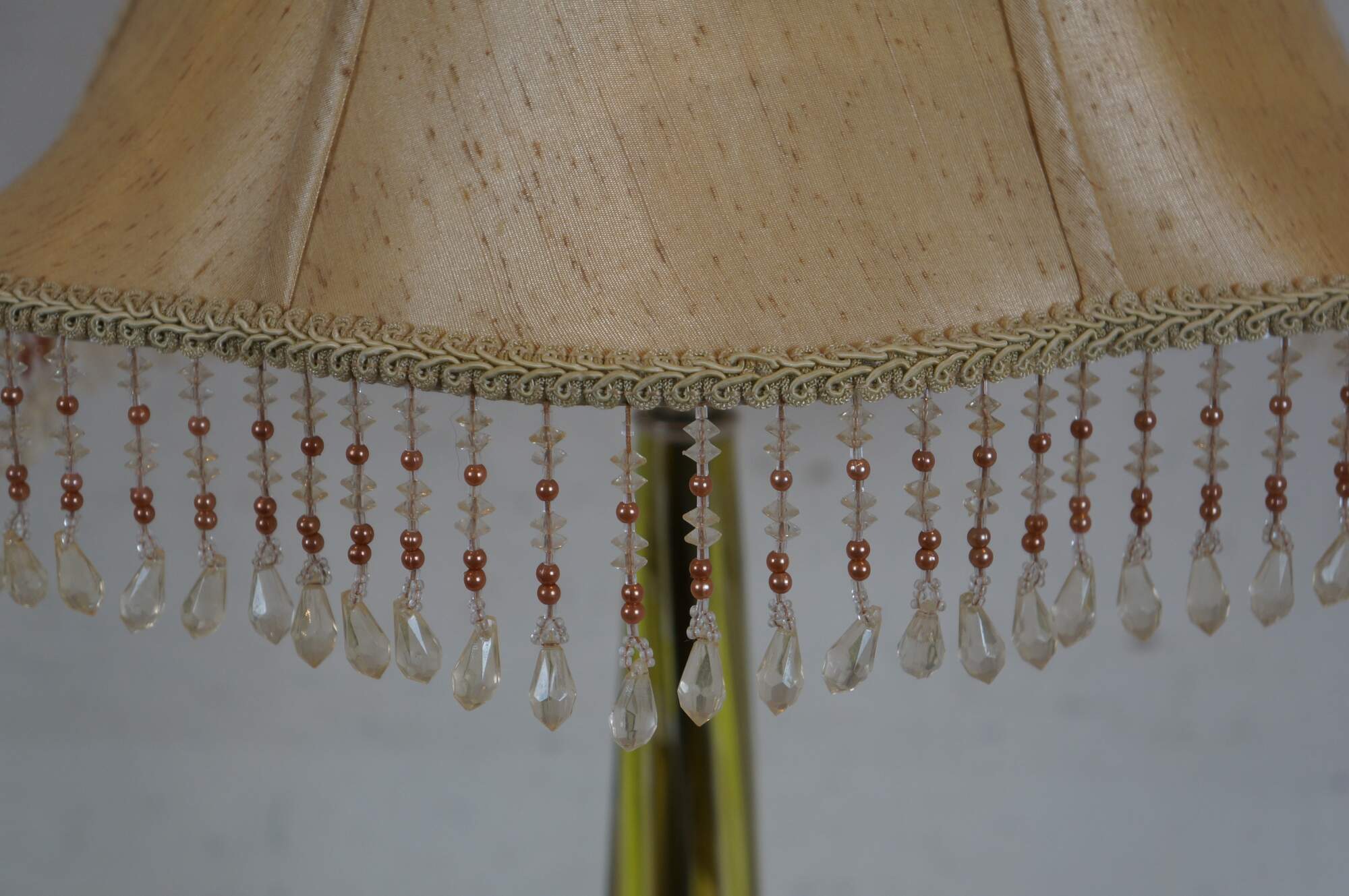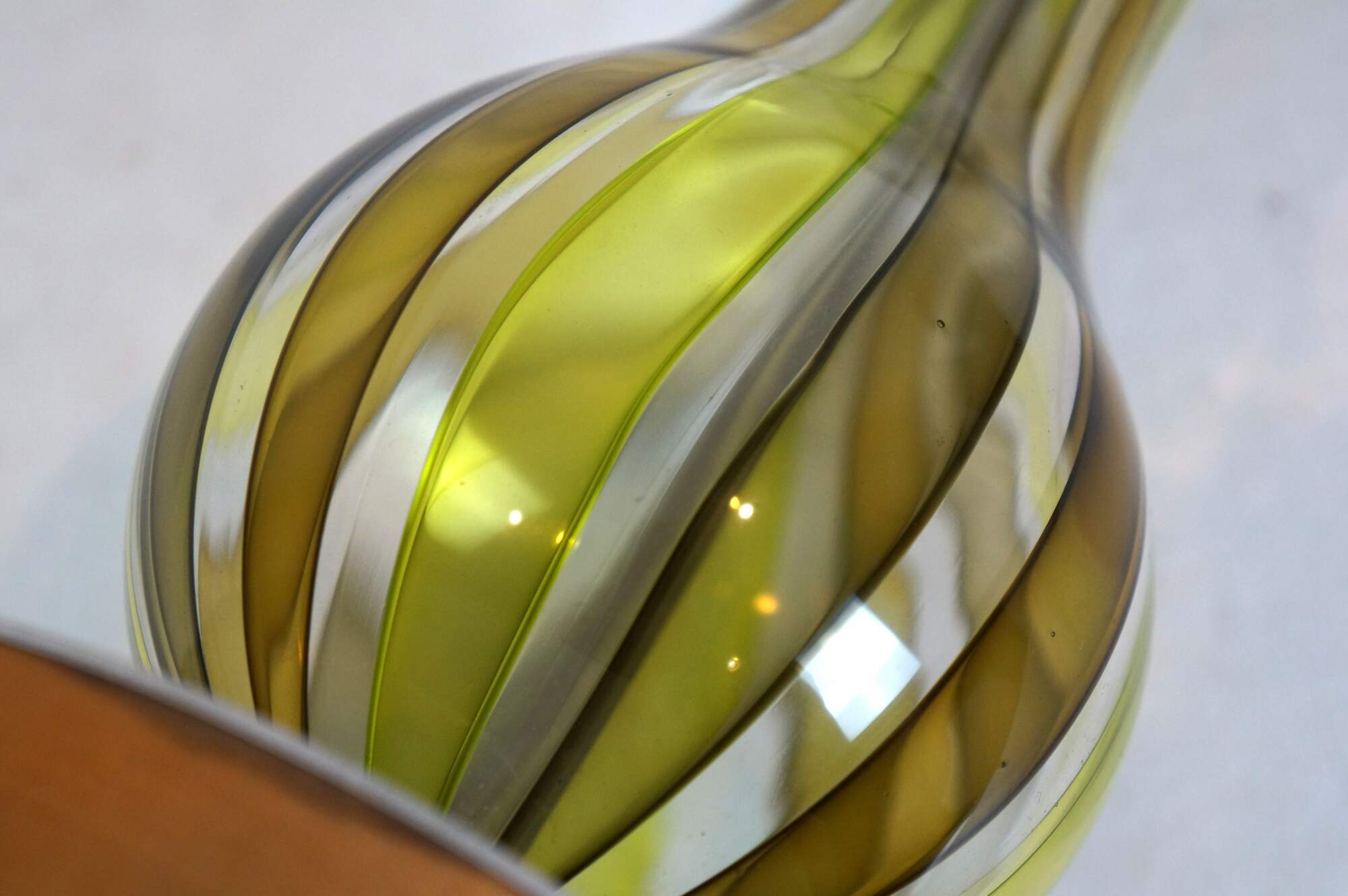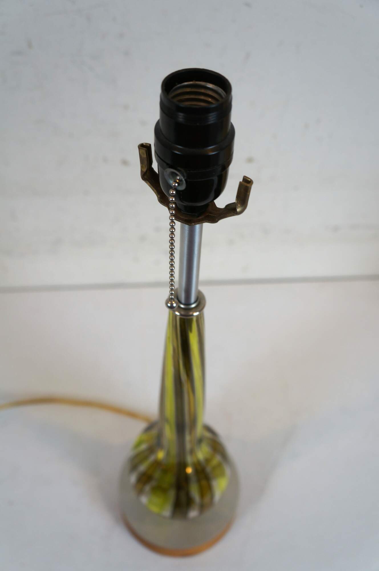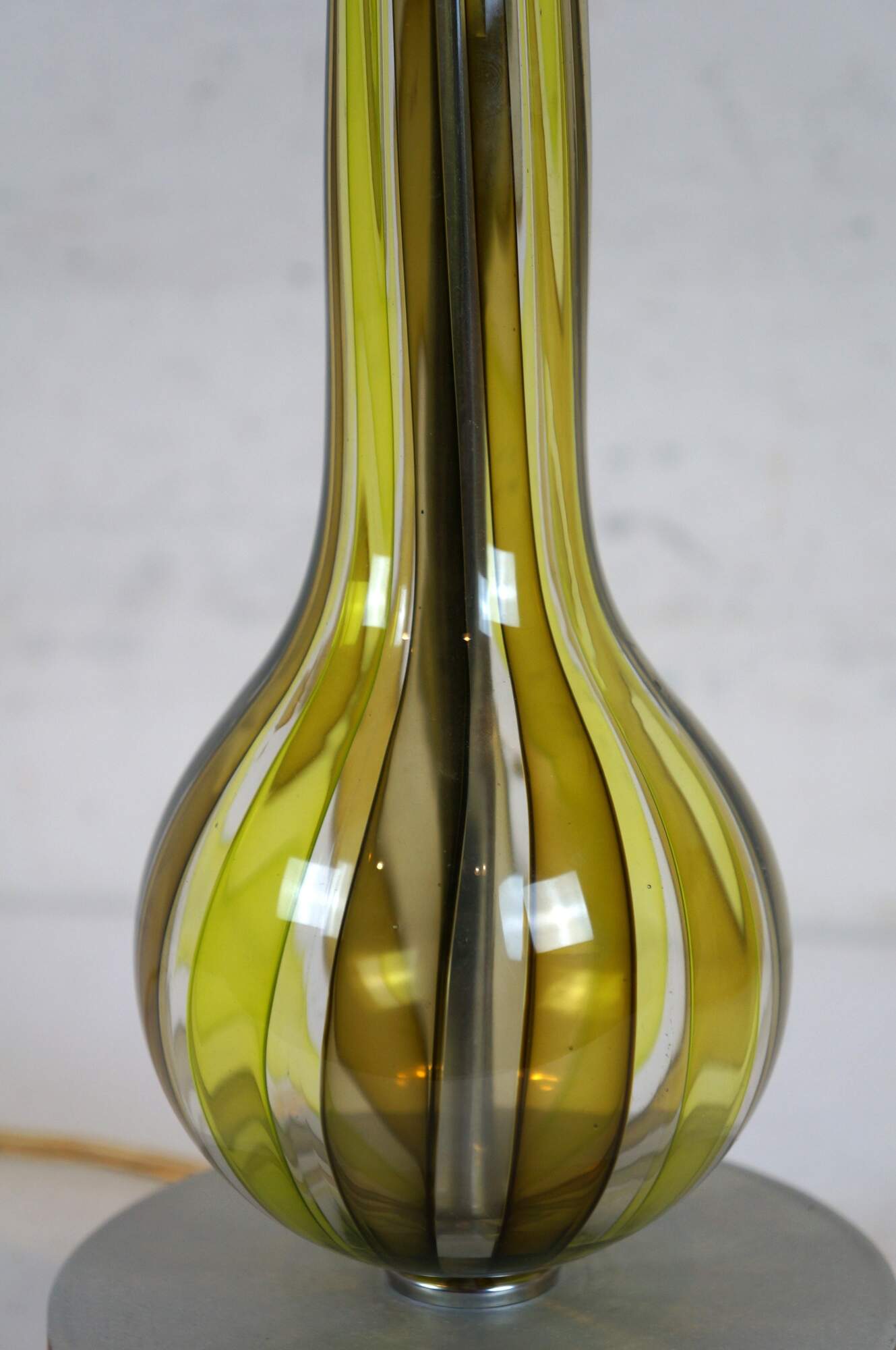 Early 21st century hand blown glass table lamp - balloon shape, striped in light green and olive brown, set on a round wood and metal base. Pull chain switch. Includes harp, brass ball finial, and a golden silk shade with braided trim and beaded fringe.