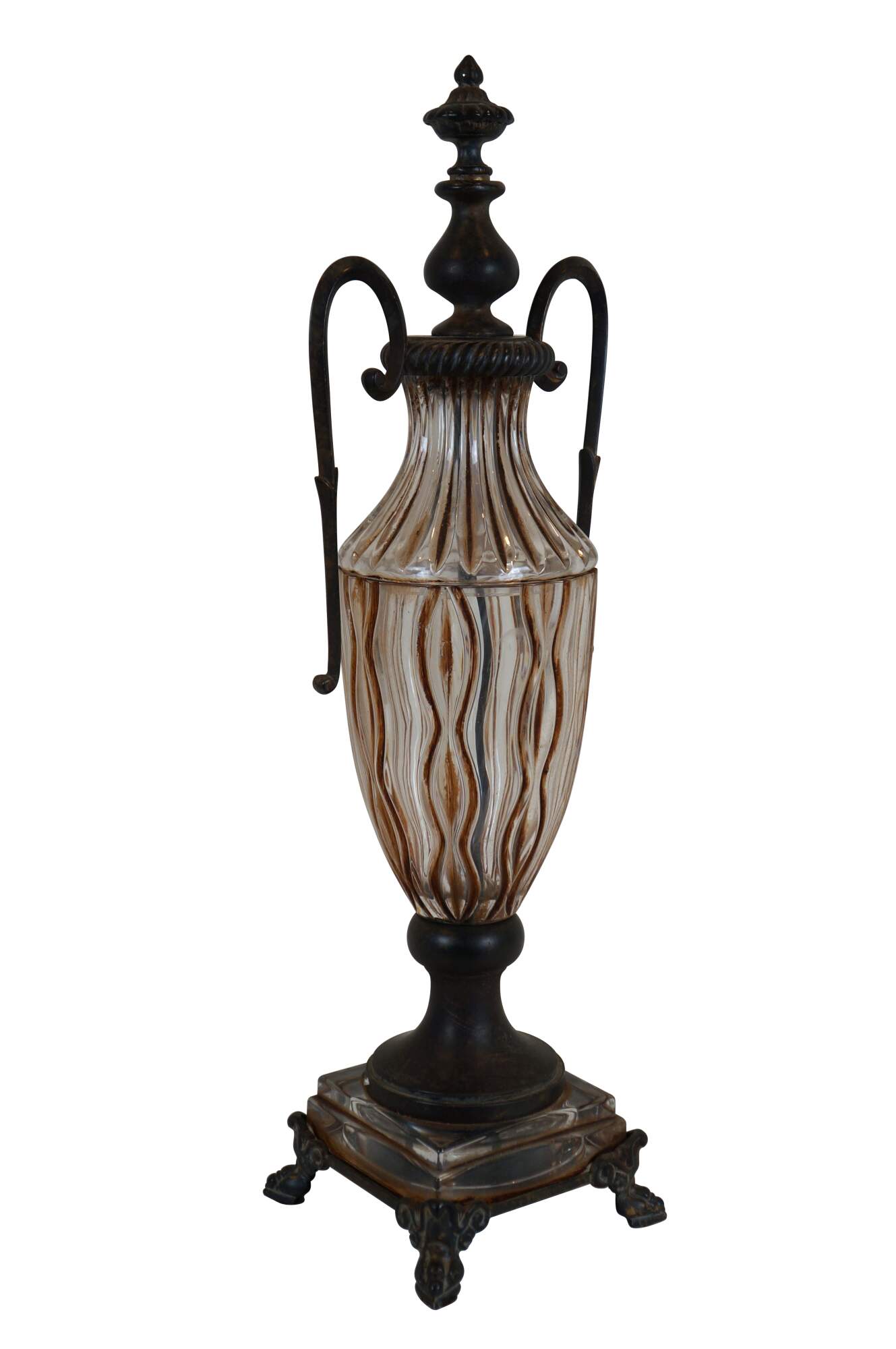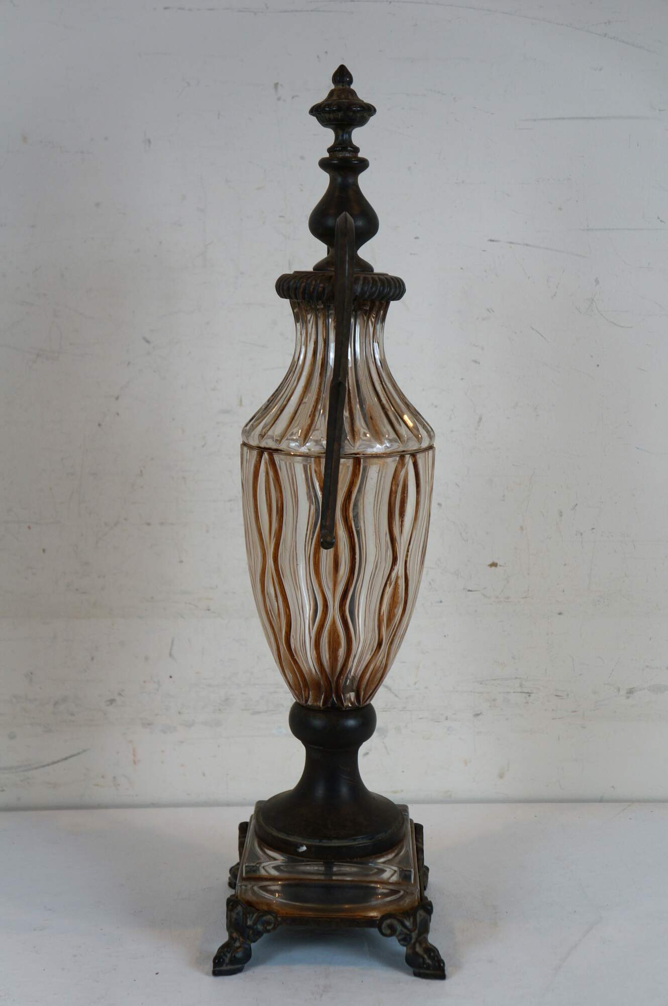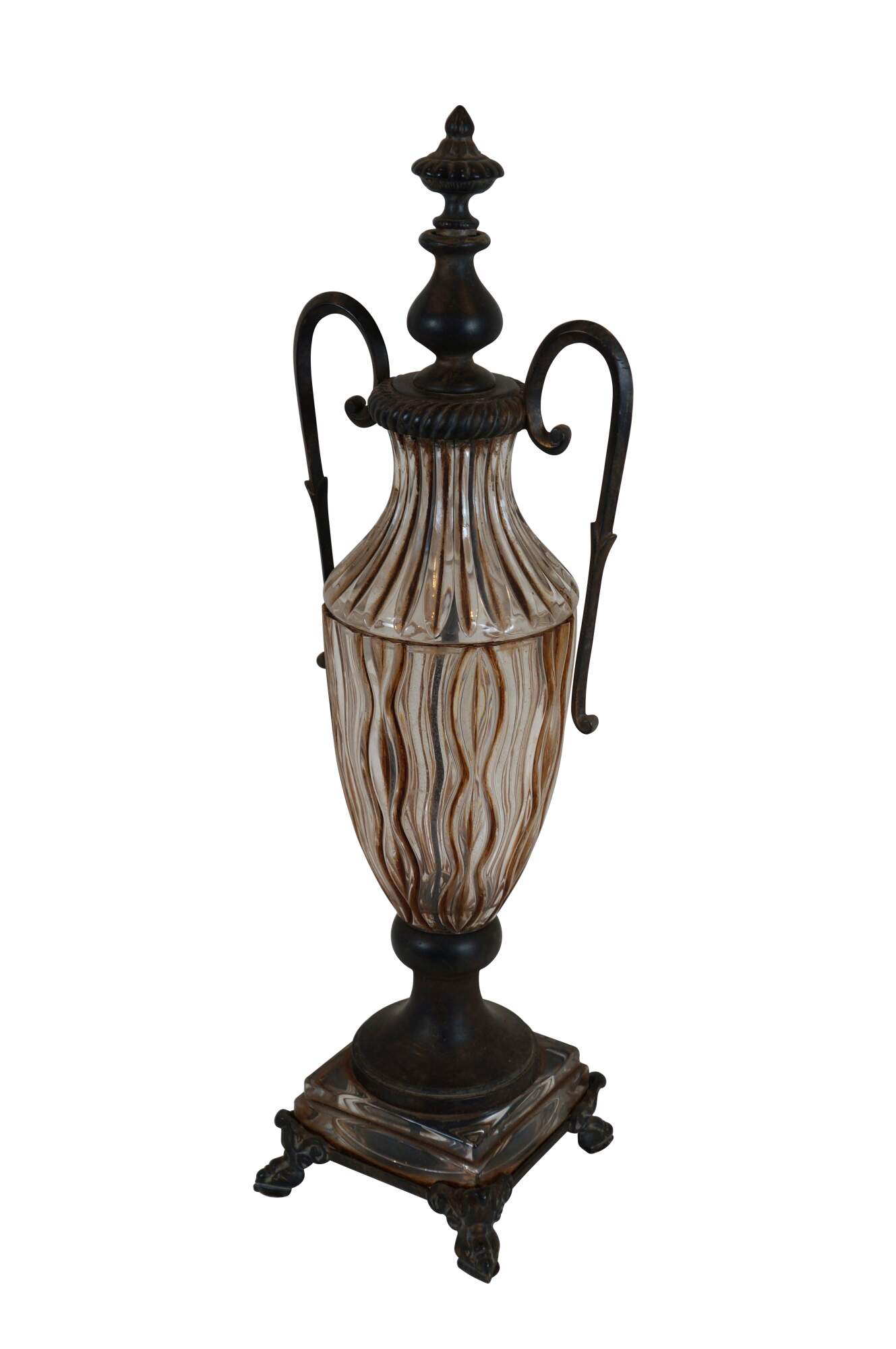 Early 21st century slender, neoclassical mantel urn, fashioned of fluted glass painted with brown accents and dark brass feet, base, top, and handles. Can be converted into a lamp.