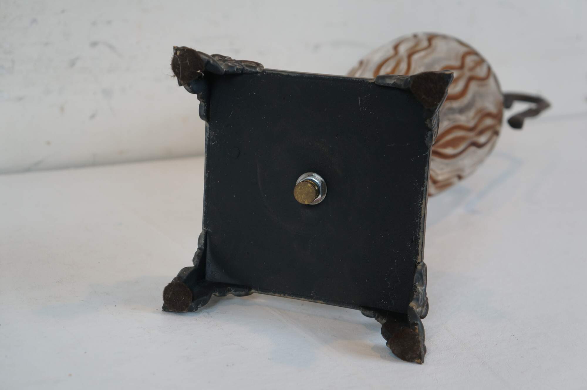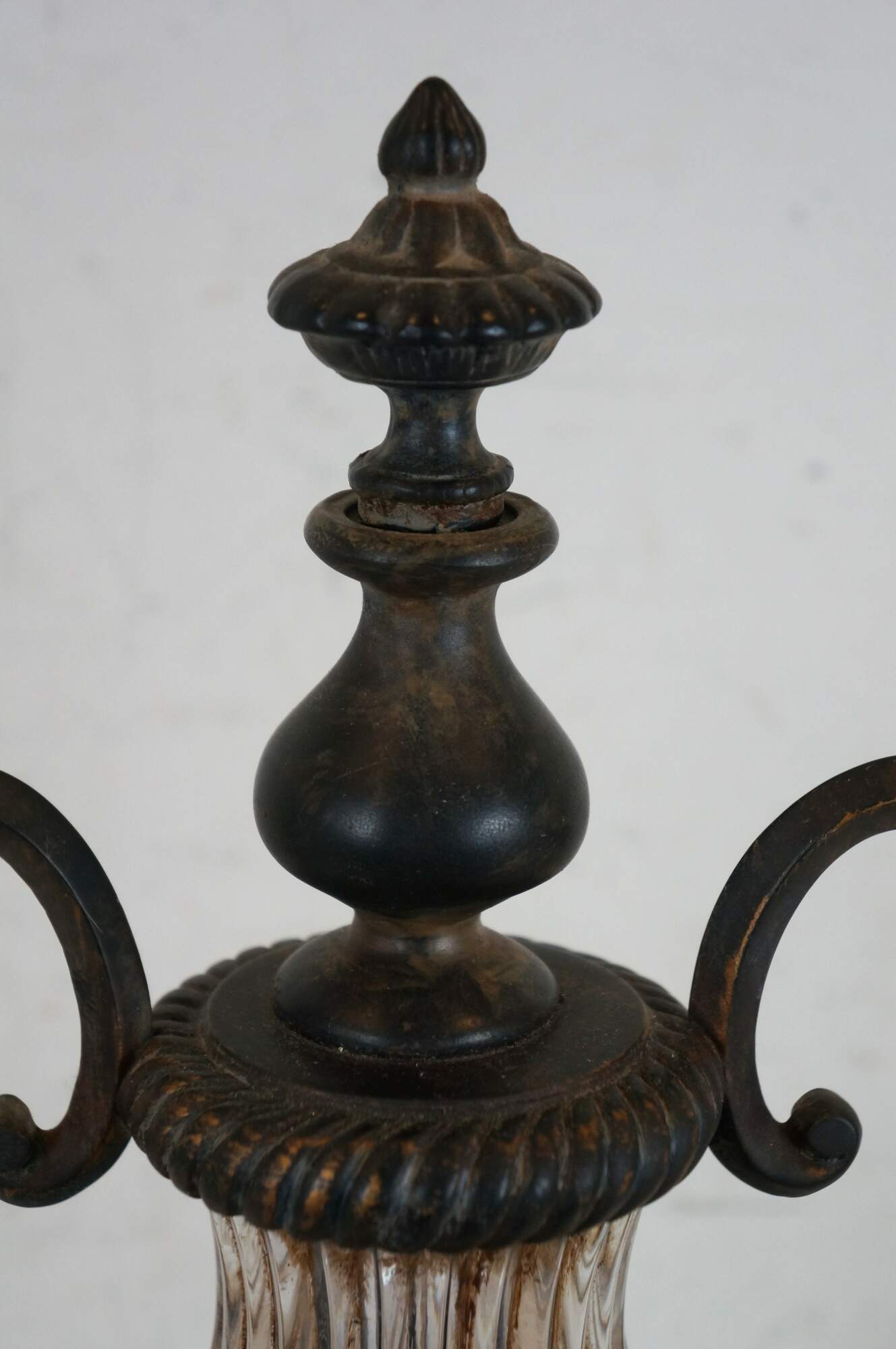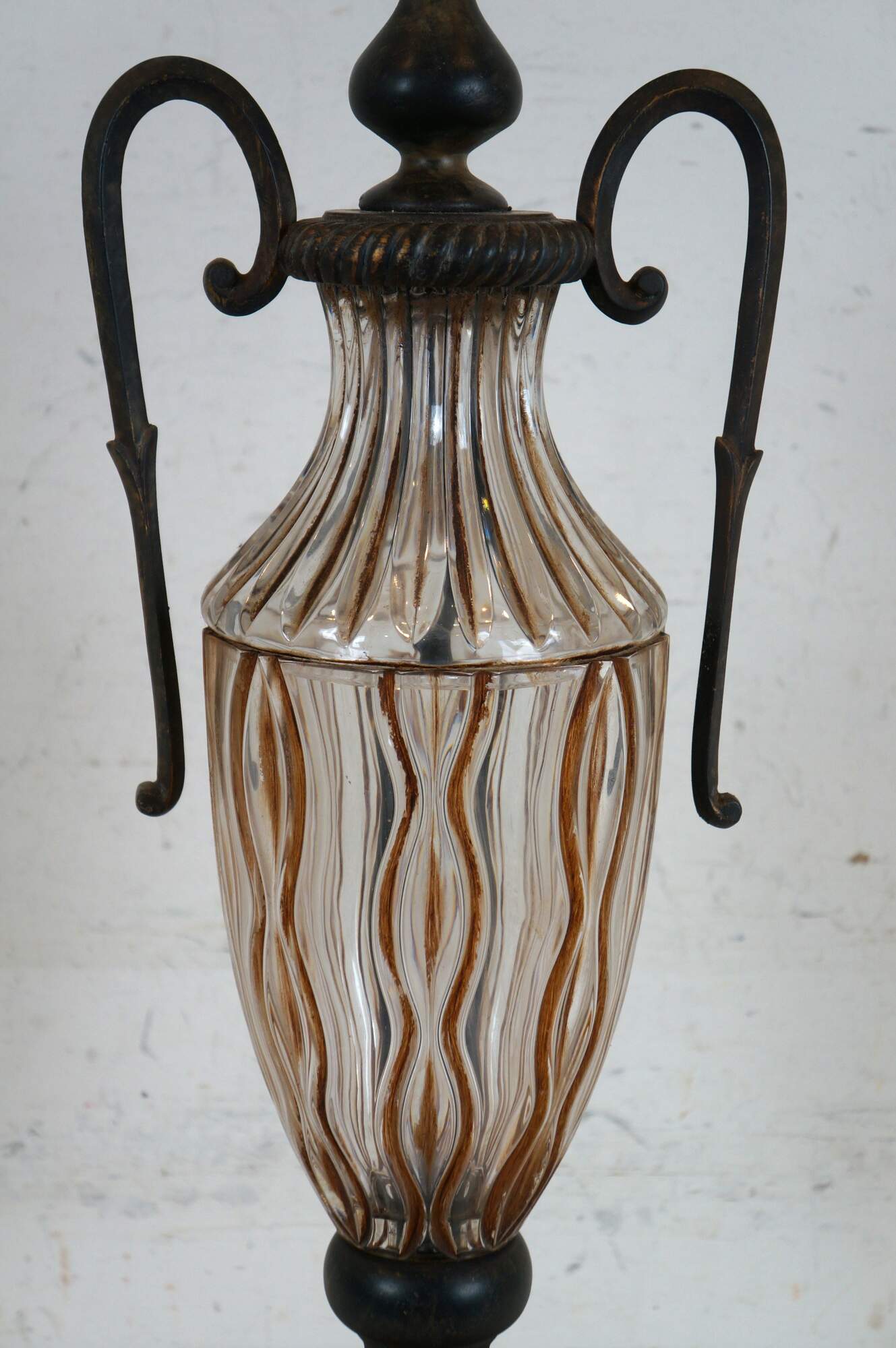 Early 21st century slender, neoclassical mantel urn, fashioned of fluted glass painted with brown accents and dark brass feet, base, top, and handles. Can be converted into a lamp.