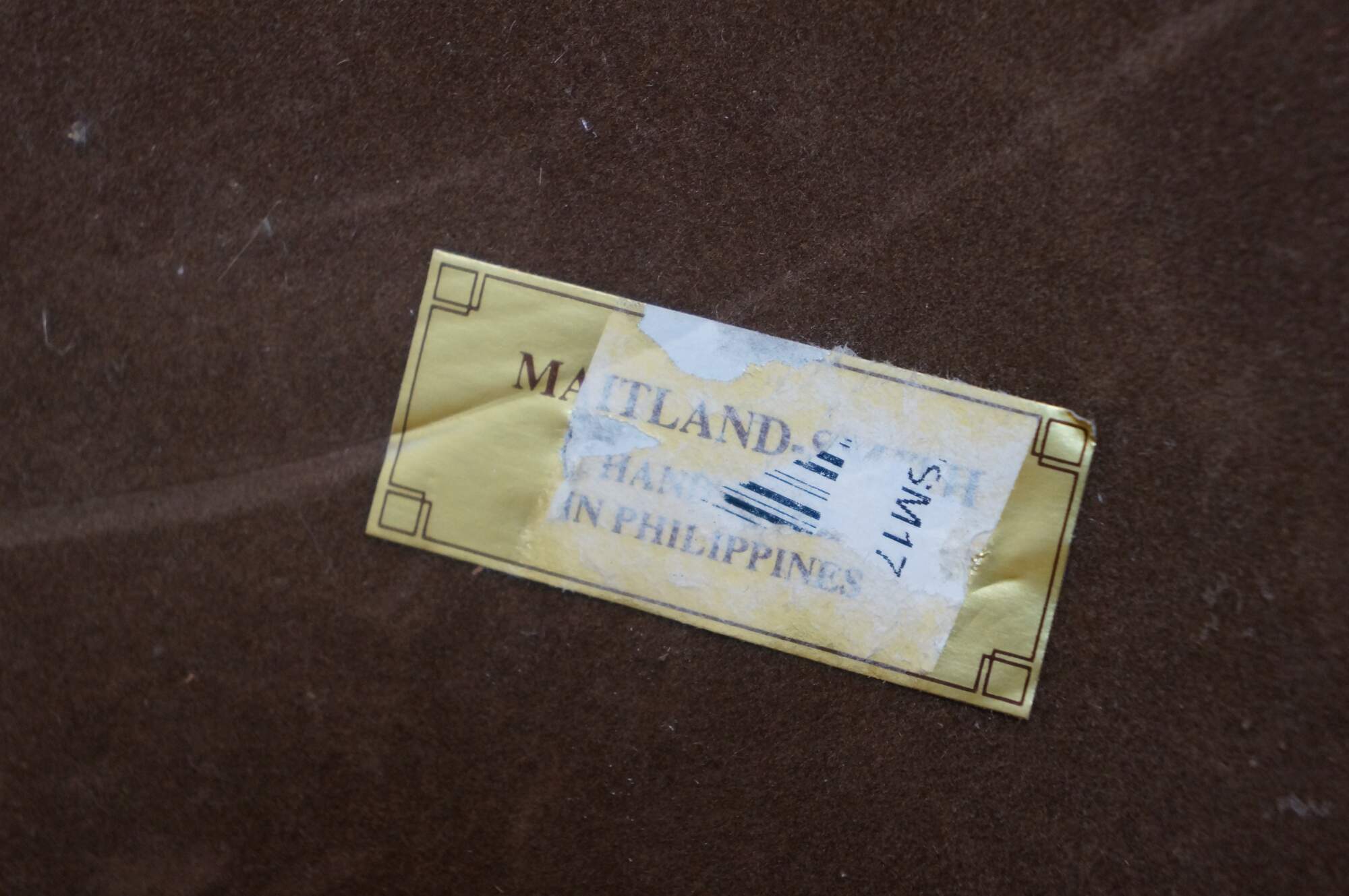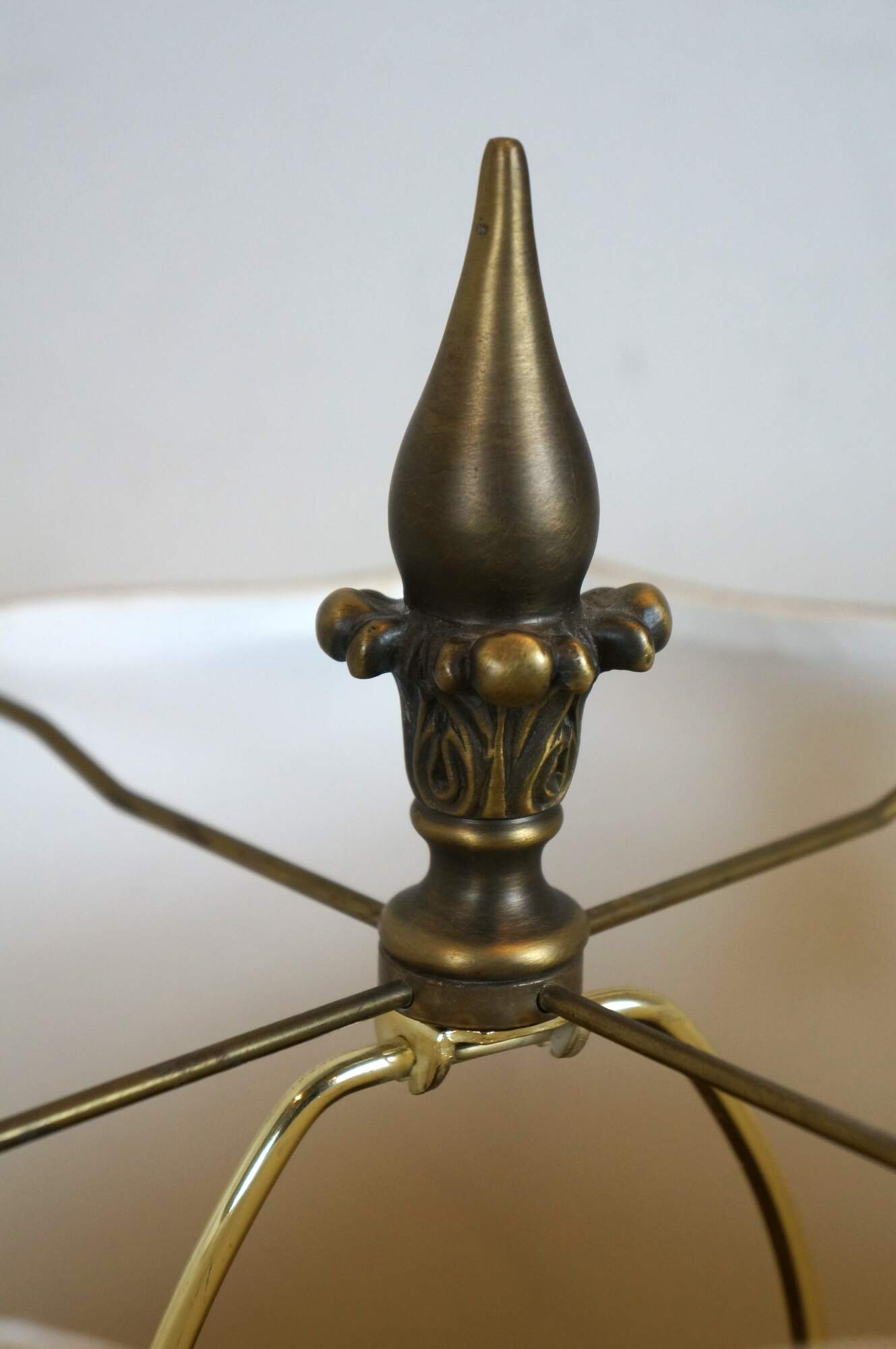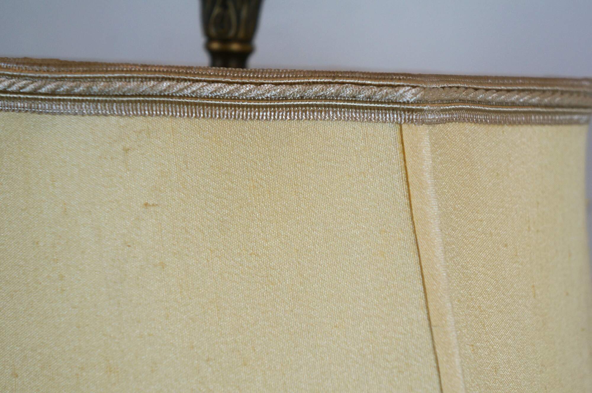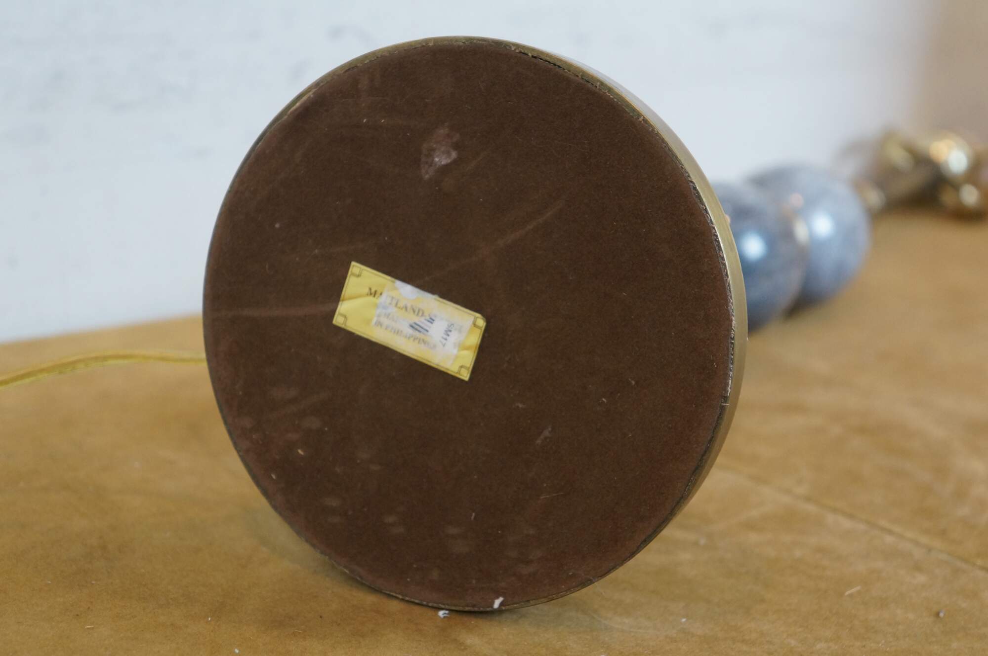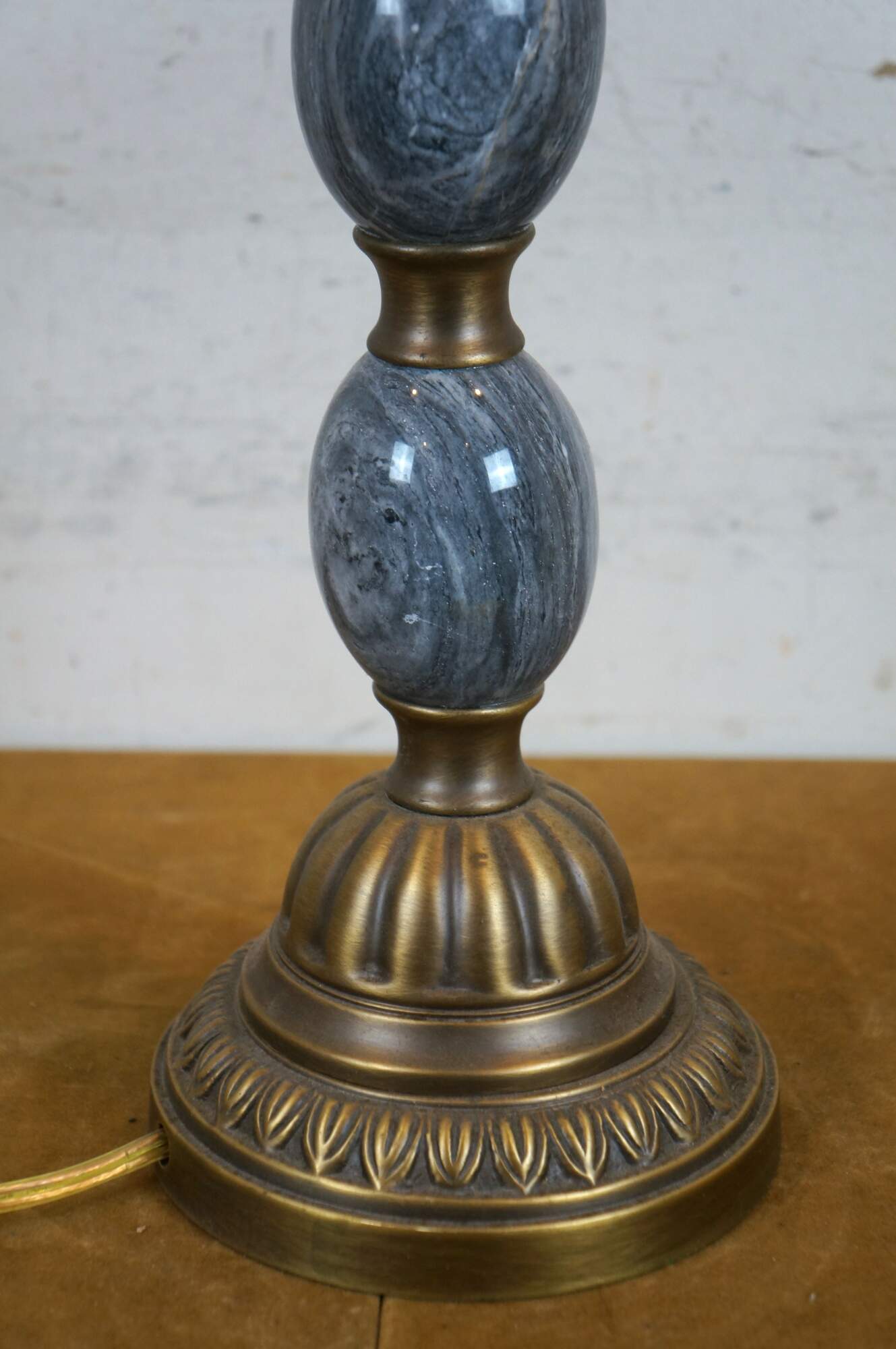 Late 20th century Maitland Smith gray marble egg and brass table lamp. Hand Made in Philippines. Includes harp, flame shaped foliate finial, and scalloped, cream colored fabric shade.