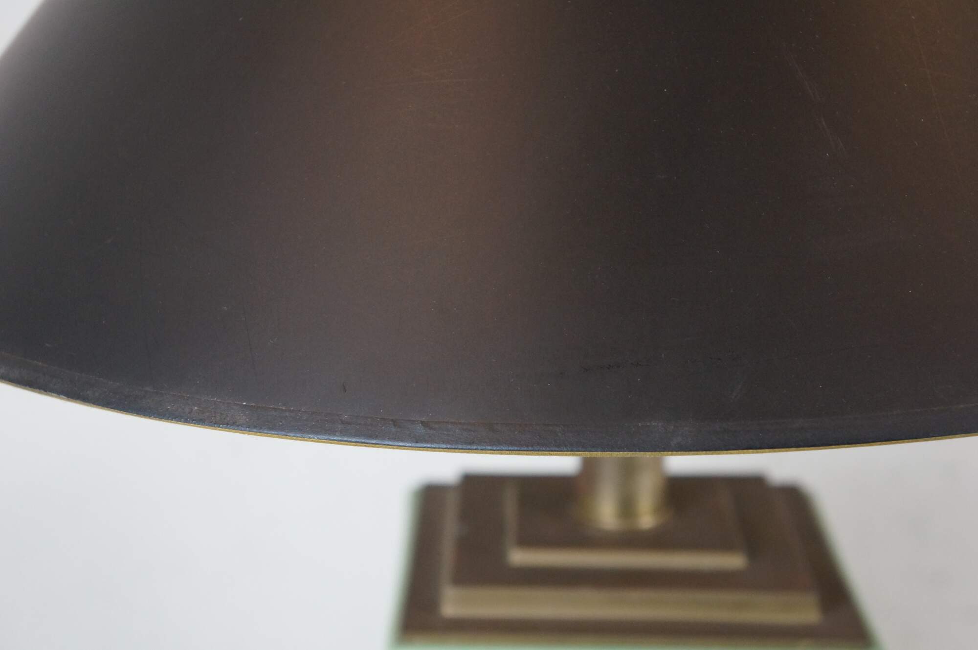 Pair of 2009 Visual Comfort & Co / Chapman table lamps, choiserie styled stacked effect of brass and celadon green porcelain. Dimmable switch. Includes harp, brass ball finial, and black paper shade with reflective interior.