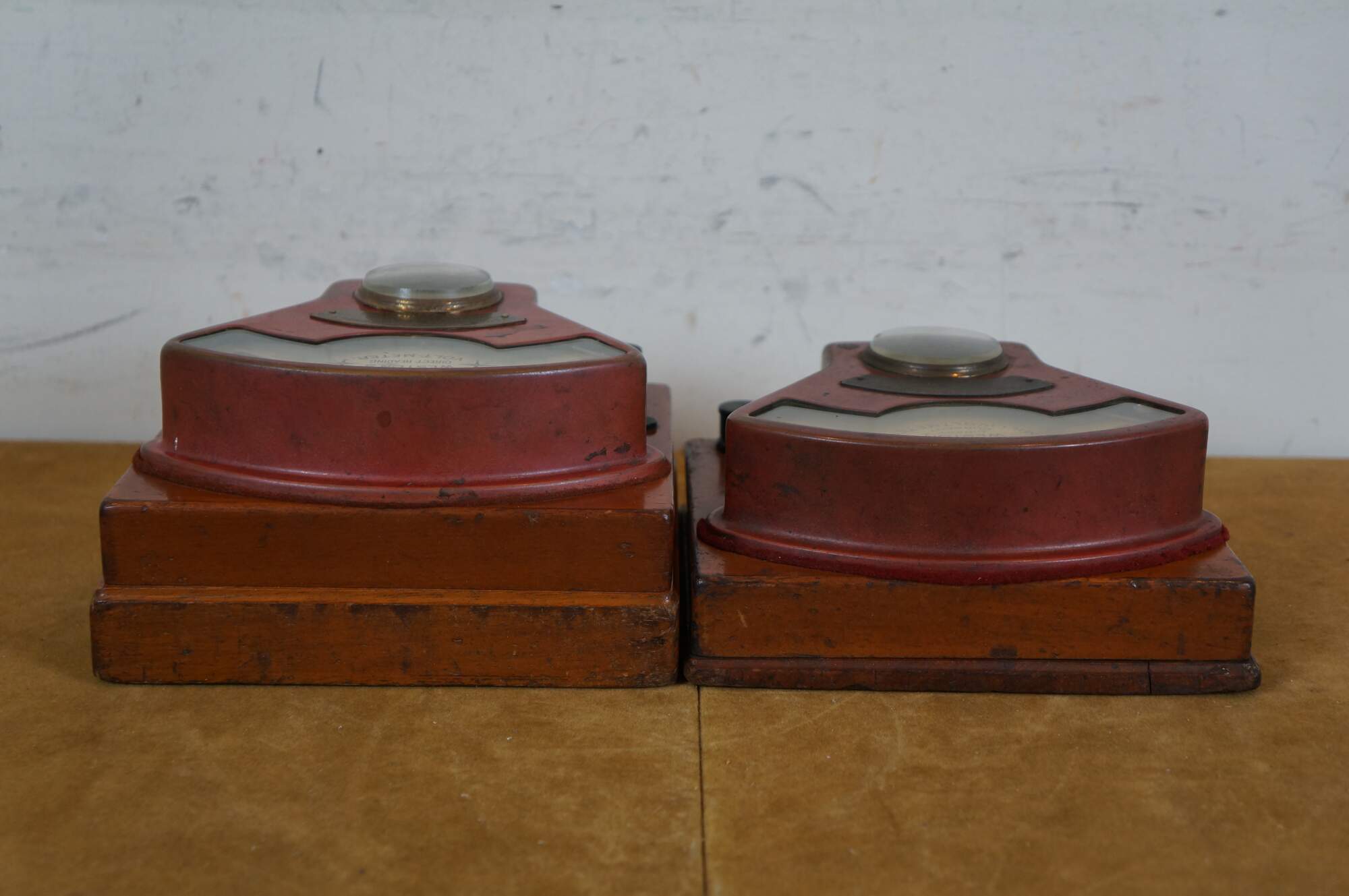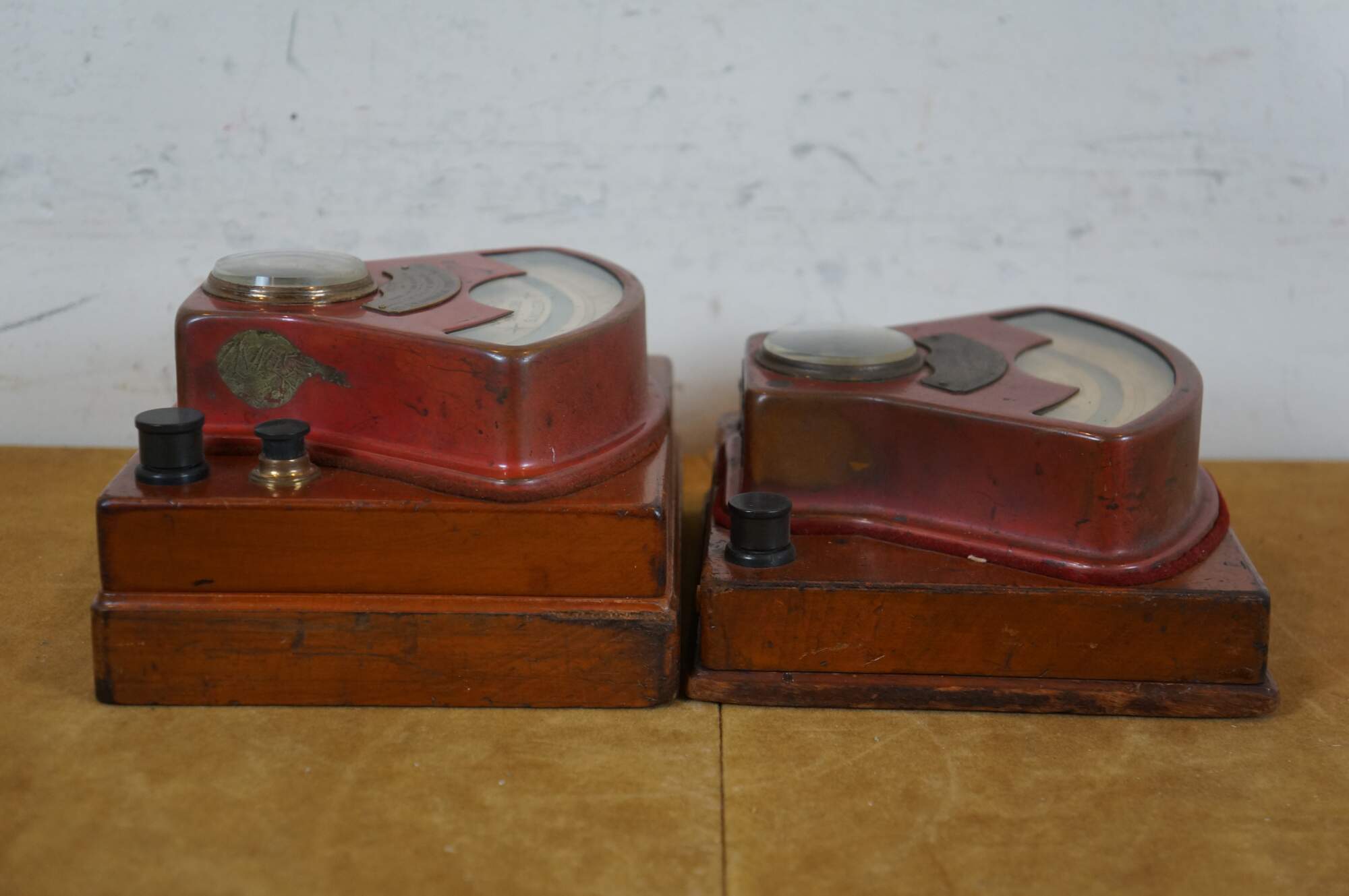 Pair of late 19th to early 20th century electrical meters - Weston's Direct Reading Volt Meter - No 13134 - and Weston Direct Current Millivoltmeter - Model 1 - No 18023. Weston Electrical Instrument Company, Newark, NJ, USA. Fan shaped metal box, wood base.