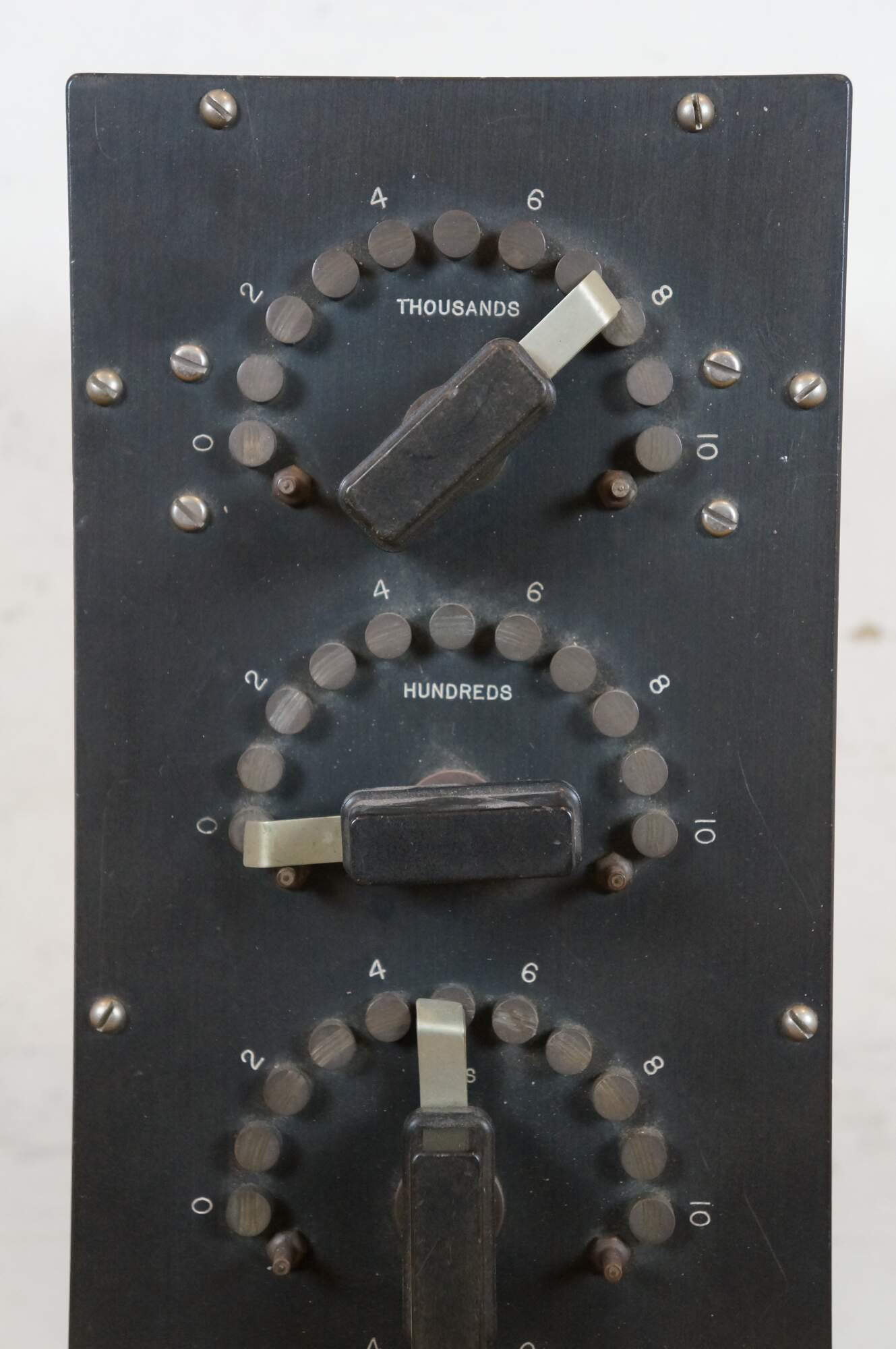"A decade box is a piece of test equipment that can be used during prototyping of electronic circuits to substitute the interchanging of different values of certain passive components with a single variable output. Decade boxes are made for resistance, capacitance, and inductance, the values of which can be adjusted incrementally by the turning of a knob or switch, with the contacts of the switch moving along a series of the respective components. The interface for these devices usually consists of dials or adjustable tape counters, and they are operated in-circuit and without any external power source." (Source: Wikipedia)