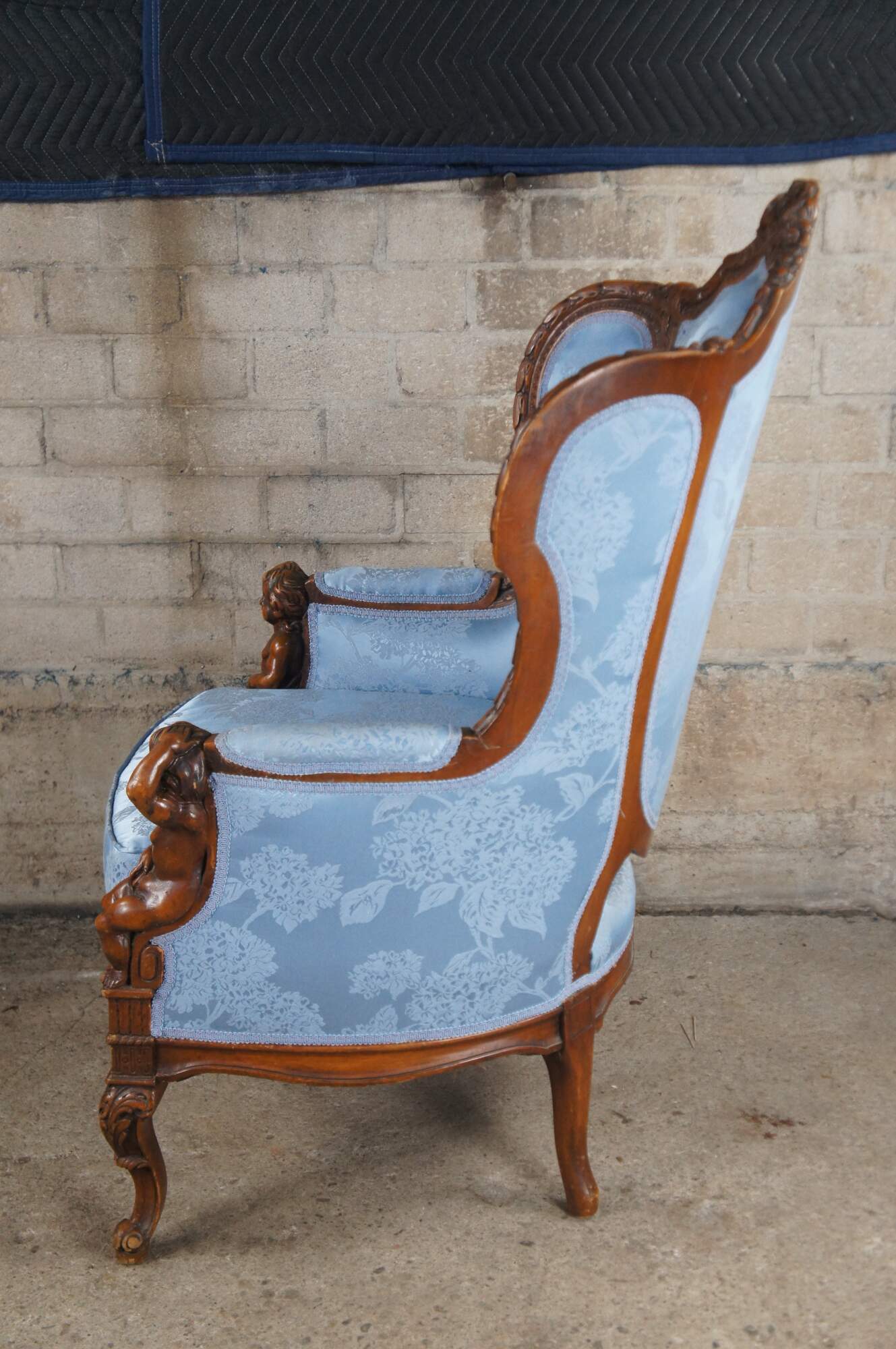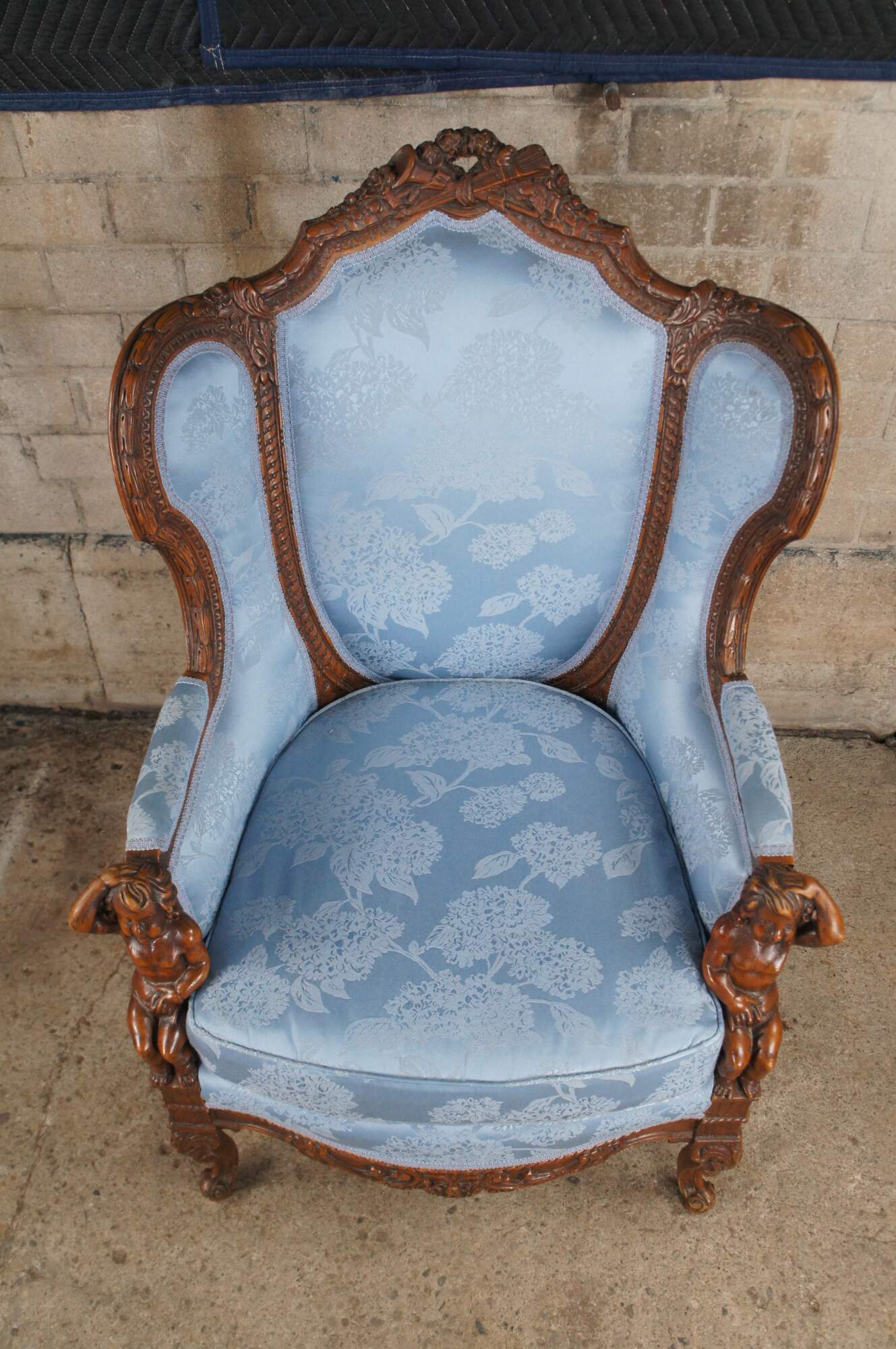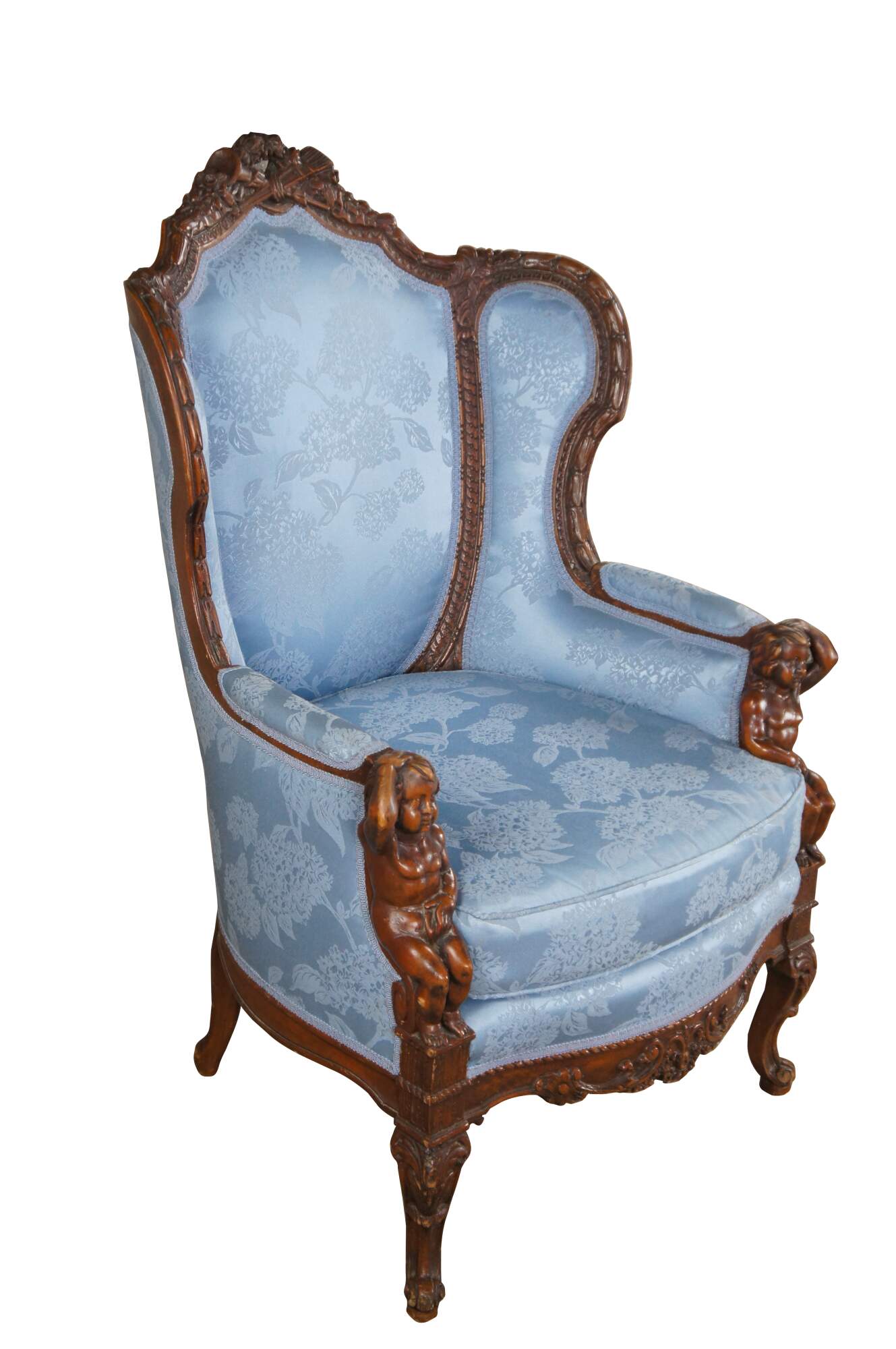 Antique French Louis XVI style Bergère library wingback reading chair, circa 1890-1910. Made from walnut with a striking pediment featuring a quiver, arrows and torch amongst roses and ribboning. The pediment is set over a three-part silk upholstered back, carved with acanthus leaf, interlaced or twisted detail and egg and dart design. Features a padded seat set between apposing figural putto figures, intricately carved with hand resting over head. Lower apron is carved with scrolling foliate between cabriole legs with acanthus carved knees. The blue silk fabric showcases a chrysanthemum pattern. A truly remarkable specimen that will make a statement in any setting.