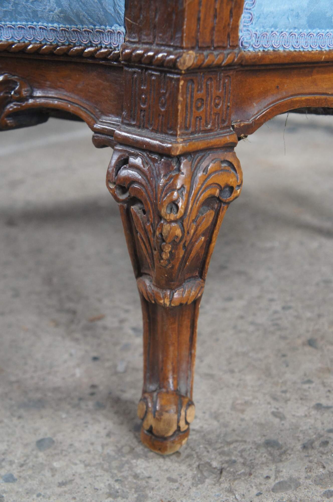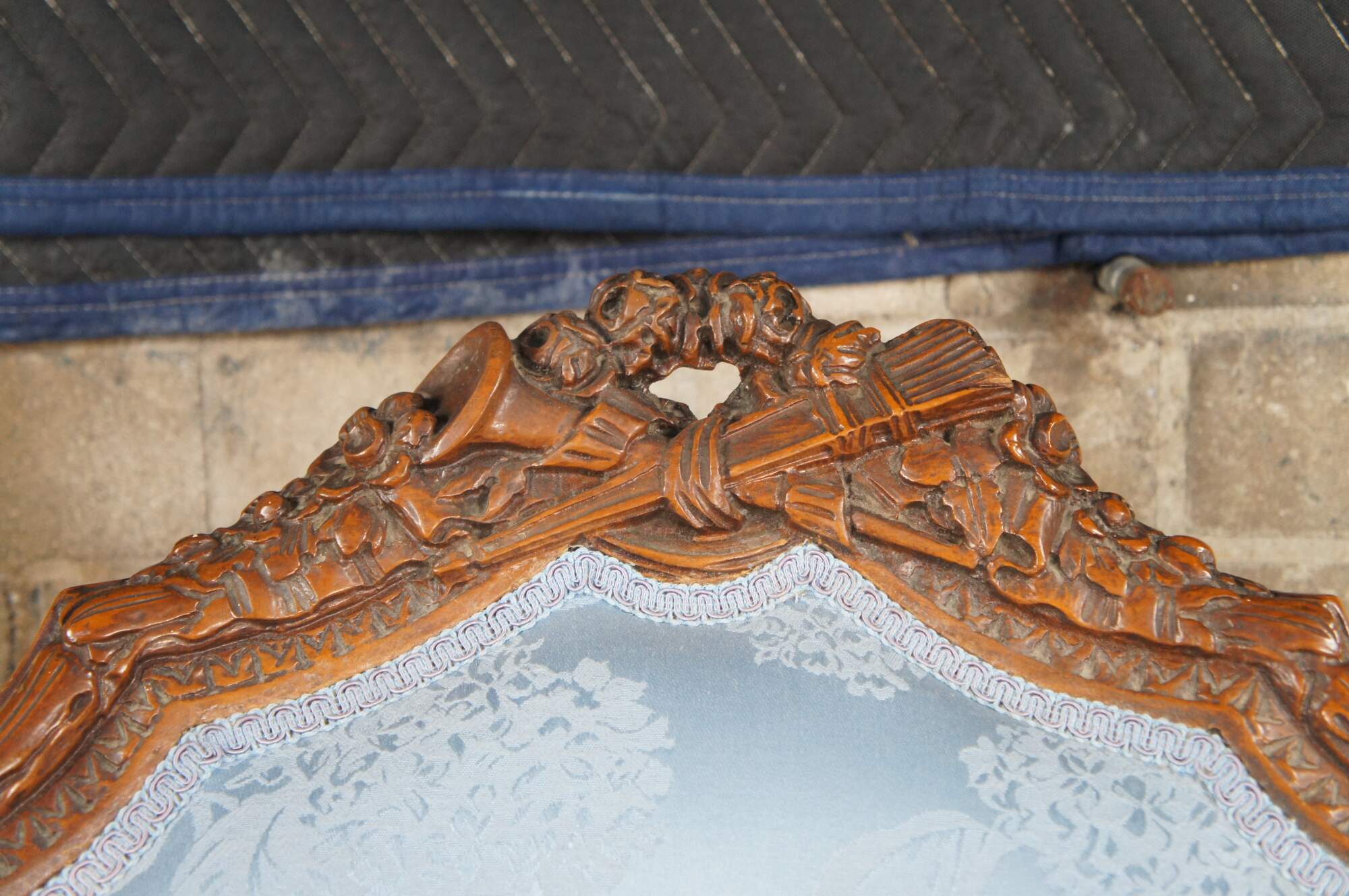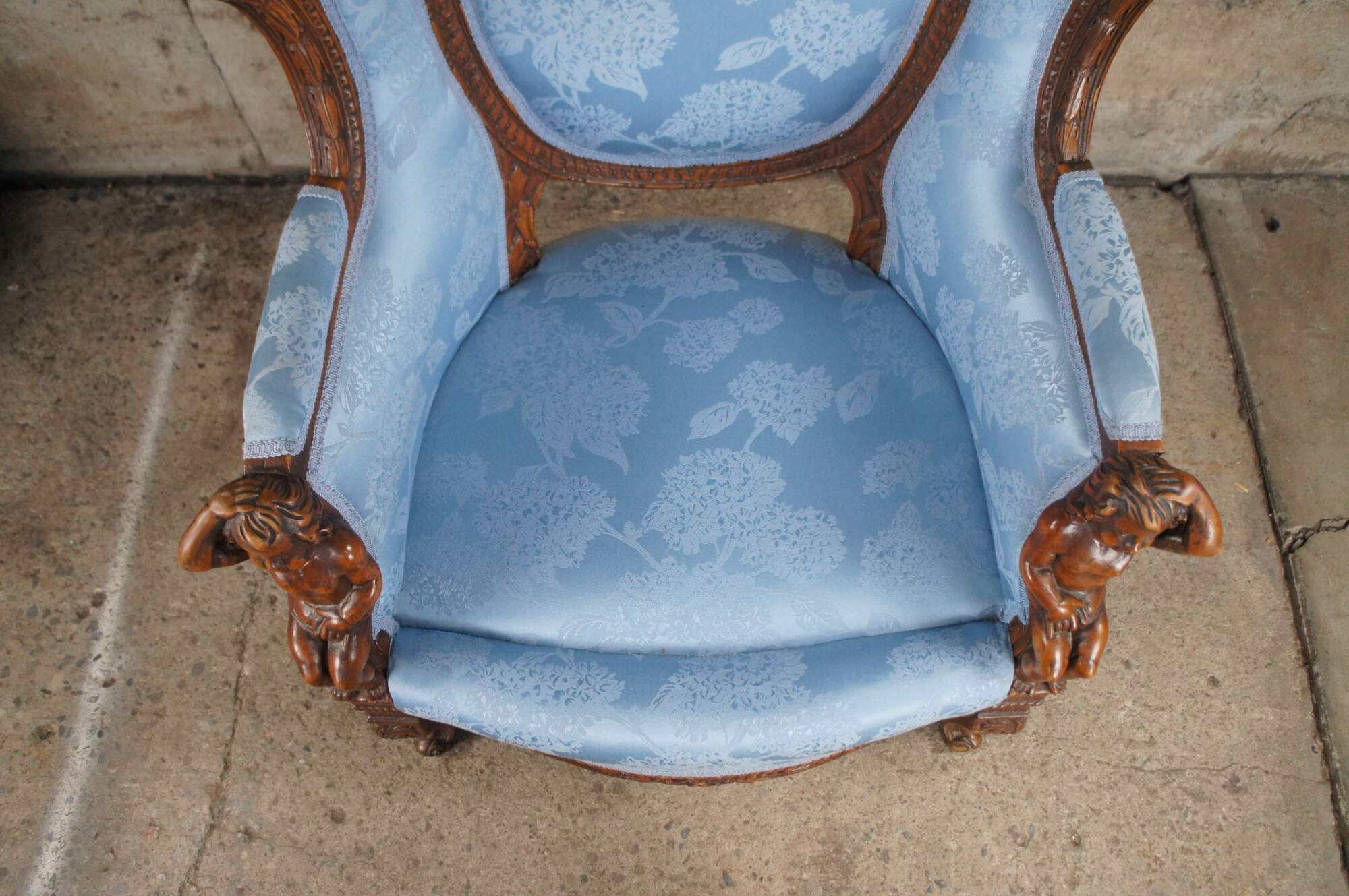 Antique French Louis XVI style Bergère library wingback reading chair, circa 1890-1910. Made from walnut with a striking pediment featuring a quiver, arrows and torch amongst roses and ribboning. The pediment is set over a three-part silk upholstered back, carved with acanthus leaf, interlaced or twisted detail and egg and dart design. Features a padded seat set between apposing figural putto figures, intricately carved with hand resting over head. Lower apron is carved with scrolling foliate between cabriole legs with acanthus carved knees. The blue silk fabric showcases a chrysanthemum pattern. A truly remarkable specimen that will make a statement in any setting.