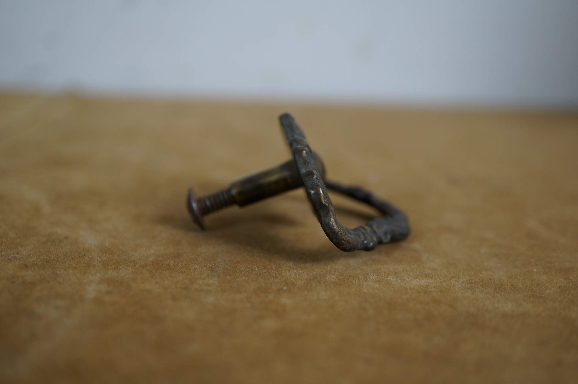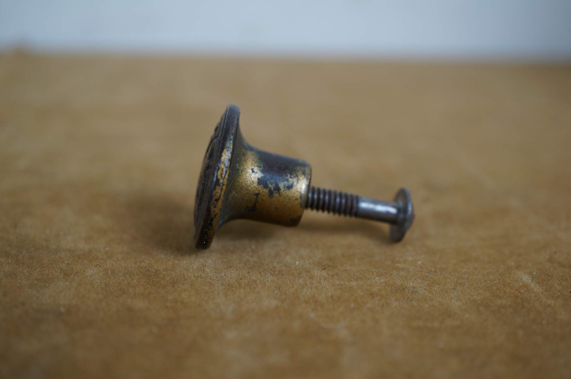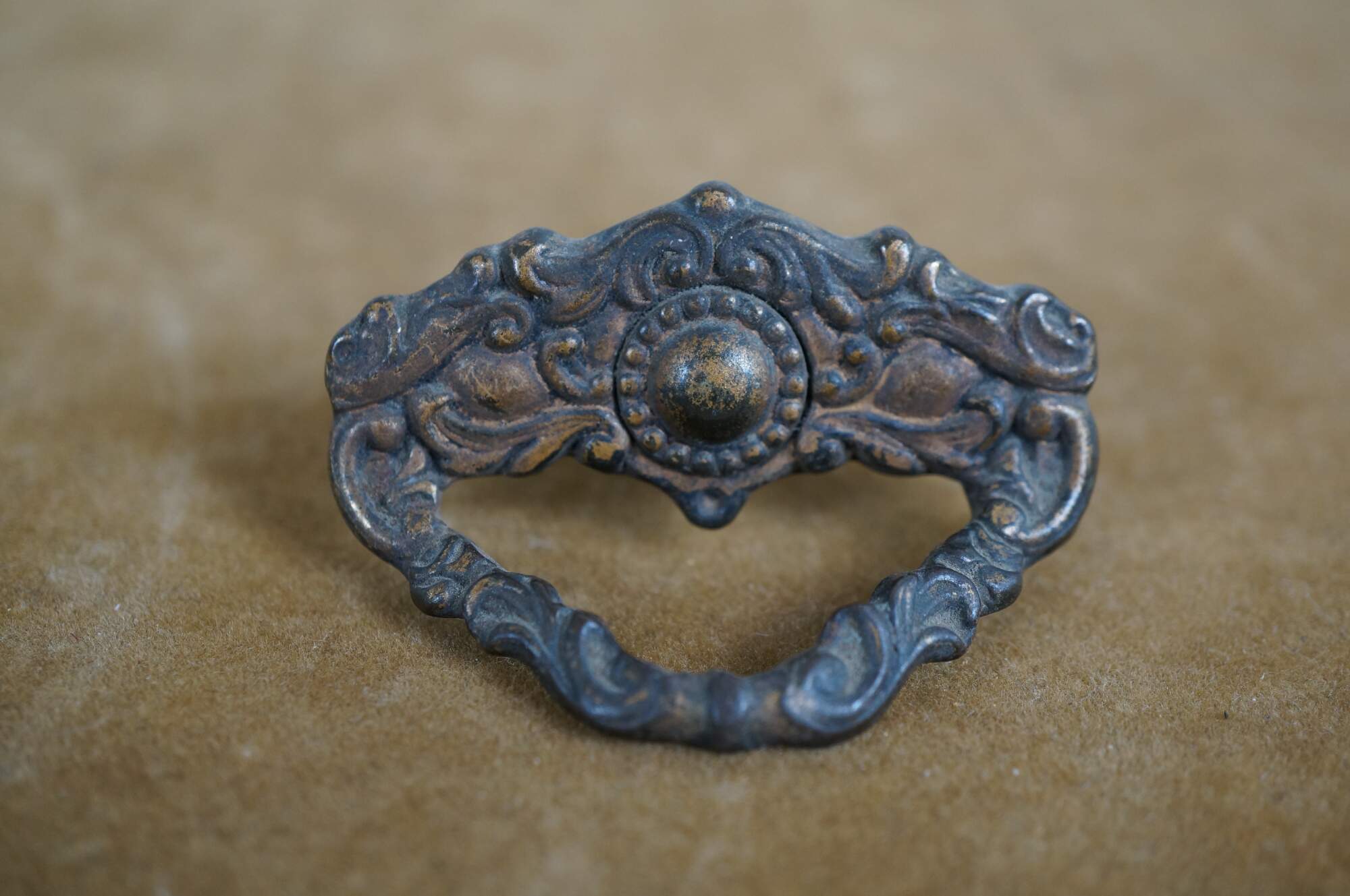 Lot of 5 vintage brass drawer / cabinet pulls including three round pulls decorated with ivy leaves and two foliate fixed bail pulls.