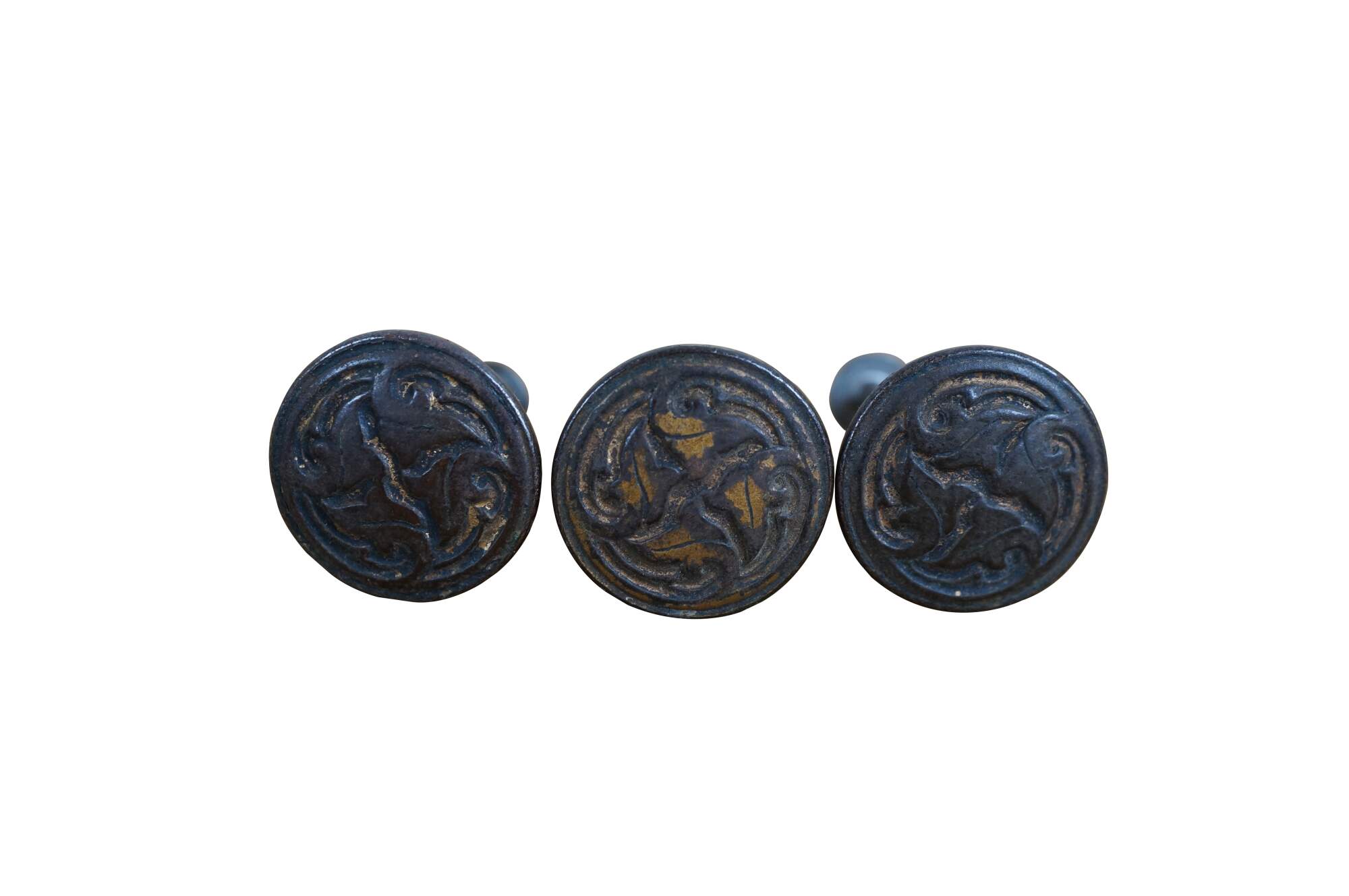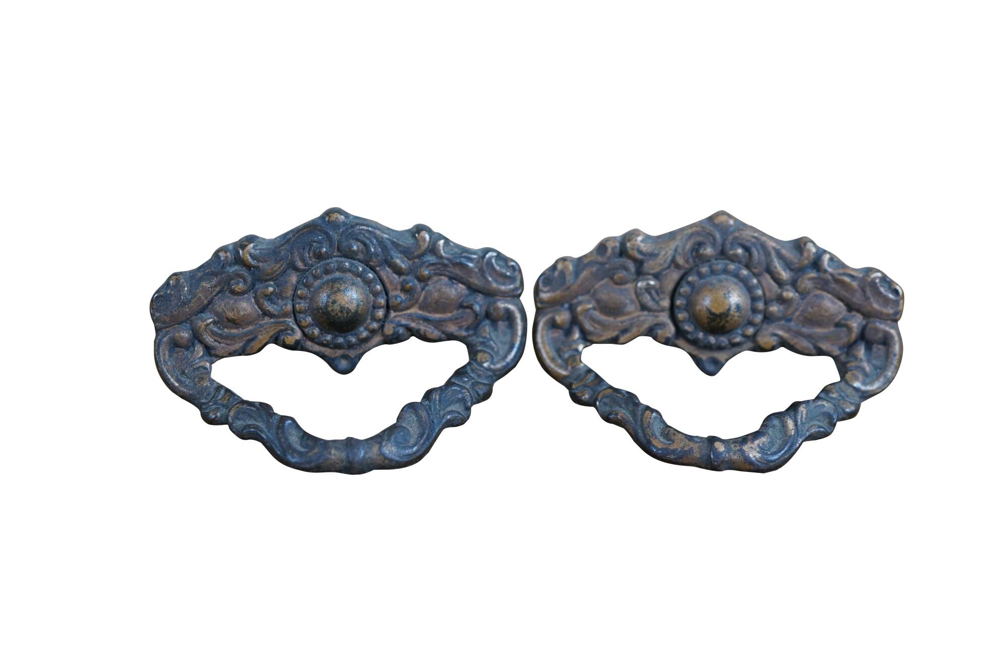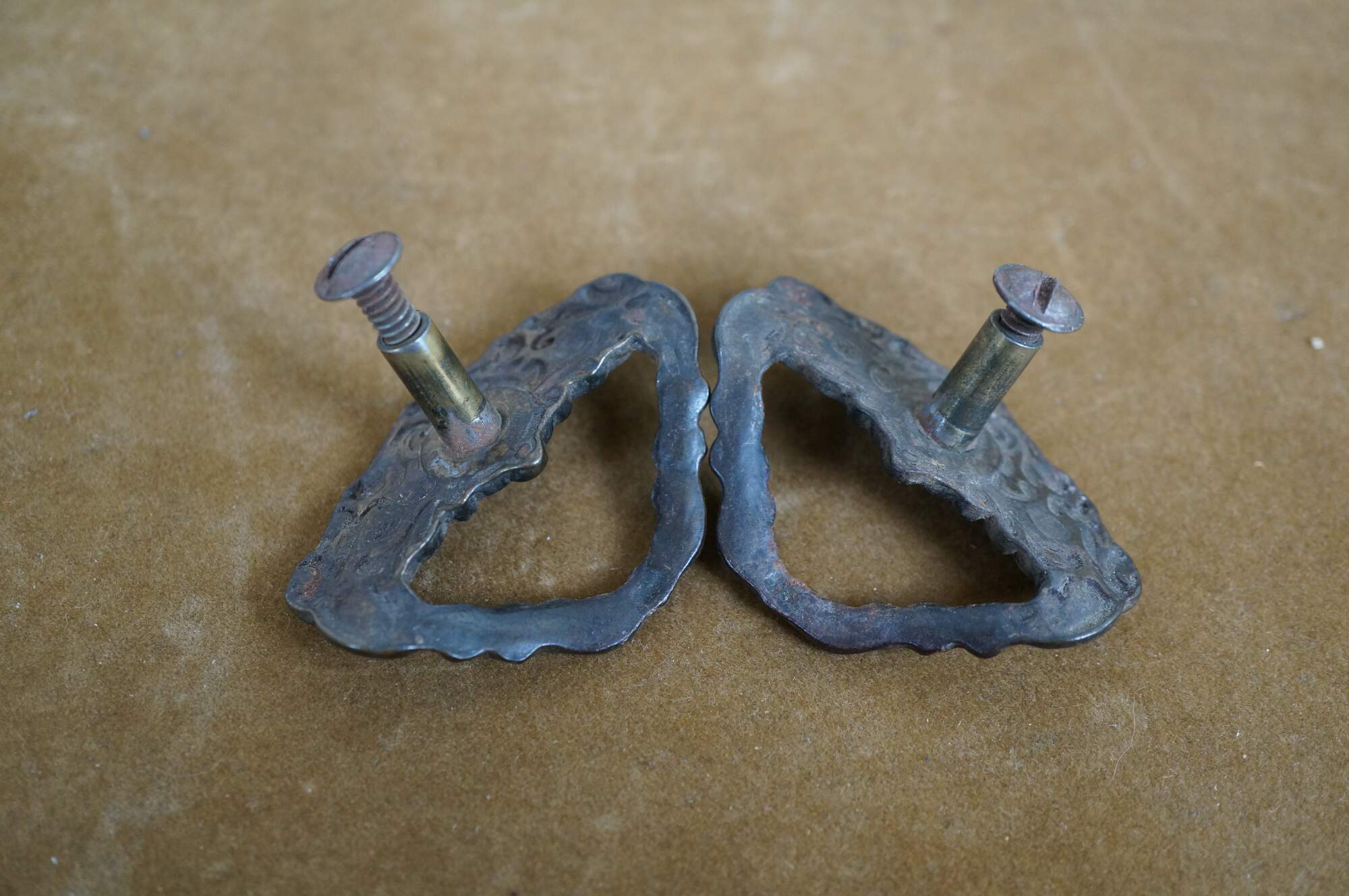 Lot of 5 vintage brass drawer / cabinet pulls including three round pulls decorated with ivy leaves and two foliate fixed bail pulls.