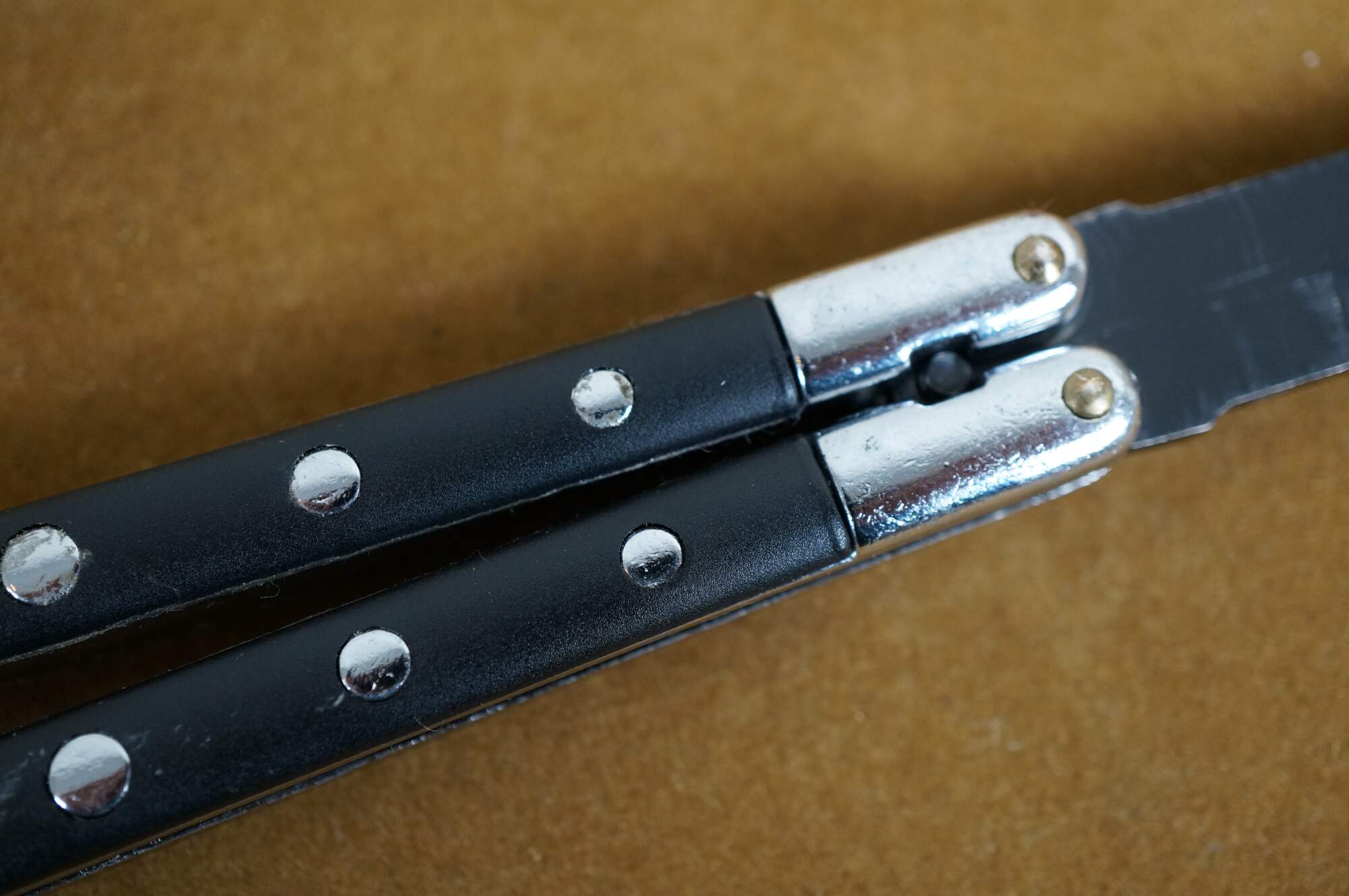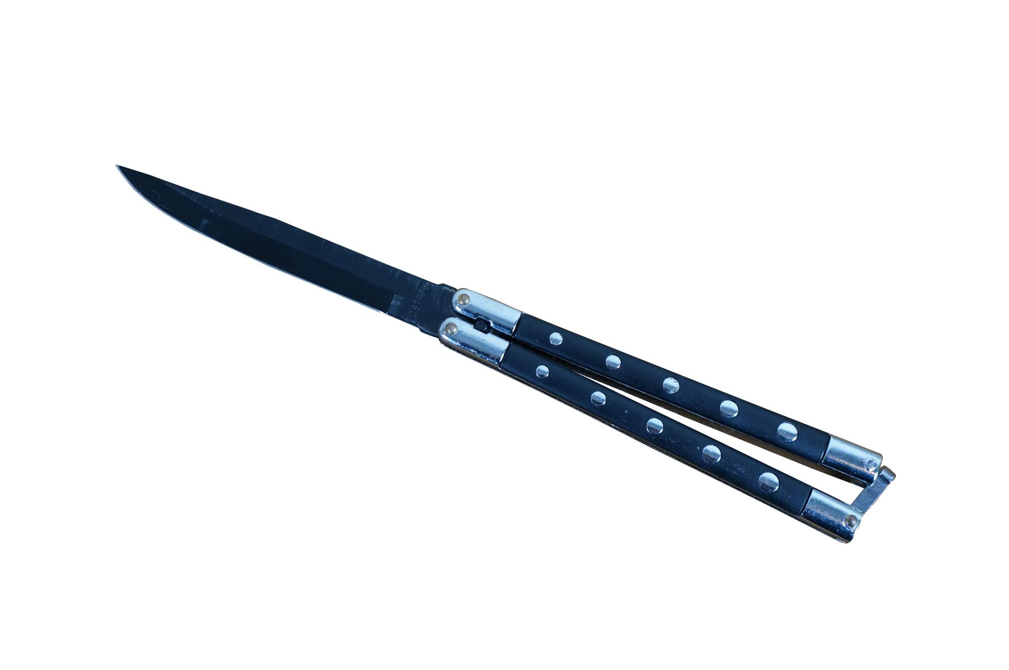 Late 20th century black and chrome rostfrei (stainless steel) fan knife / batangas / butterfly knife.