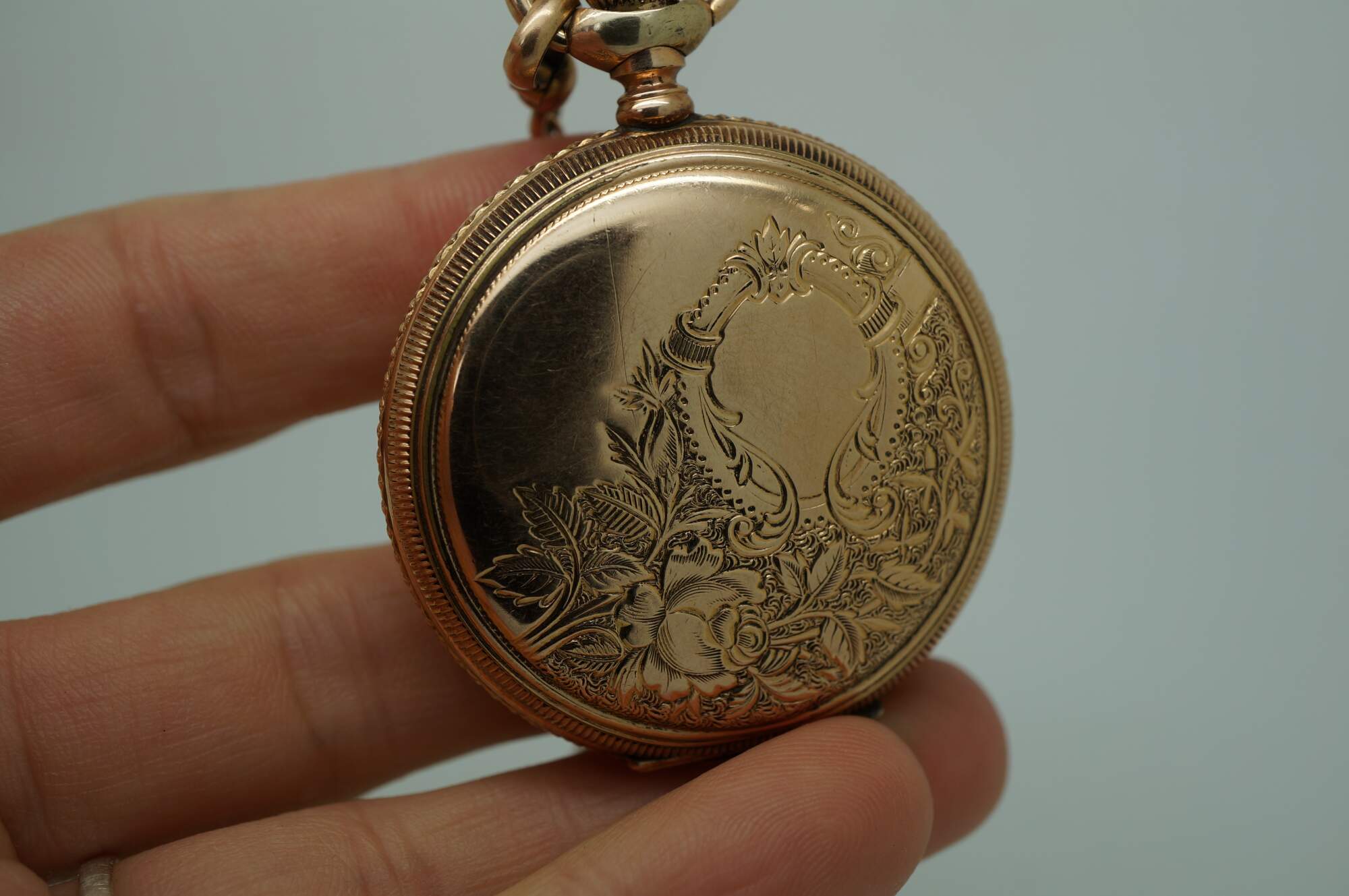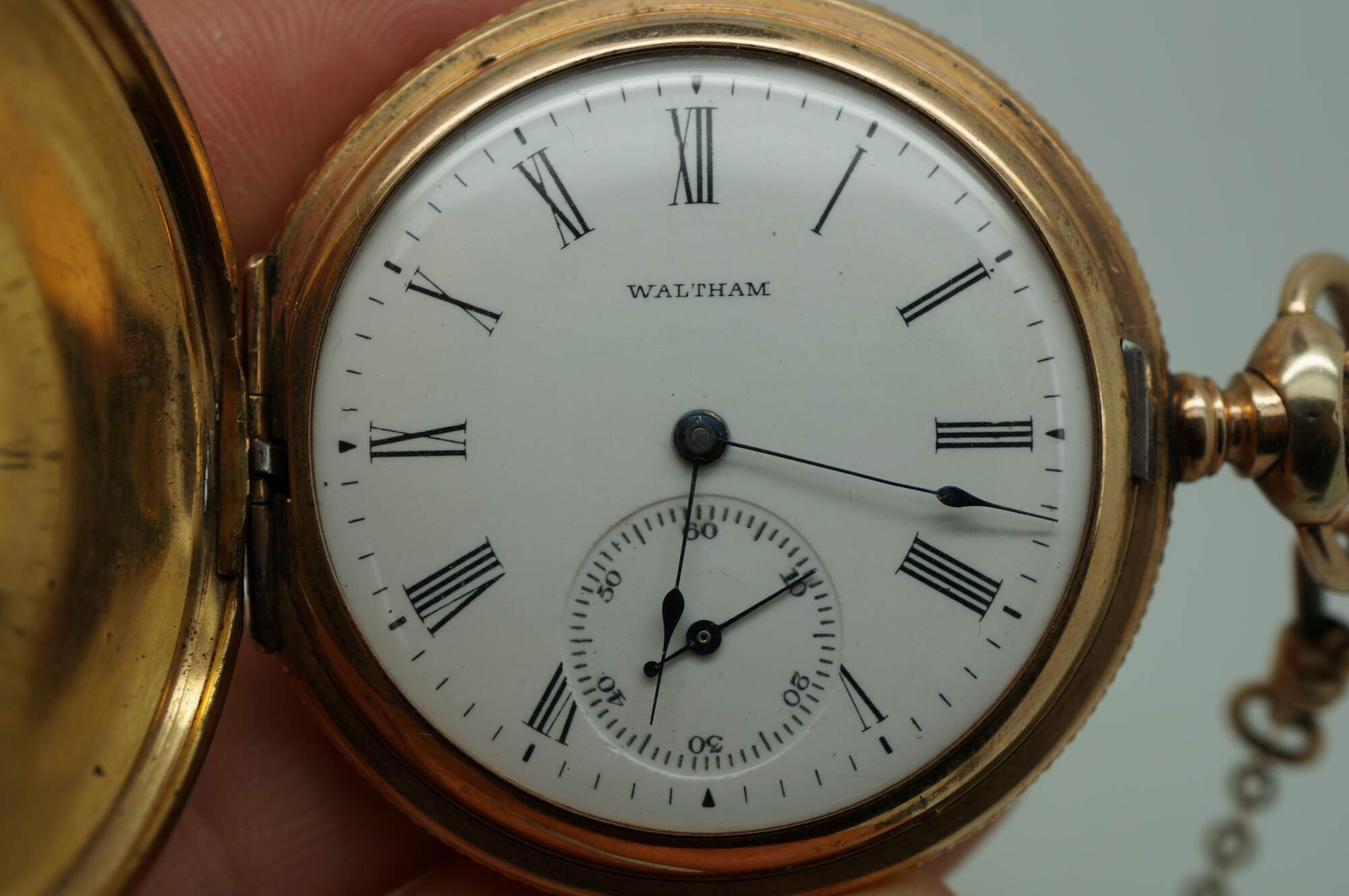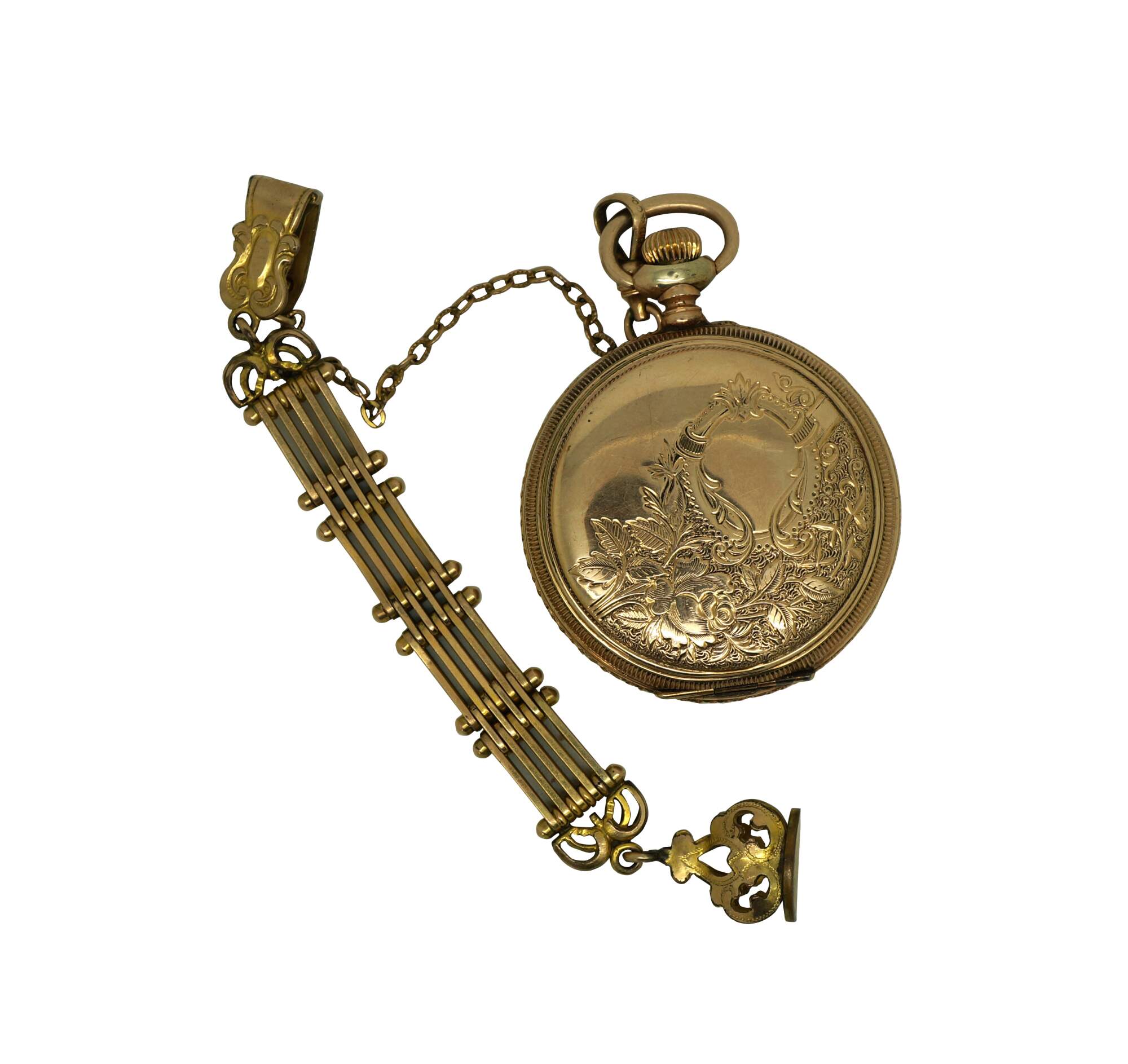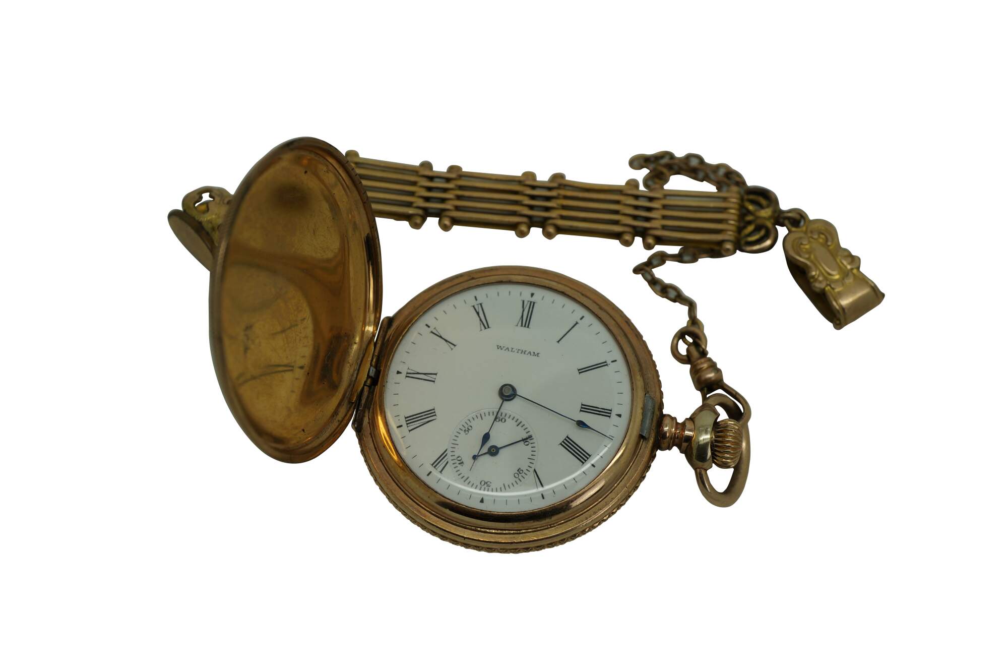 Antique 1897 Waltham hunting-style gold pocket watch. Movement - American Waltham Watch Company - Safety Barrel - 8119314 - Grade Seaside - Model 1890 - 6s - 7 jewels. White face with black Roman numerals, auxiliary dial with Arabic numerals, and iridescent blue hands. Case - Essex - 14K Gold - Guaranteed 20 Years - 757539 - 539. Both sides of the case etched with a rose and foliate frame - one side blank, ready for a monogram, the other side with the engraved image of a small house. S.O.B. & Co chain with attached signet seal fob (blank - no monogram).