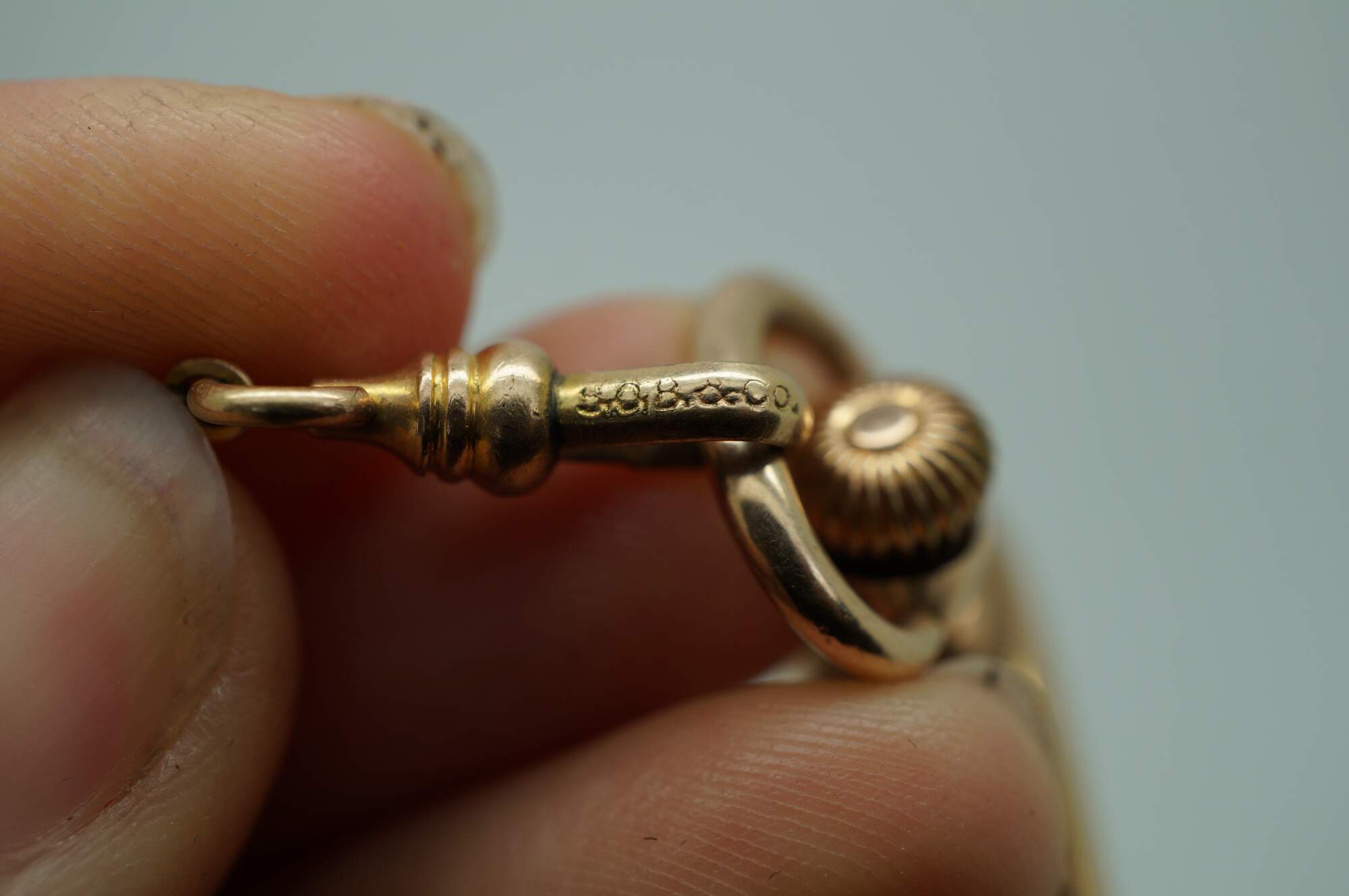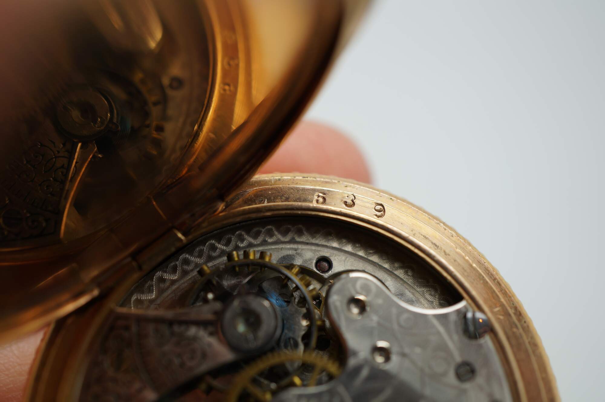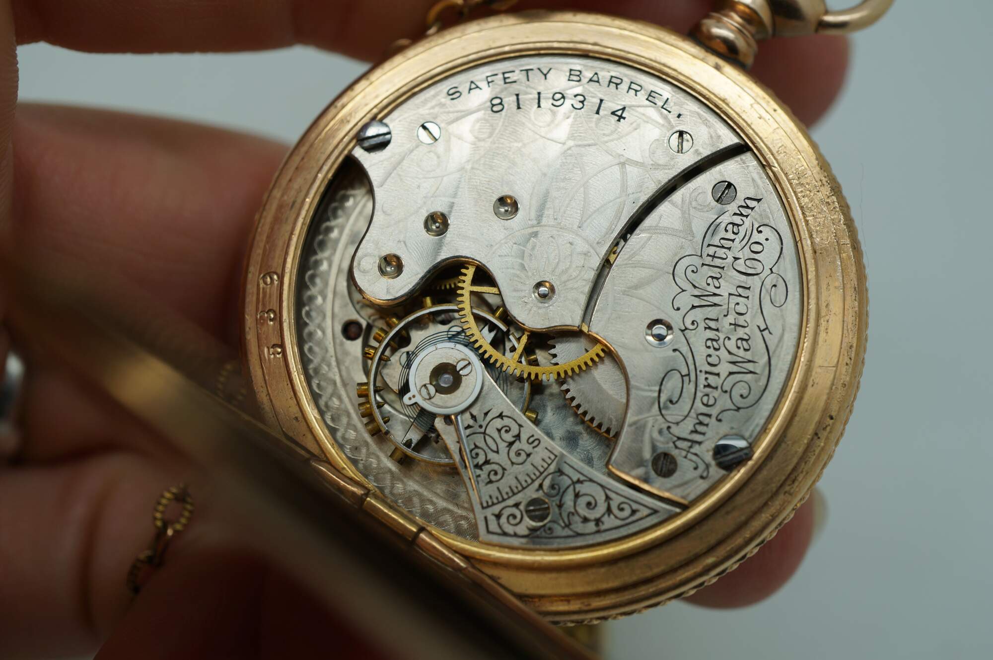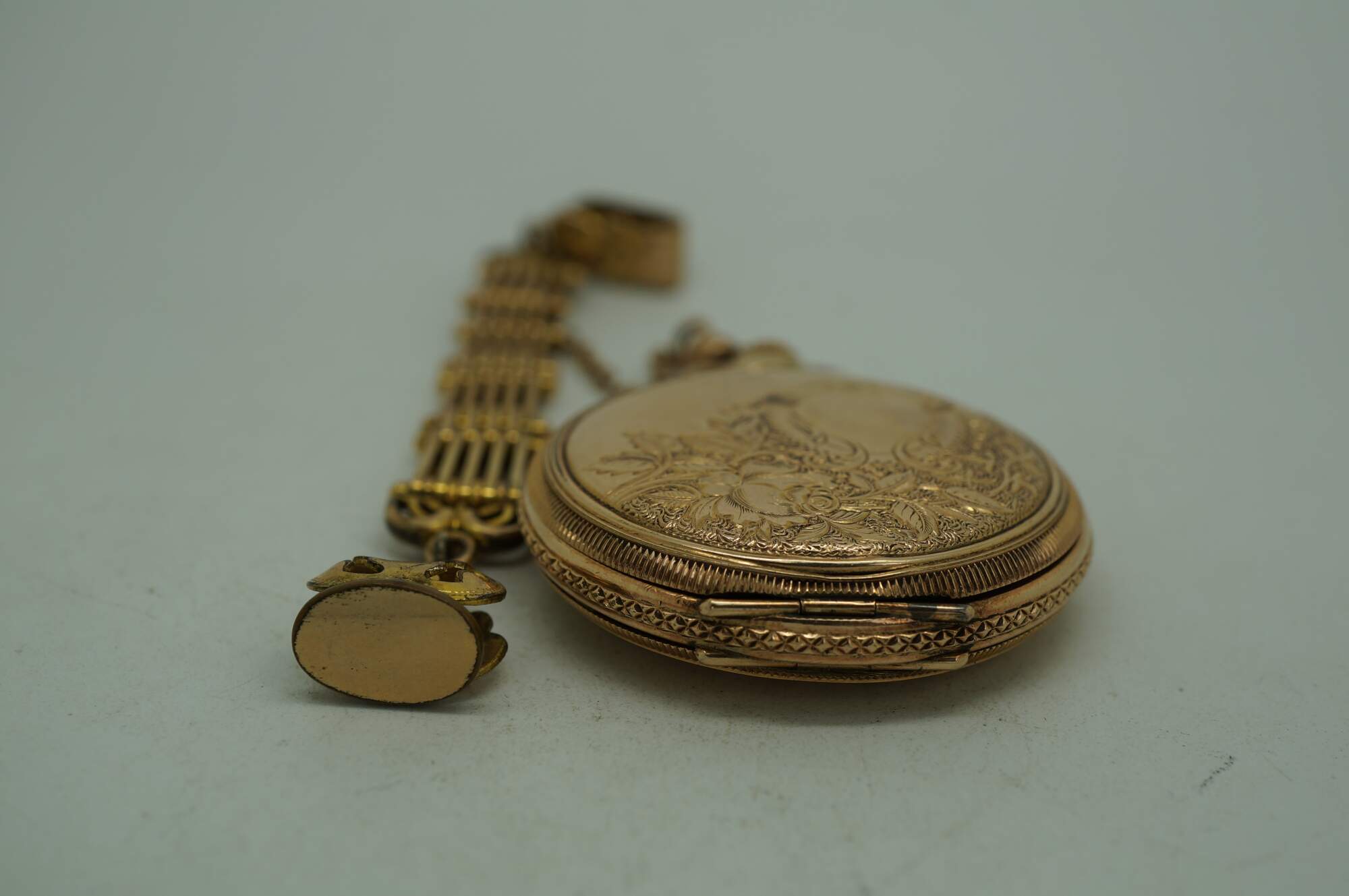 Antique 1897 Waltham hunting-style gold pocket watch. Movement - American Waltham Watch Company - Safety Barrel - 8119314 - Grade Seaside - Model 1890 - 6s - 7 jewels. White face with black Roman numerals, auxiliary dial with Arabic numerals, and iridescent blue hands. Case - Essex - 14K Gold - Guaranteed 20 Years - 757539 - 539. Both sides of the case etched with a rose and foliate frame - one side blank, ready for a monogram, the other side with the engraved image of a small house. S.O.B. & Co chain with attached signet seal fob (blank - no monogram).