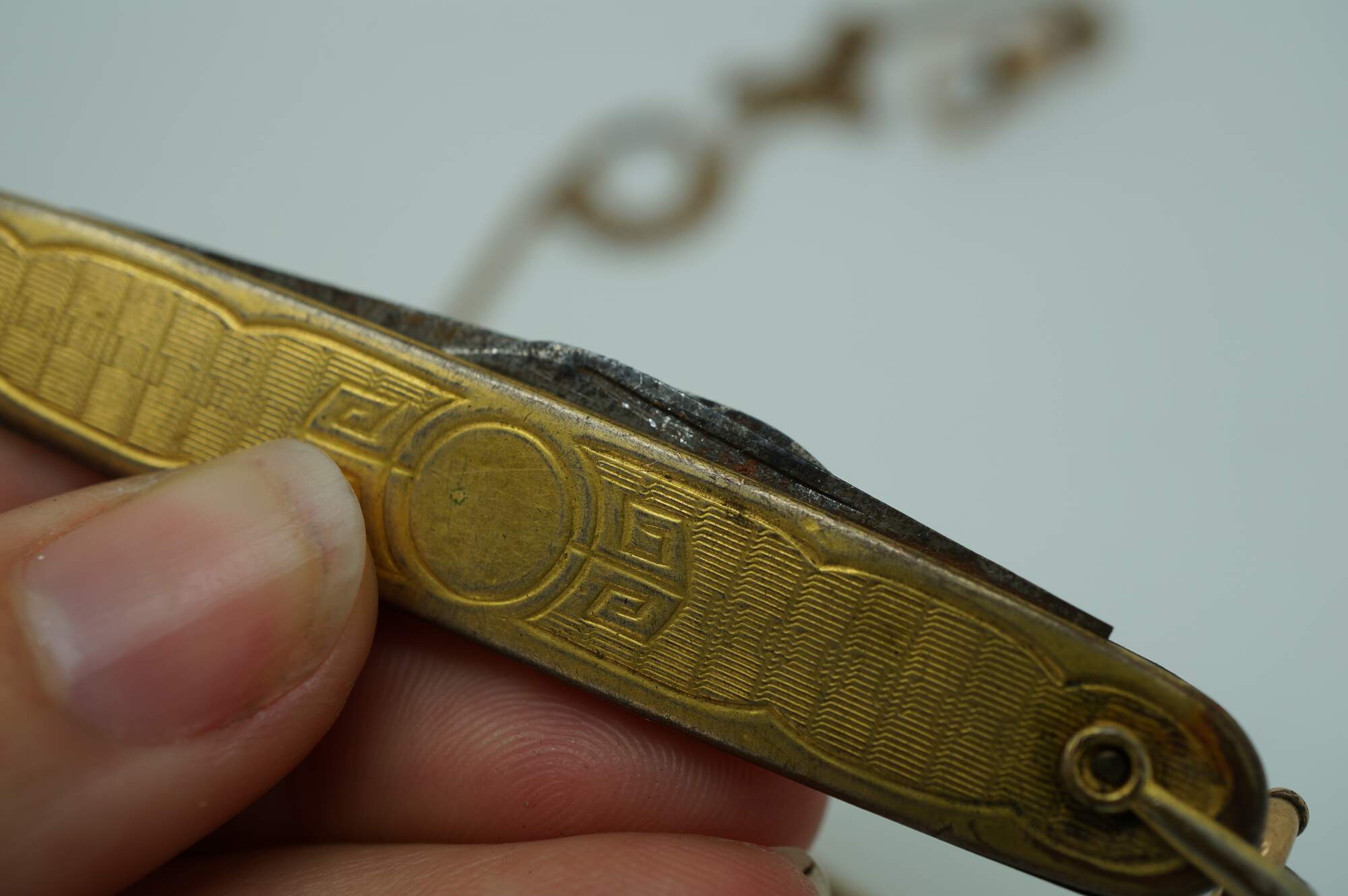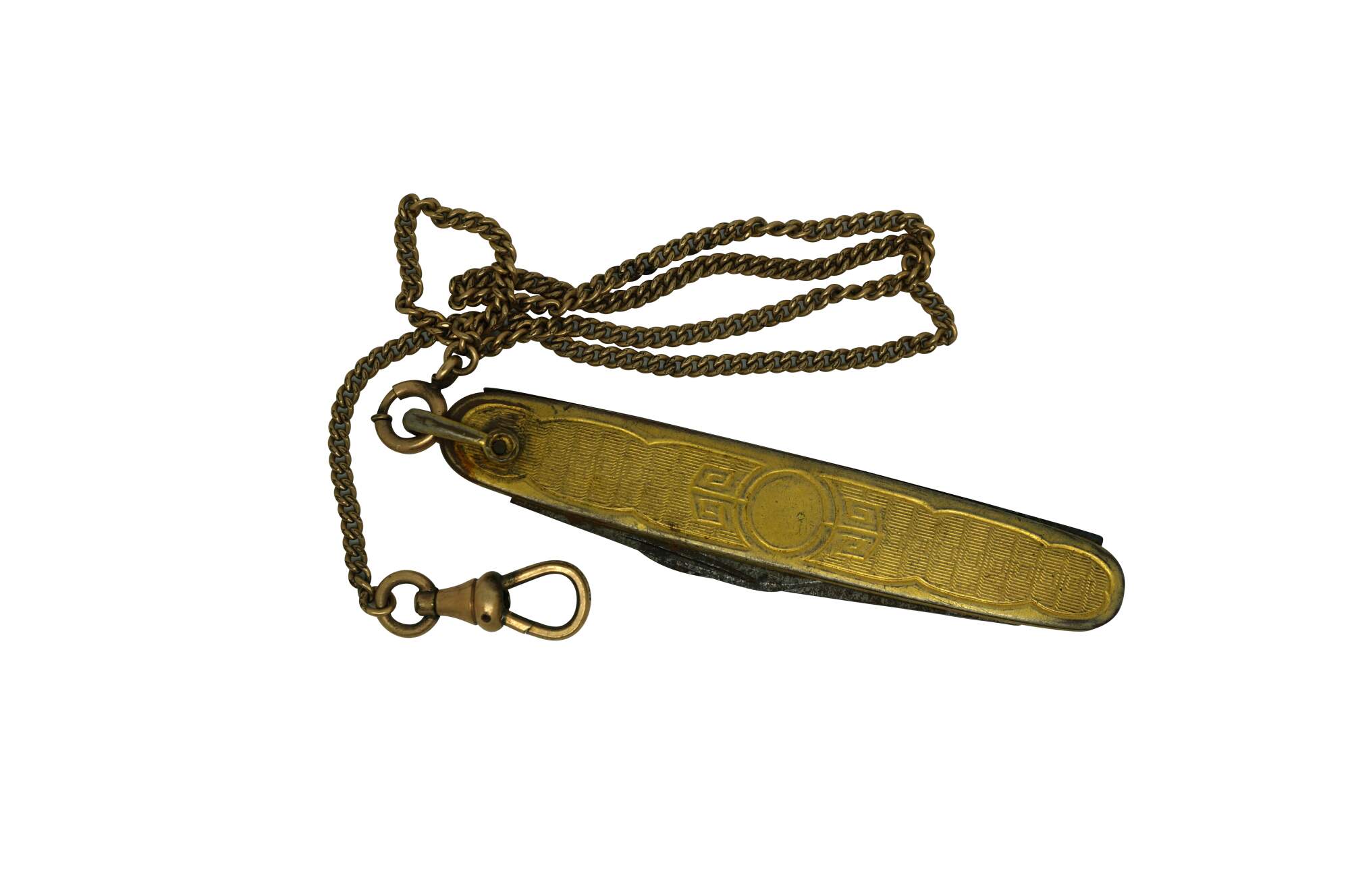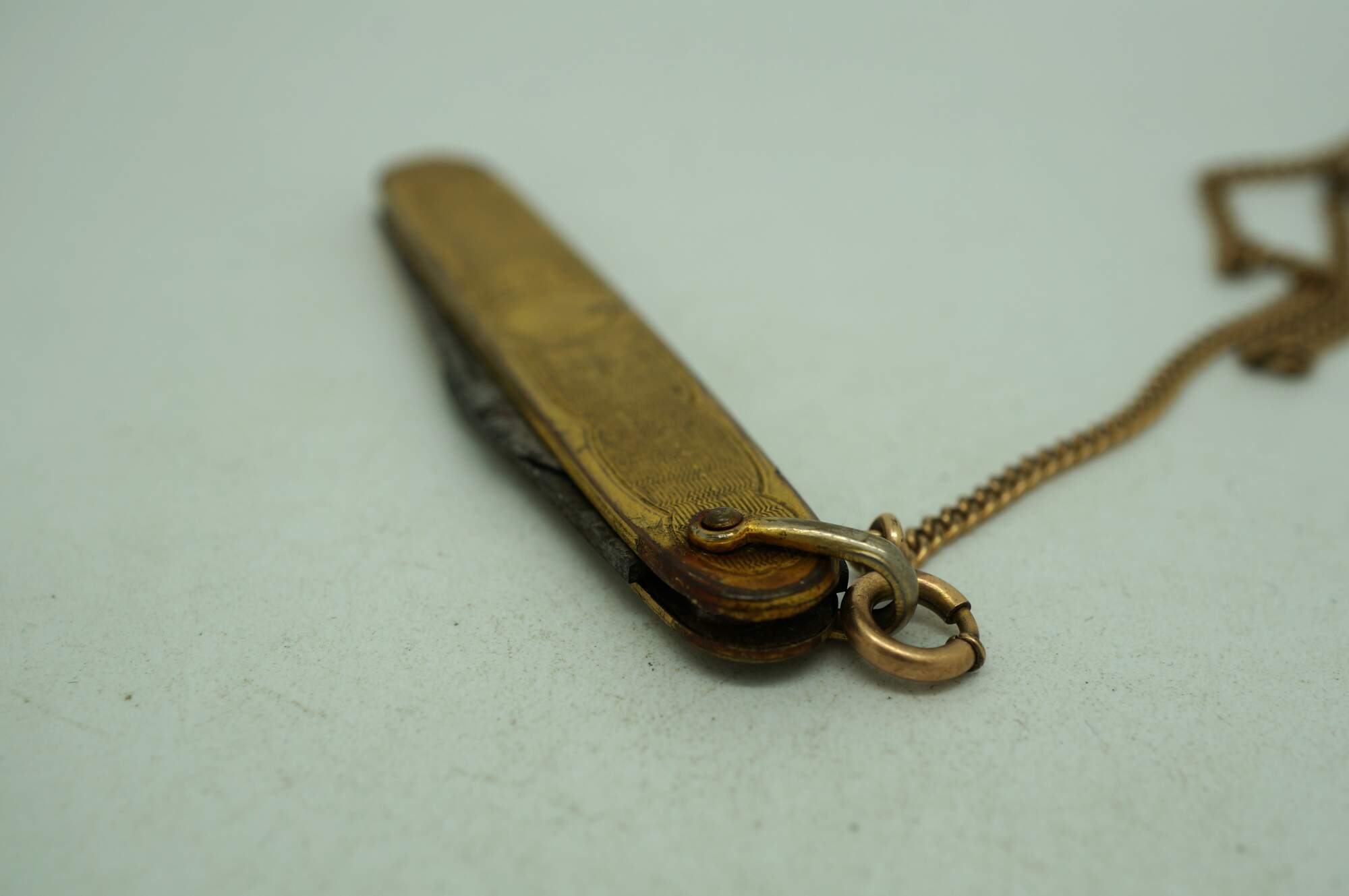 Early 20th century (pre-1920's) gold filled pocket watch curb chain by Bates & Bacon hung with a gilt two blade pocket / pen knife etched with an art deco design.