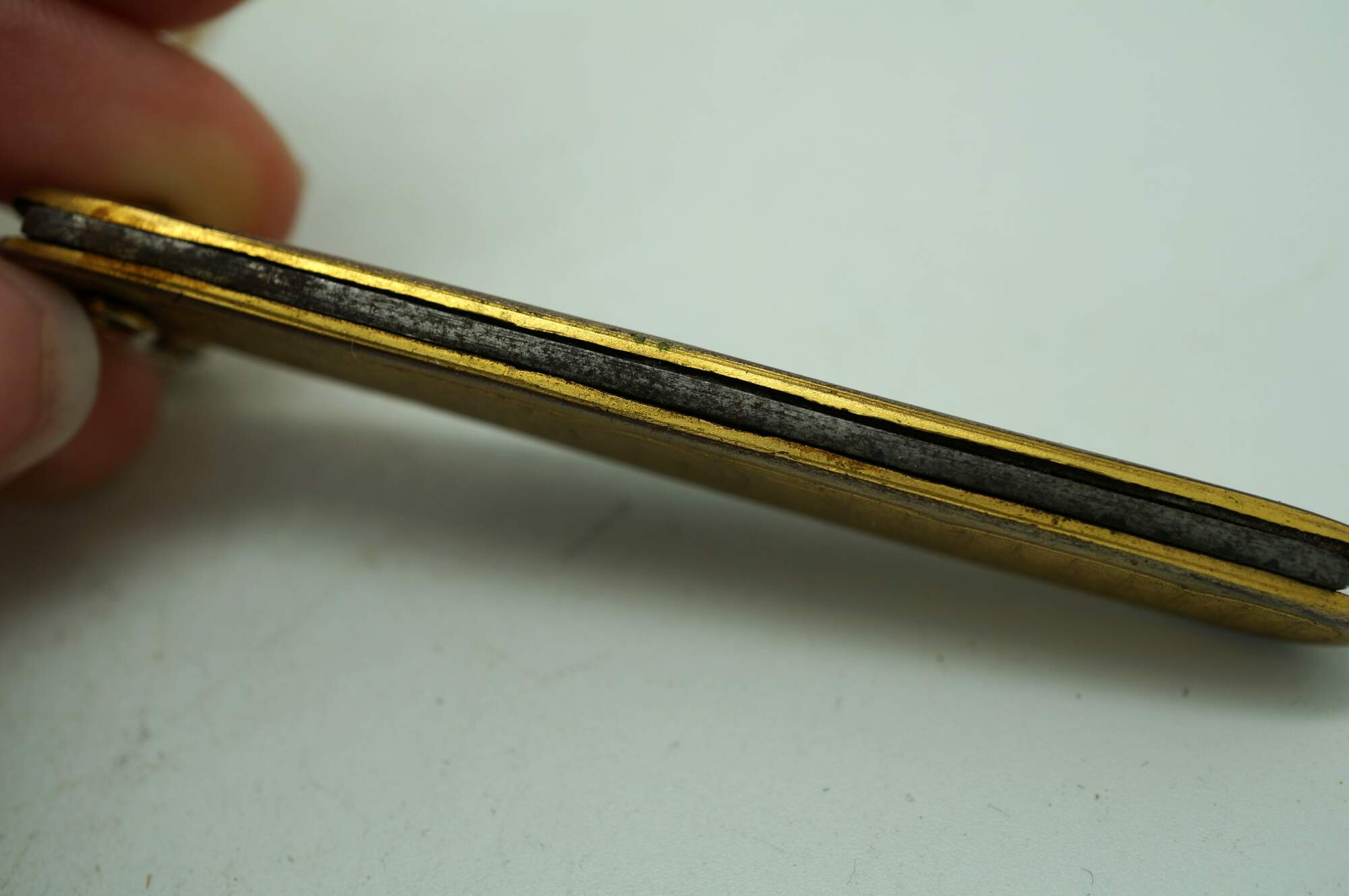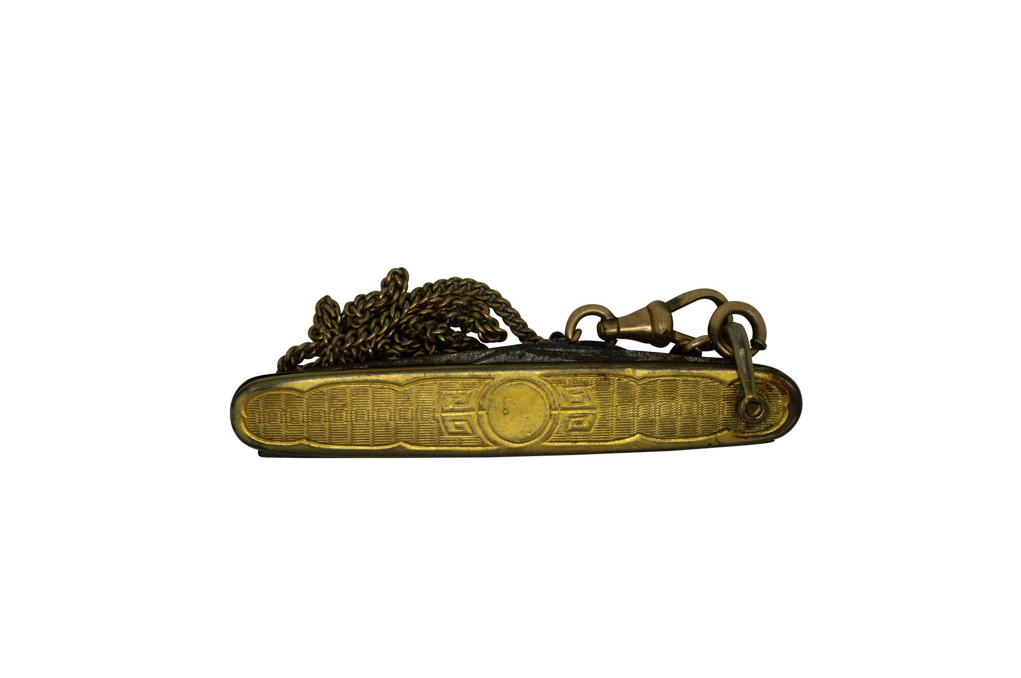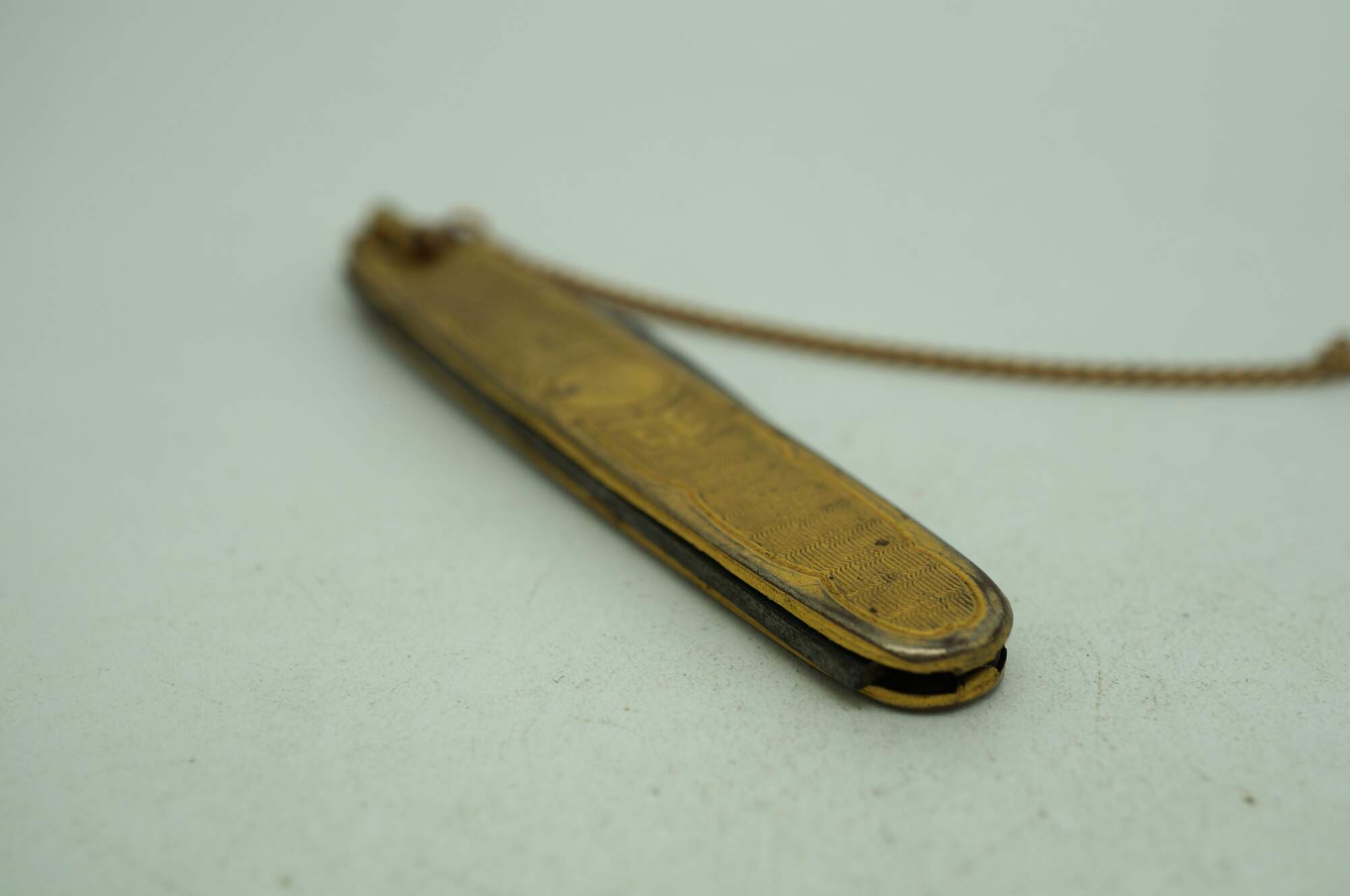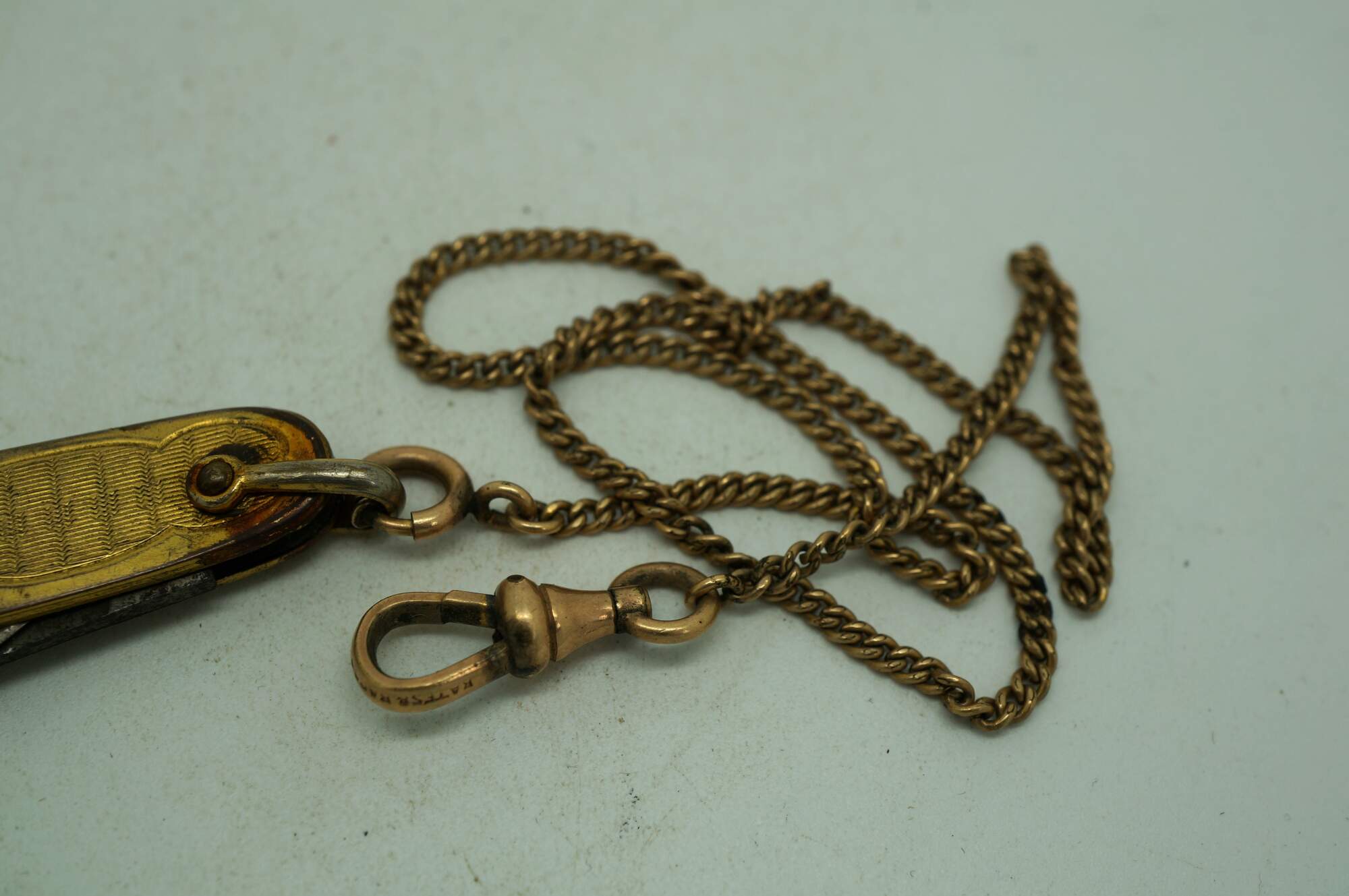 Early 20th century (pre-1920's) gold filled pocket watch curb chain by Bates & Bacon hung with a gilt two blade pocket / pen knife etched with an art deco design.