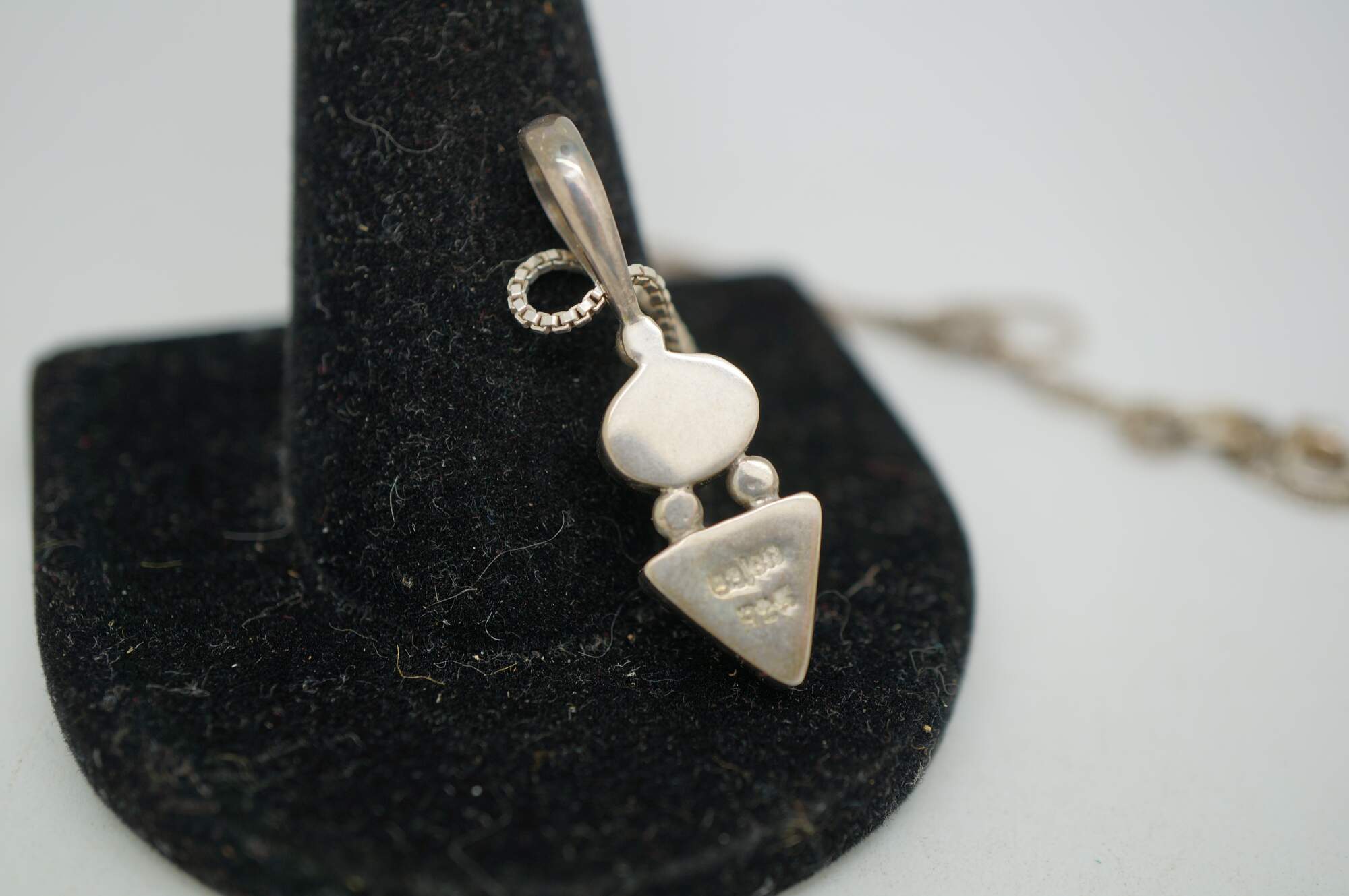 Vintage 925 sterling silver pendant featuring a caboshon of translucent white quartz stacked on a triangular cut blue lapis lazuli. Strung on Italy 925 Sterling silver box chain.