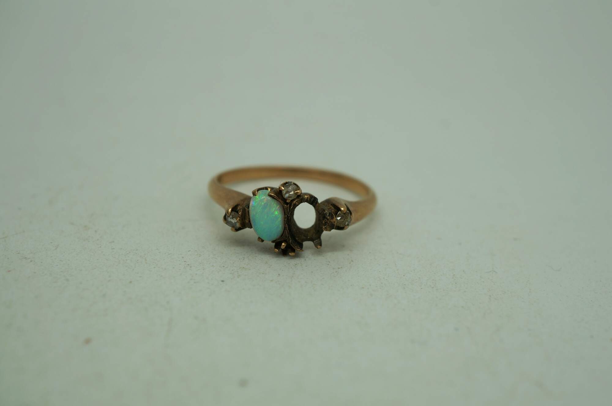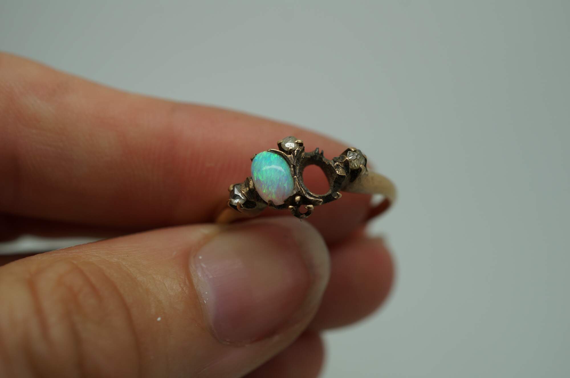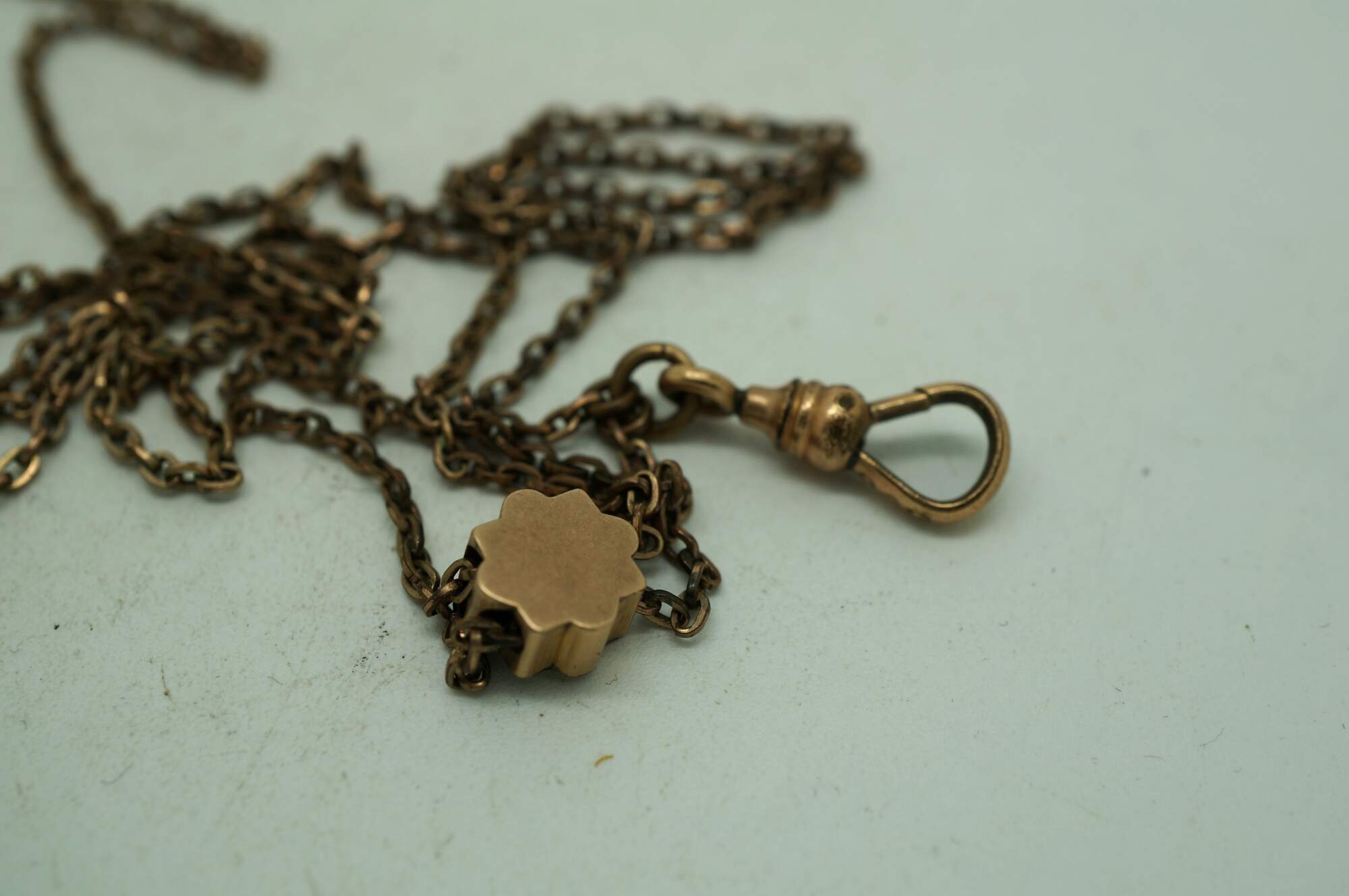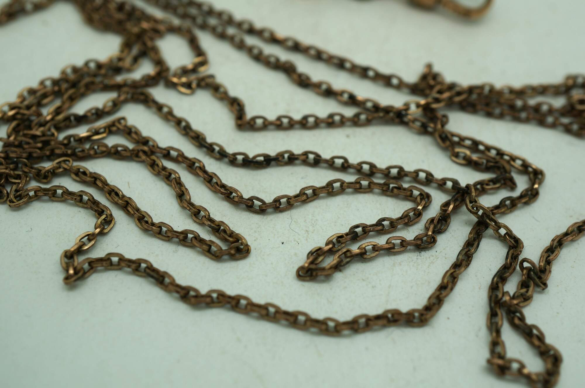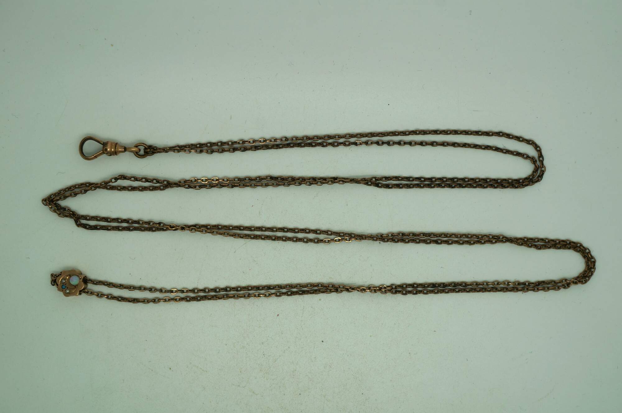 Antique late 19th-century Victorian gold-filled ladies’ watch chain necklace by the Dagget & Clap Company and ring by Dattelbaum & Friedman. Watch chain features a sun and moon pattern slide decorated with an opal, seed pearls, and turquoise cabochons. Ring once held two cabochon opals (now only one) framed on each side with diamond chips.