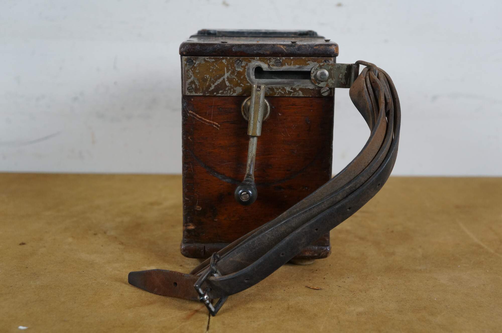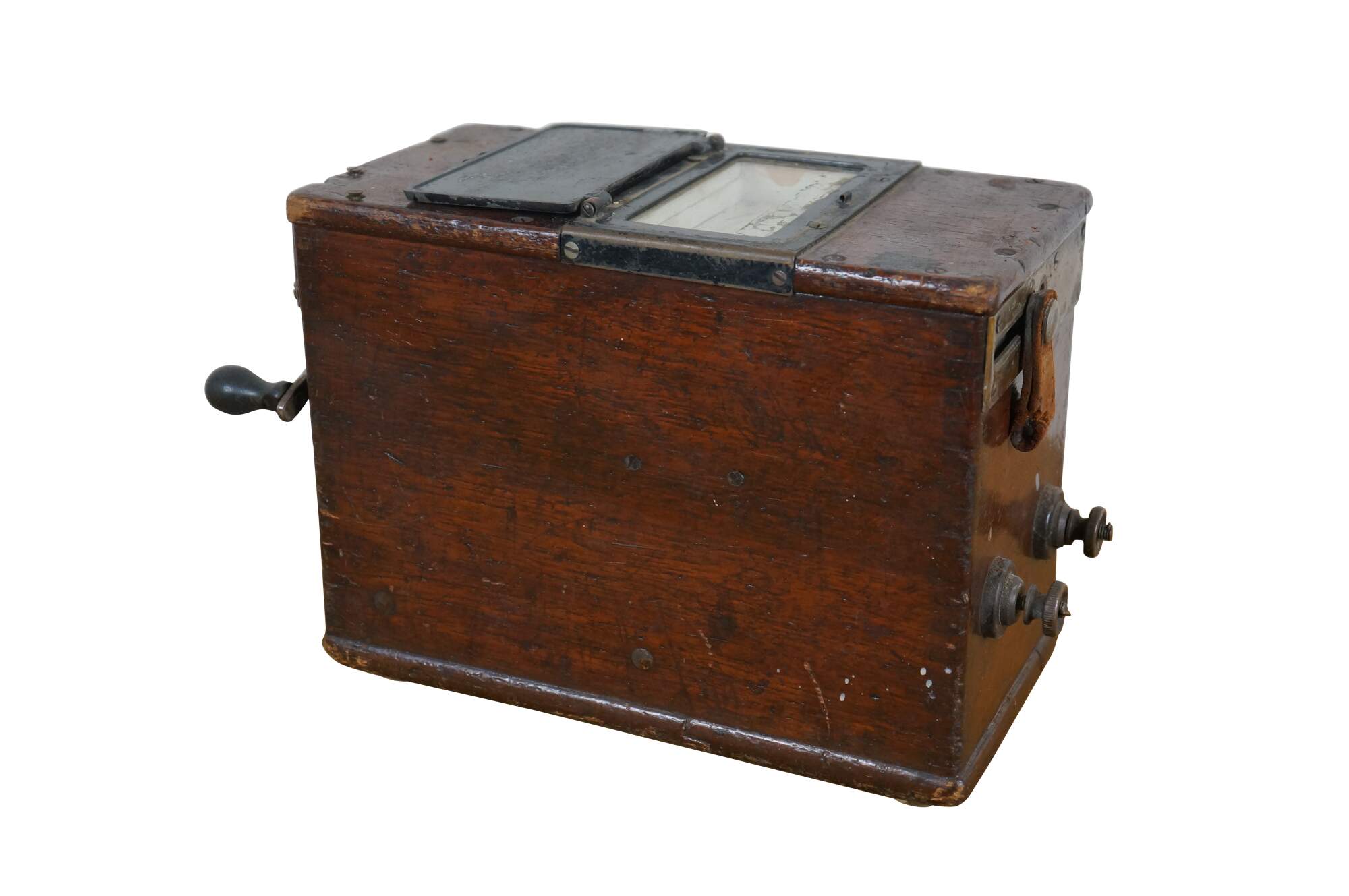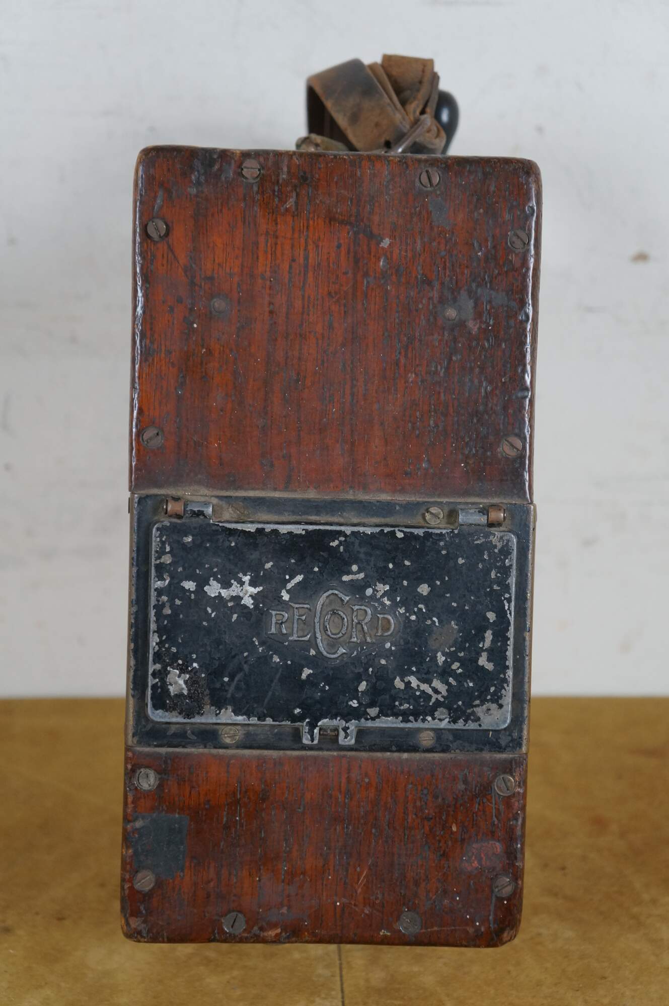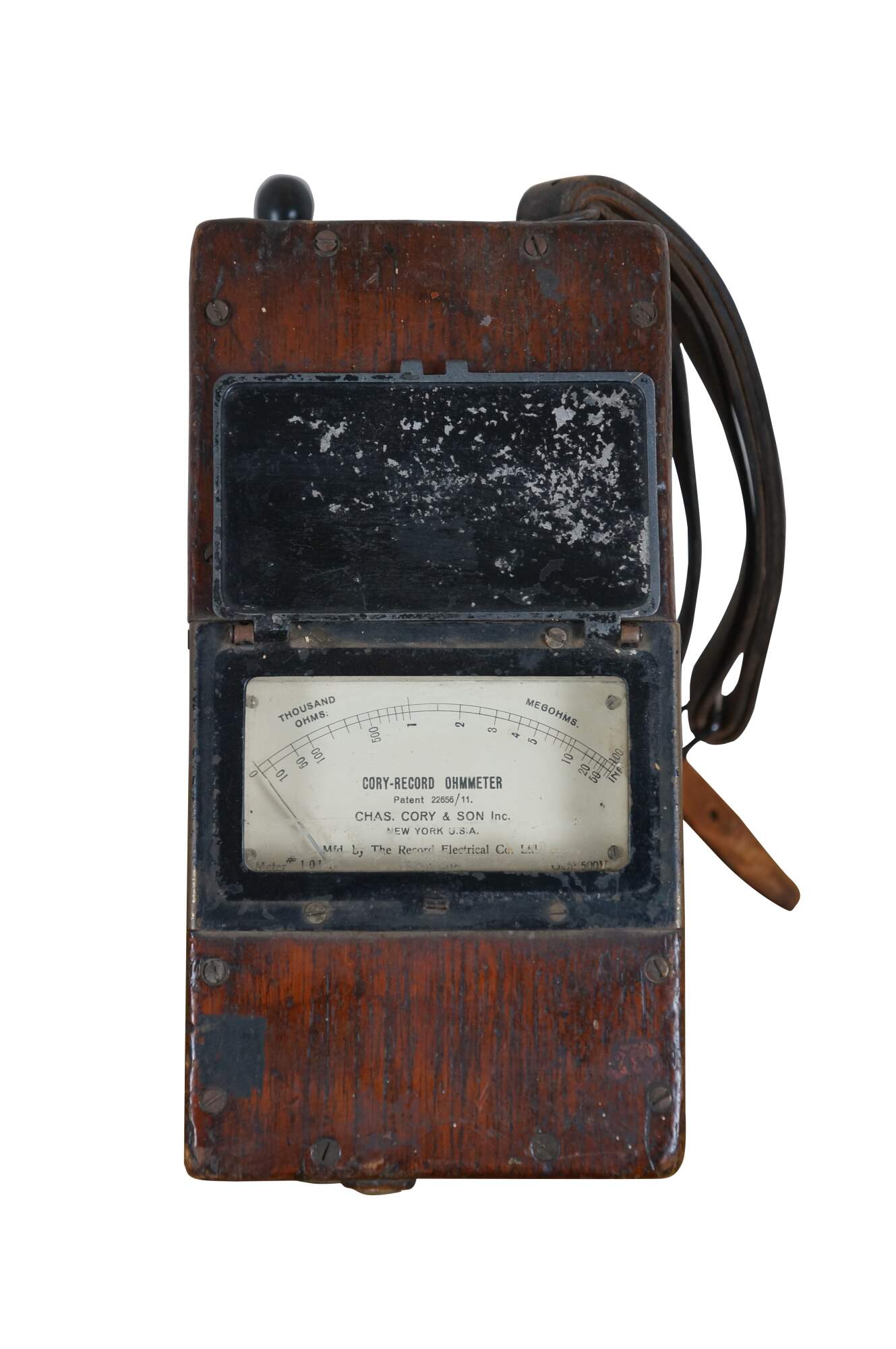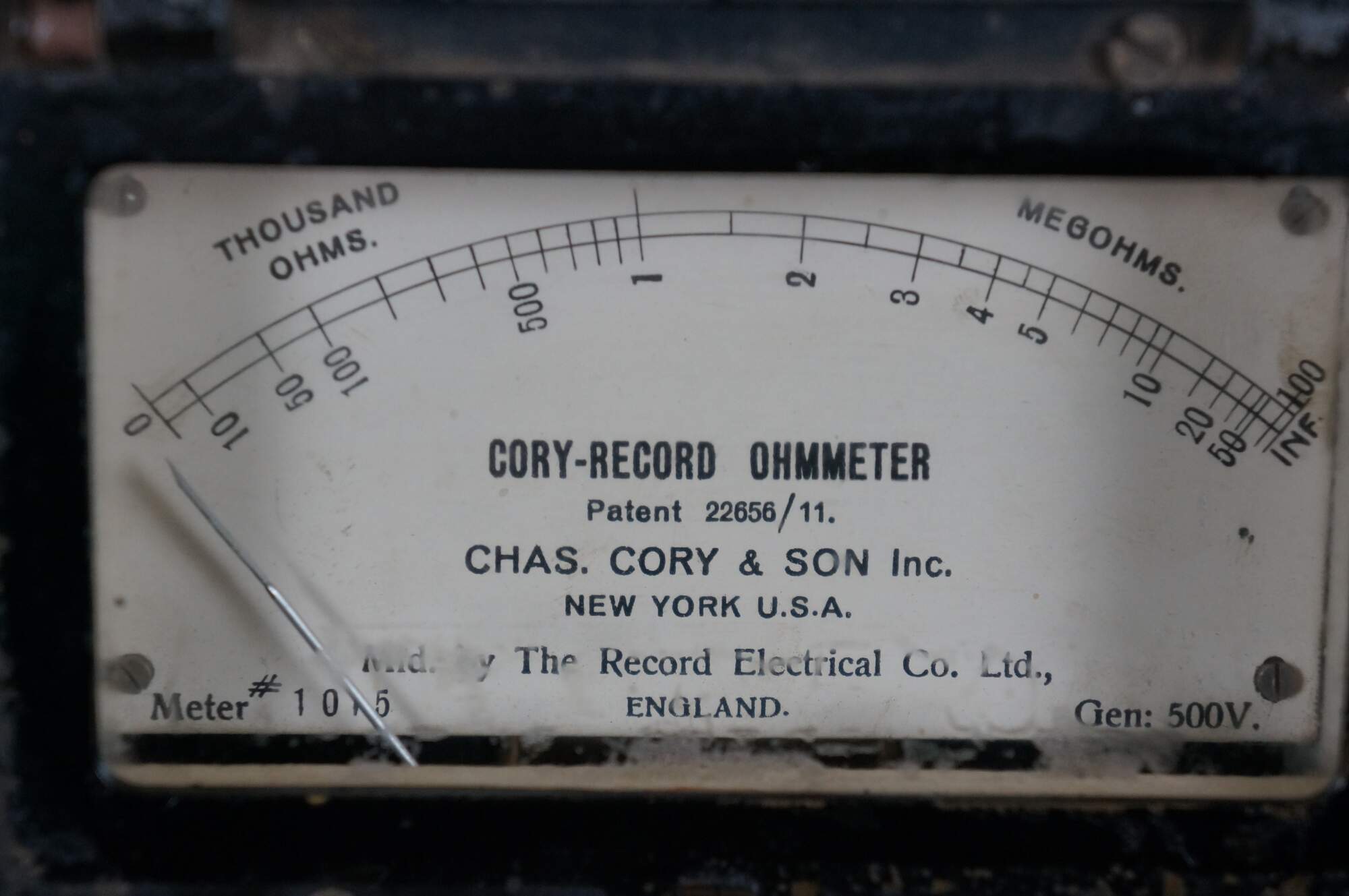 Early 20th century Cory-Record Ohmmeter - Patent 22656/11 - Chas. Cory & Son Inc. New York, USA - Manufactured by The Record Electrical Company Ltd, England - Meter # 1015 - Gen: 500V. Wood case with metal flap over glass front; leather strap.
